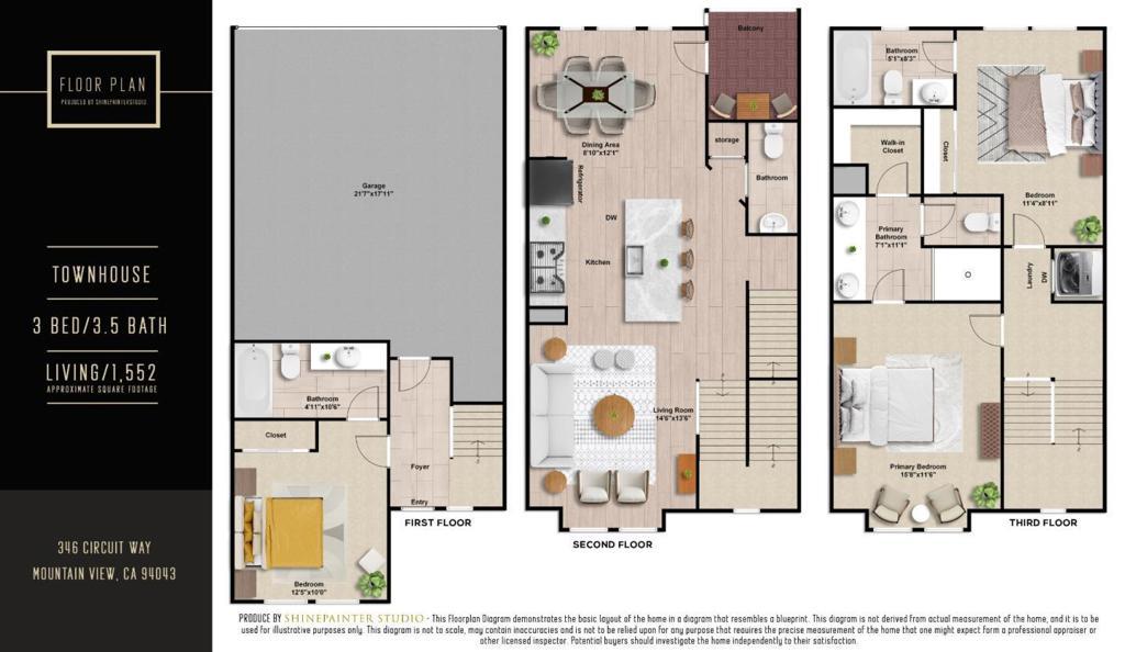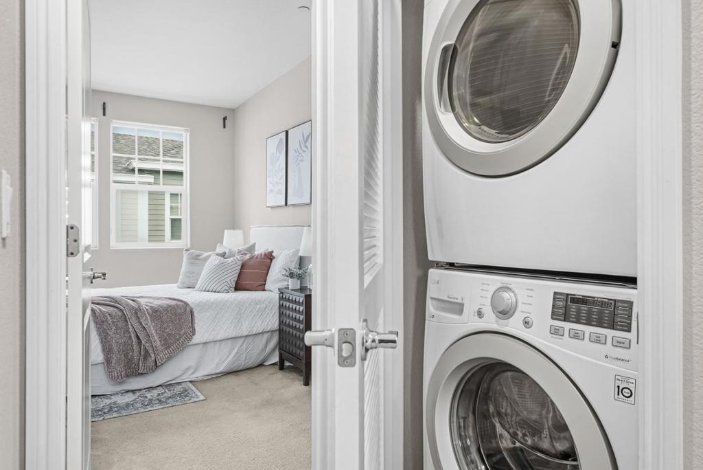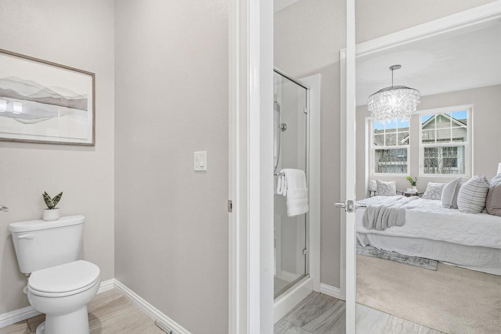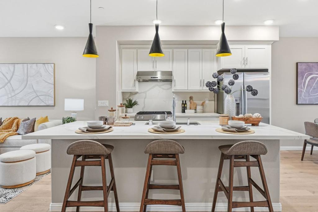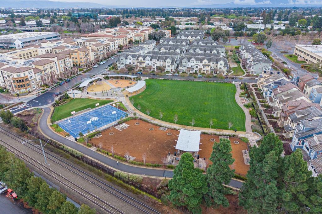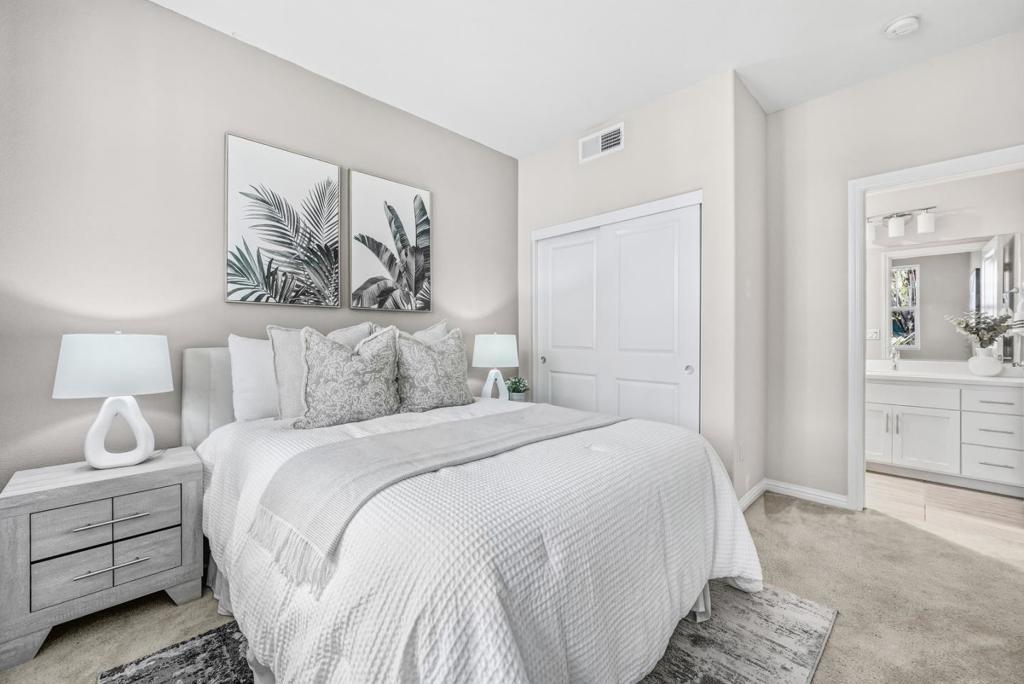 Welcome to this charming 2018-built townhome with three suites in the sought-after Radius at Whisman Station community. A covered front porch welcomes you inside to a ground-floor front-facing suite with an en-suite bathroom featuring a quartz countertop and shower-over-tub. The second level offers an open, light-filled floor plan with a front-facing living room flowing into a modern kitchen with a large island and breakfast bar, highlighted by stylish pendant lighting. The gourmet kitchen has quartz countertops, stainless steel appliances, and ample white cabinetry. An adjacent dining area with elegant lighting opens to a private balcony. A half bathroom completes this level. The third floor has two suites: the primary with a spacious bedroom, pendant light, en-suite bathroom with double vanity, stall shower, and walk-in closet, and another large suite across the hall with an en-suite bathroom with quartz countertop and shower-over-tub. Upper-level laundry with washer and dryer adds convenience. The home includes an attached two-car garage, is close to Pyramid Park, and is near Highways 237, 101, 85, Central Expressway, Downtown Mountain View, Caltrain, Light Rail, and major tech companies. Do not miss this great opportunity!