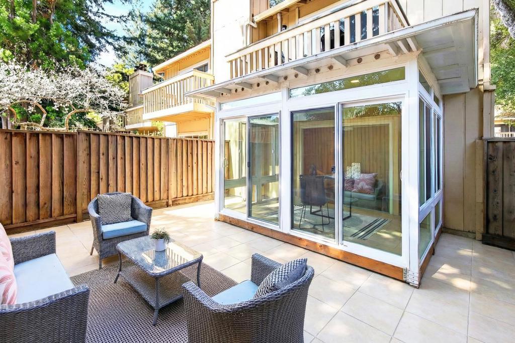 Towering two-story end-unit surrounded by majestic redwood trees, ideally located within a Top-Rated school district and less than two miles from vibrant Downtown Mountain View, known for its lively farmers market, acclaimed dining, shopping, plus convenient Caltrain and light rail access. Inside, the home features laminate flooring, high vaulted ceilings on the second story, recessed lighting, and central heat/AC. The well-appointed kitchen offers stainless steel appliances, granite countertops and a charming bay window that fills the space with natural light. Each bedroom includes its own en-suite bathroom, while the primary suite boasts a spacious walk-in closet with custom organizer and a relaxing sunny balcony. Additional highlights include a generous one-car garage, bonus sunroom leading to a private patio perfect for entertaining or relaxing, and access to a serene community pool. Ideally situated near major tech campuses including Apple, Google and LinkedIn, with easy access to Highways 85, 101, 237 and central expressway, this home perfectly blends lifestyle, convenience and location. Do not miss your chance to own this towering treasure. It will go FAST!