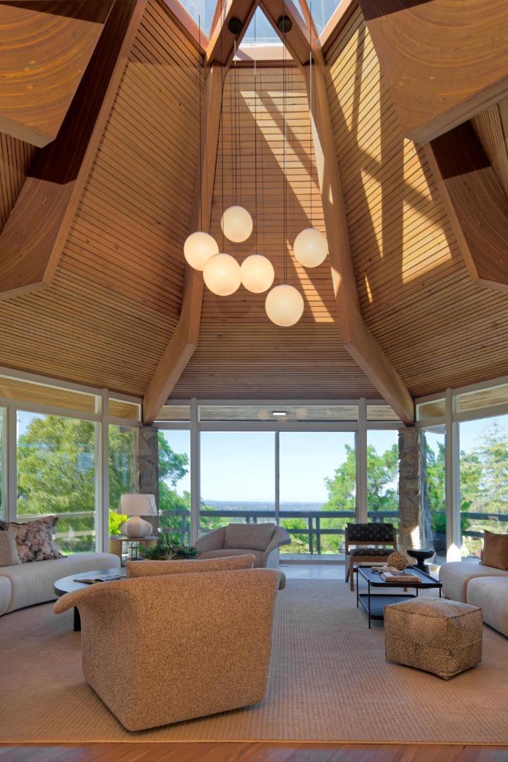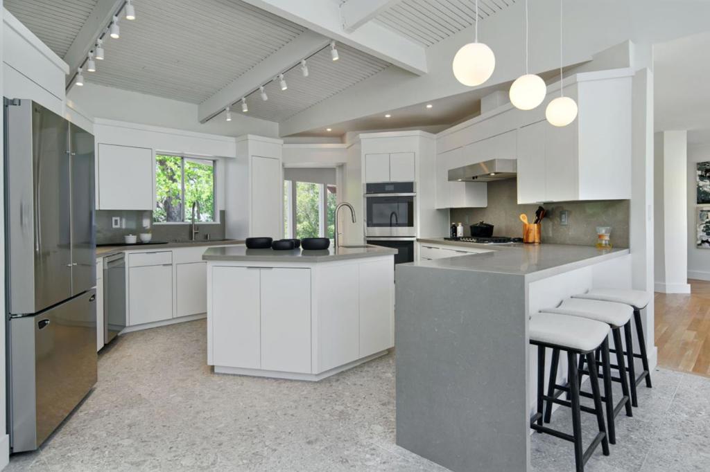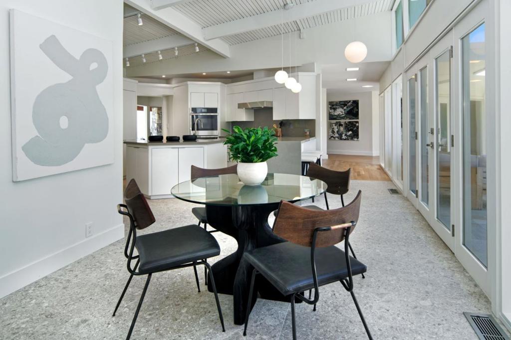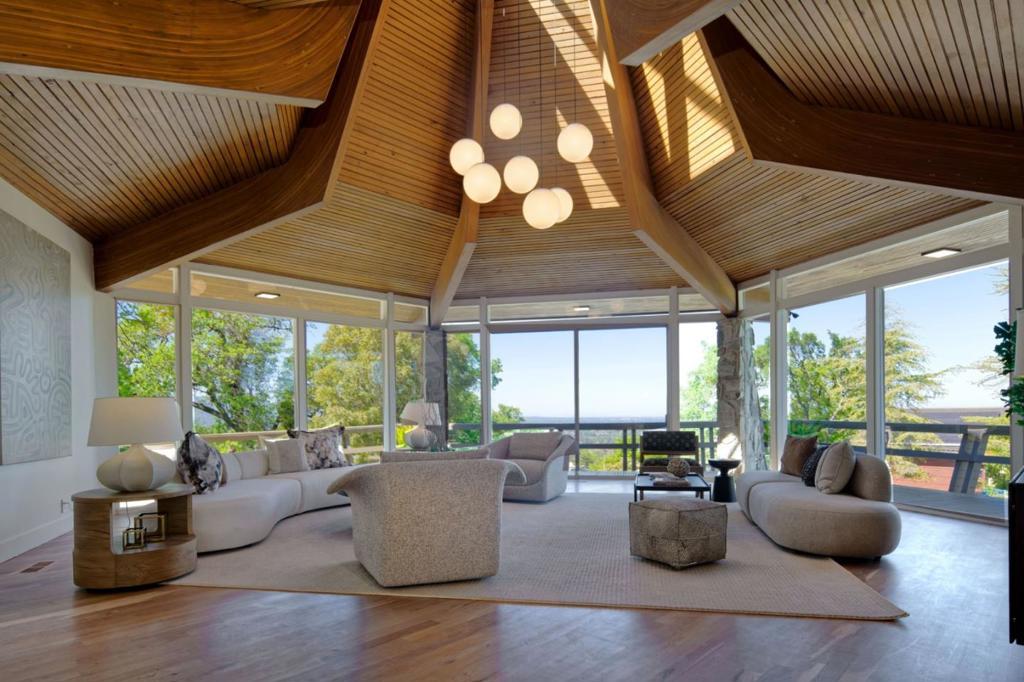 First time offered following a total transformation, this profound California Modernist statement occupies a rare knoll-top pinnacle. With 270-degree views impossible to replicate, the estate sits at a quiet terminus with no drive-by traffic. The structural soul is a hexagonal pavilion utilizing a "spoke-and-hub" plan. A soaring, timber-clad pyramidal ceiling with a hexagonal oculus transforms the Great Room into a sundial, while free-form lighting counterbalances the post-and-beam drama The kitchen is a high-performance pivot point for family and hosting. Large-format glass sliders create seamless connectivity to the pool deck. Outfitted with all-new professional appliances and waterfall quartz counters, the space is grounded in Italian porcelain tile. The single-story layout allows outdoor access from almost every room. Wraparound terraces capture vistas from the SF skyline to the Santa Cruz mountains. Due to the topography, the home and rear grounds remain entirely invisible to neighbors and the street. Unified by American Cherry flooring, the interior features floating vanities, a paneled library with a period bar, and a dining room with custom built-ins. The estate includes a detached yoga studio, solar-integrated roofline, and comprehensive landscape lighting.