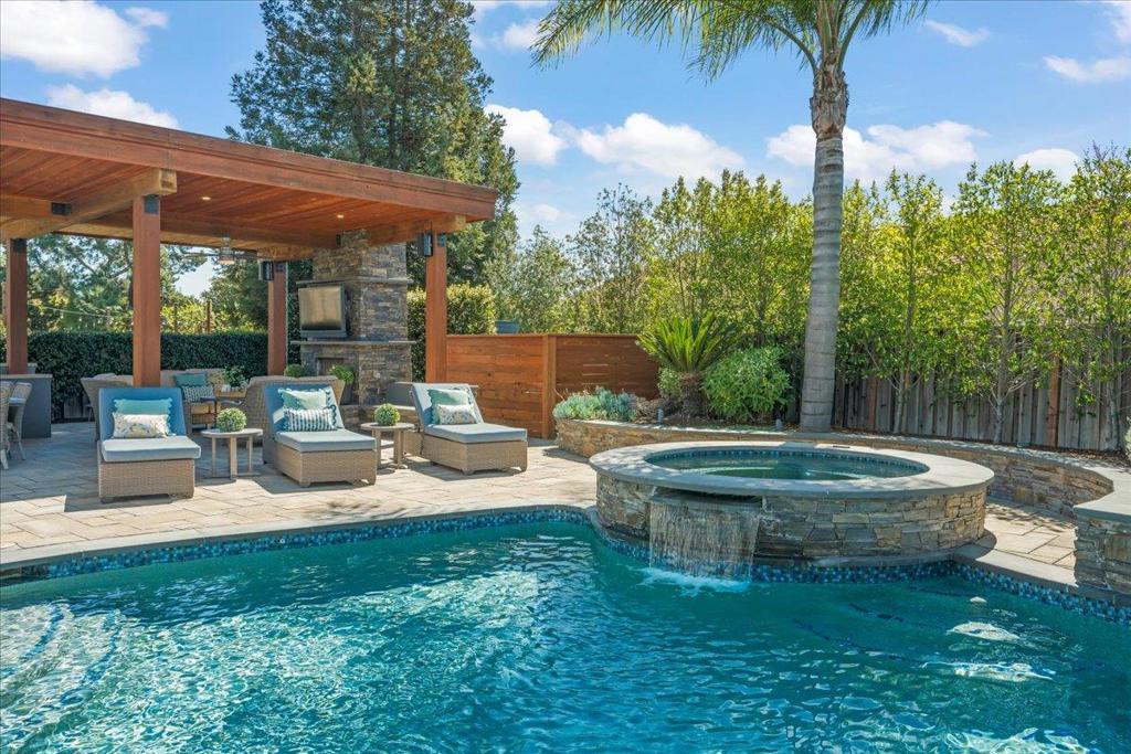 Experience exceptional indoor-outdoor living in this beautifully upgraded home. The incredible backyard is a true retreat, featuring lush landscaping and night lighting for enjoyment into the evening. An elegant bluestone and paver hardscape, bocce court, fire pit, and a fully equipped outdoor kitchen with BBQ, expansive counters and ample seating are a delight. The covered entertainment area with outdoor fireplace and TV creates the perfect setting for year-round enjoyment. The renovated Pebble Tech pool and spa are the perfect addition to this large, private yard, offering space to relax or entertain with ease. Inside, a contemporary design showcases a spacious living and dining room. The kitchen, with granite counters and stainless appliances is open to a light and bright family room with fireplace. Renewal by Andersen windows enhance comfort and efficiency, while owned solar supports both the home and pool. Modern Lutron Caseta lighting adds convenience throughout. The luxurious primary suite is an exceptional large room with three walk-in closets. Spacious secondary bedrooms provide flexibility. Completing the property is an impeccably finished 3 car garage with EV charger, so refined it feels like an extension of the home.