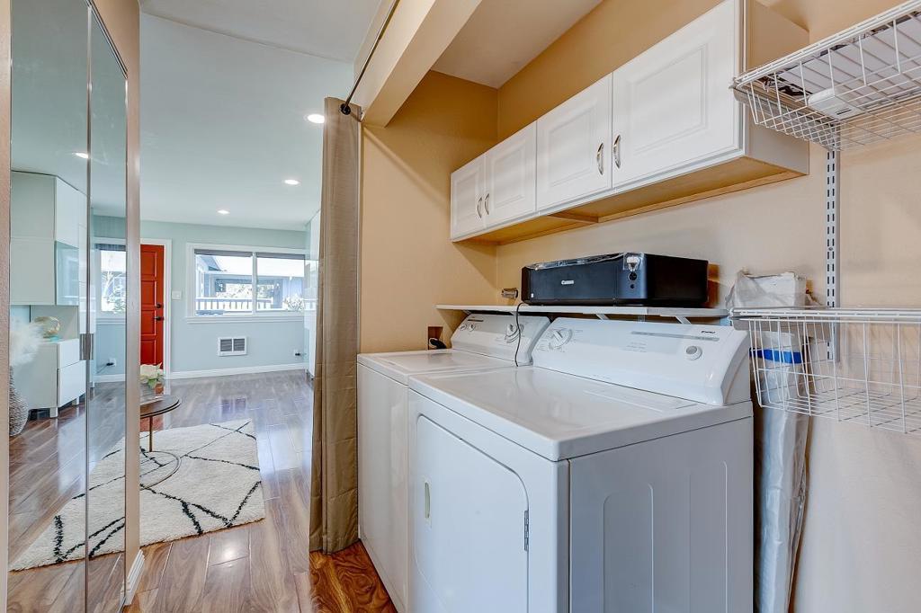 Updated 1 BD condo located between San Tomas/Lawrence off of Homestead! Unique to this one-of-a-kind floor plan are large windows in the dining/living areas and only 1 shared wall. end-unit condo with gleaming laminate floors and newer recessed lights throughout. New interior paint.newer curtains, newer toilet.newer faucet in bathroom, newer kitchen sink .a custom floor-to-ceiling designer cabinet, dual pane windows, and mirrored closet doors. Gourmet kitchen has quartz countertops, stainless steel appliances and sink, elegant white cabinets and tile floors. bath has dual sinks with quartz countertops, white cabinetry, a large walk-in shower surrounded tiles, and luxurious tile floors. In-unit washer and dryer, AC, one covered stall parking spot, and community gym. Blocks from shopping, restaurants, Central Park, and library. Near the biggest tech companies - Nvidia, Apple Minutes from Kaiser, Valley Fair, and Santana Row.