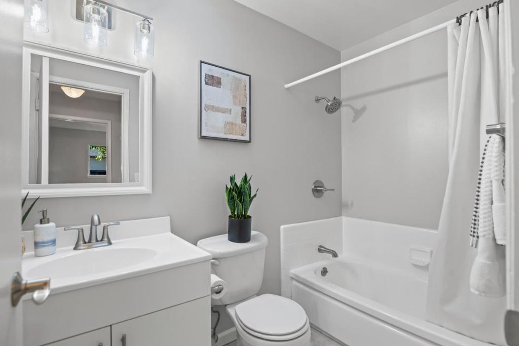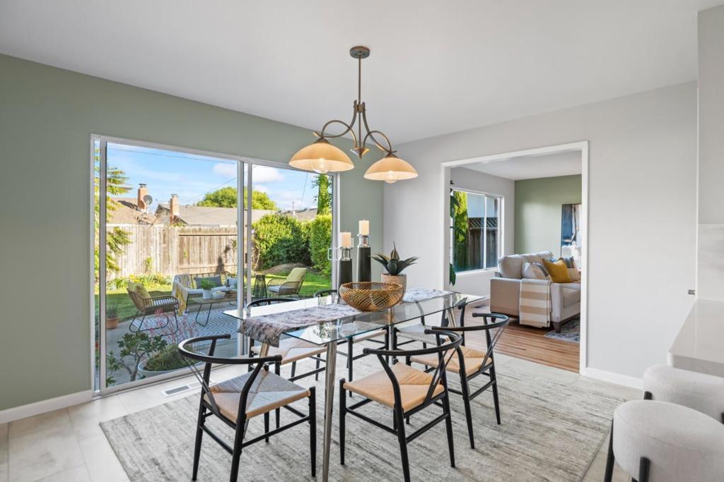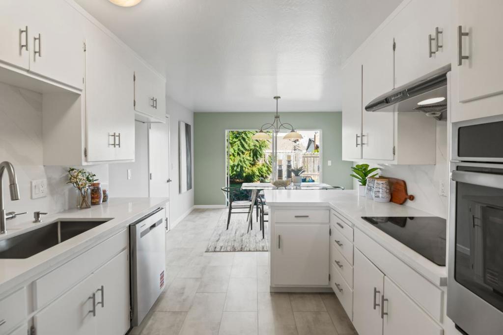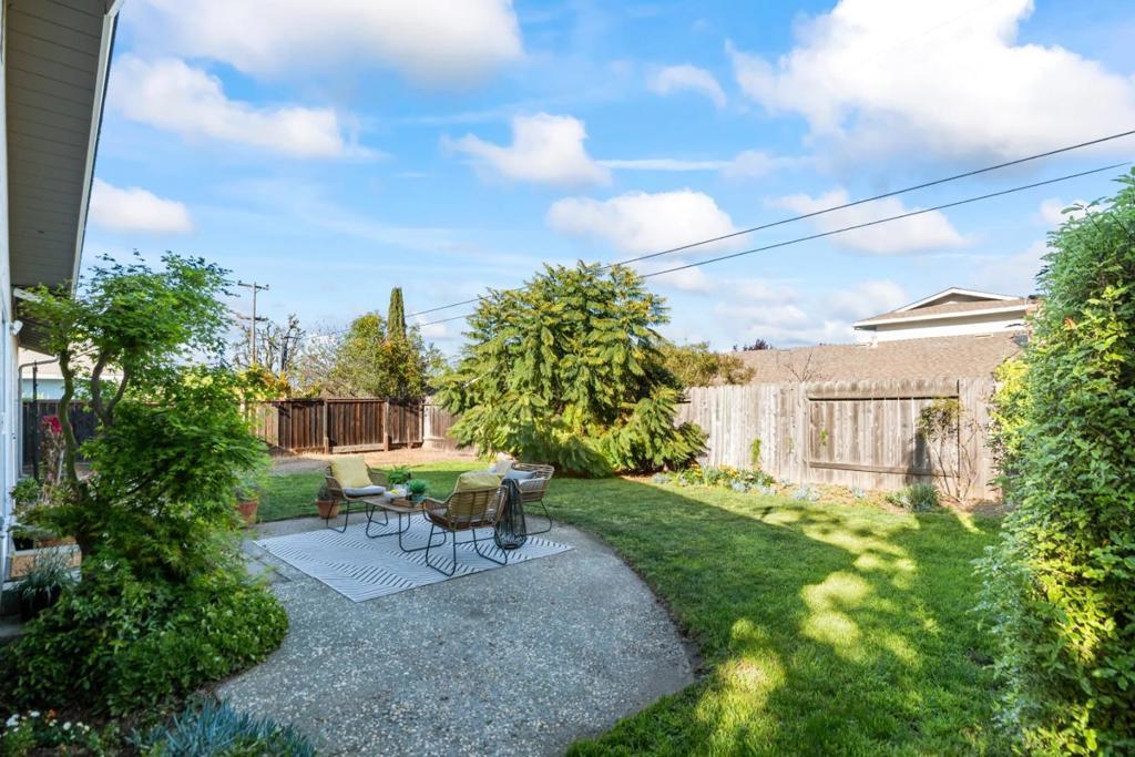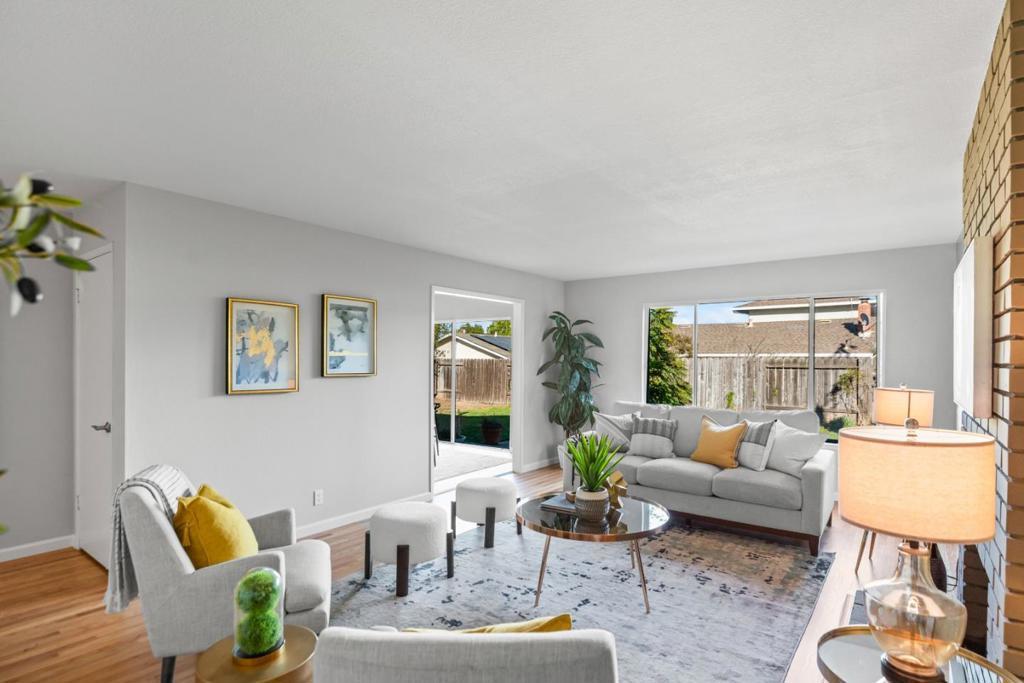 Light-filled home with modern updates & fantastic location just 0.4 miles to Apple Spaceship Campus! Cook up scrumptious meals in the kitchen with new quartz countertops with full backsplash & fresh white cabinets accented by stylish hardware. A peninsula with seating is perfect for more casual meals, while the adjacent dining room has a sliding door that lets natural light stream in. Wide windows & tasteful accent walls add warmth & character while sparkling hardwood floors extend through the living room, hallway, & bedrooms. A skylight in the hall bathroom fills both the bathroom & hallway with natural light, enhancing the homes bright, airy feel. Plus, owned solar panels help reduce bills & carbon footprint! Outside, delight in a paved seating area & lush lawn ideal for relaxing or entertaining. Two stunning bougainvillea & other mature plants add bursts of color when in bloom. Enjoy a prime Silicon Valley location in this quiet neighborhood close to major tech employers, convenient thoroughfares for commuters, scenic parks, delicious restaurants, & high-end amenities. Plus, students have access to excellent schools in Laurelwood Elementary with a new modern learning campus scheduled to open Fall 2026, Peterson Middle, & Wilcox High (buyer to verify)!