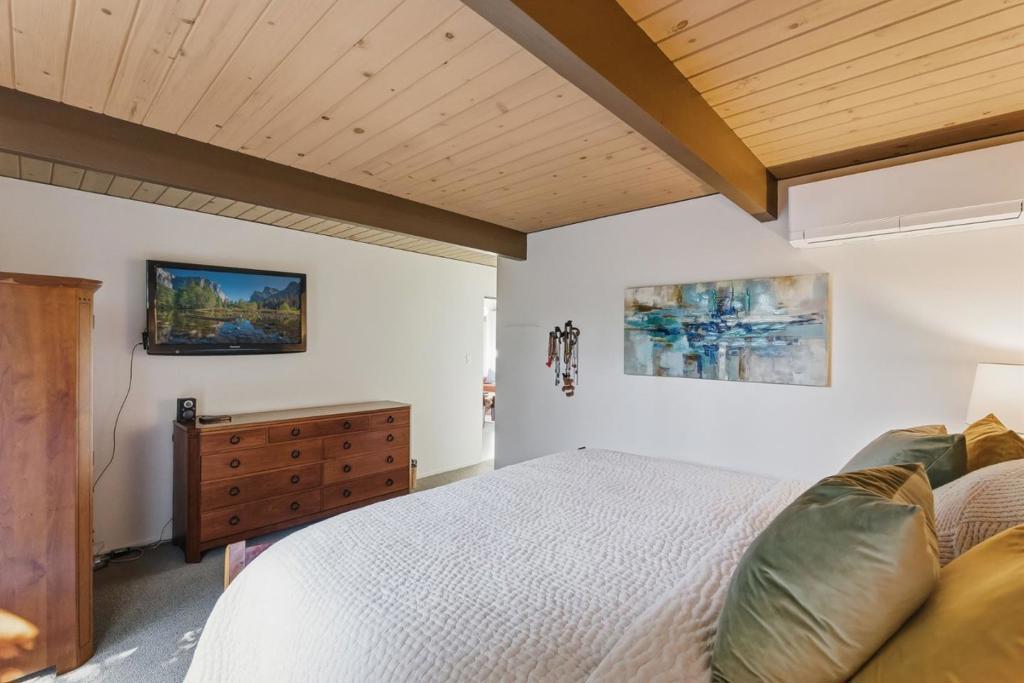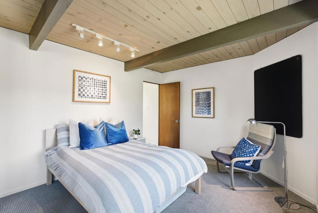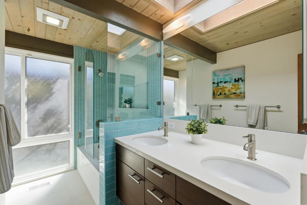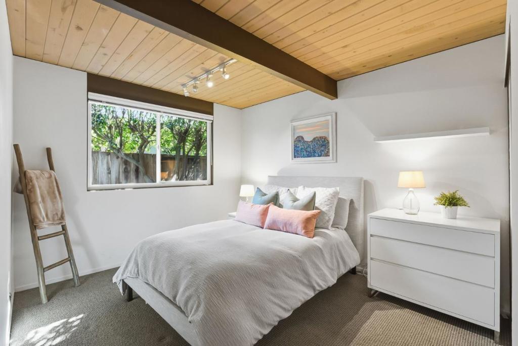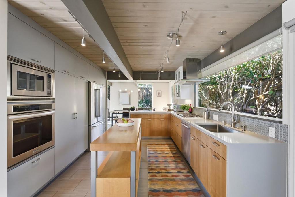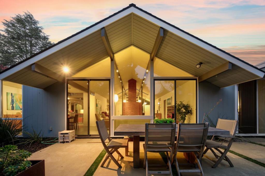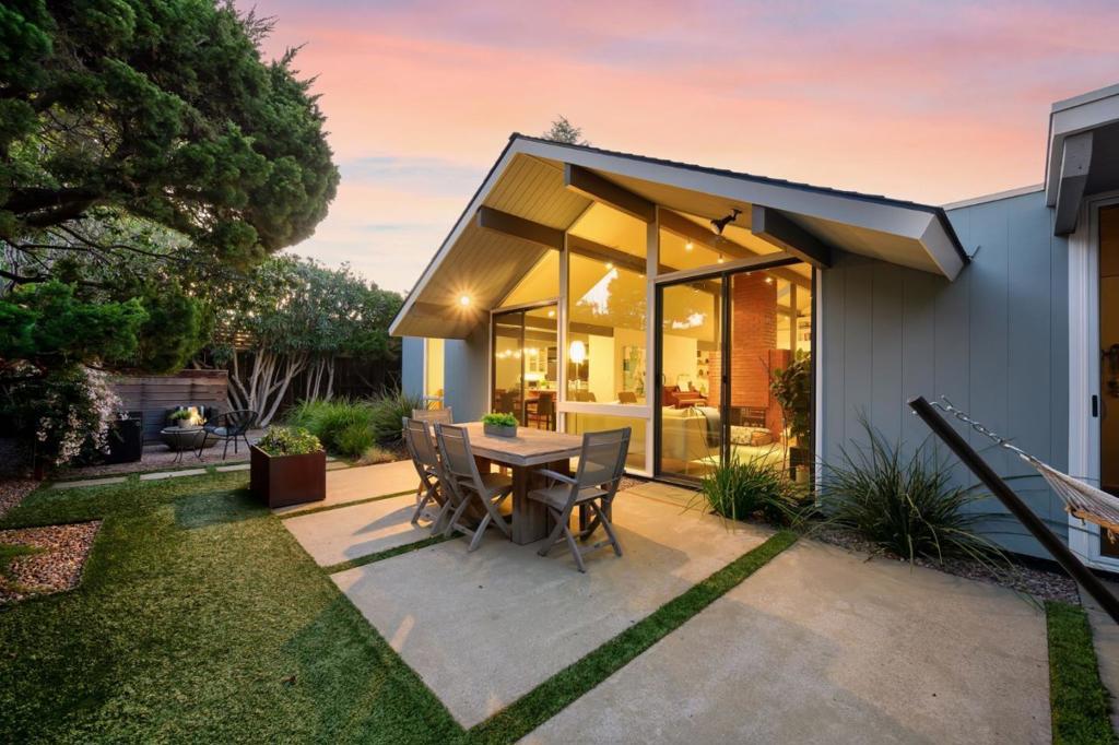 Unique Claude Oakland-designed Eichler blends iconic mid-century architecture with refined modern upgrades. Distinctive Bell Meadows Neighborhood! Signature post-and-beam construction, globe lighting & walls of glass create a bright, open atmosphere, complemented by high-end finishes & contemporary design. Light-filled living, dining & family room spaces features dual see-thru fireplace, skylights, vaulted ceiling & back patio access. Gourmet remodeled kitchen features custom cabinetry, quartz countertops, tile backsplash, butcher block island, gas cooktop, modern lighting & premium stainless appliances. The primary suite serves as a private retreat with direct backyard access & a spa-inspired bath with dual vanity & frameless glass shower with floor-to-ceiling tile. Three additional bedrooms share a beautifully updated hall bath. The low-maintenance yard is designed for entertaining with concrete patio, fire pit & built-in privacy fencing accented by a vertical garden surrounded by lush landscaping. Additional highlights include indoor laundry, oversized two-car garage & storage loft. Centrally located near downtown Mountain View & Blossom Valley Plaza, top-rated schools, & major commute routes. This home offers timeless design and modern comfort in a highly desirable setting.