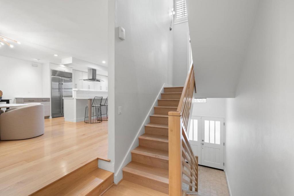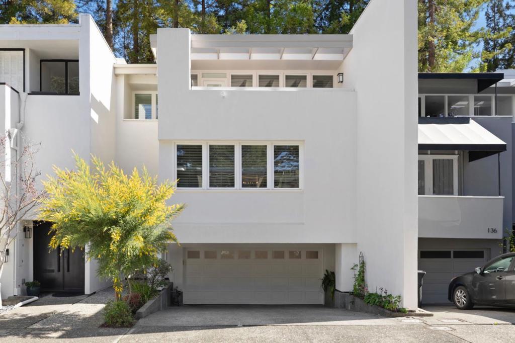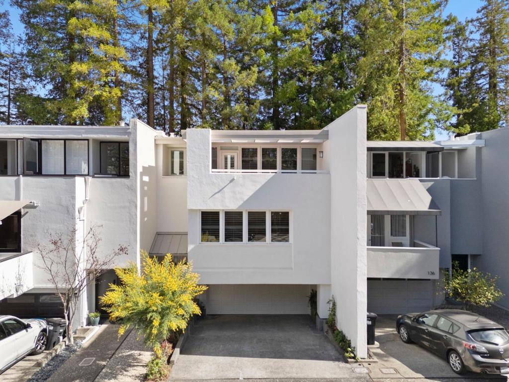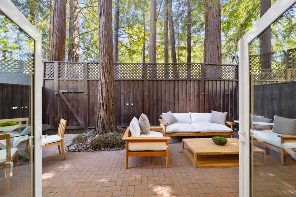 Modern sophistication meets natural serenity in this special enclave in Menlo Park. The open-concept main floor features a renovated kitchen equipped with Sub-Zero, Thermador, and Bosch appliances, flowing seamlessly into the family room and dining areas offering a wonderful flow.The dining area, features custom built-ins and a wine fridge, as well as offering a stunning and unique birds-nest perspective over the formal living room below. This dramatic, double-height living space is anchored by a floor-to-ceiling glass wall, providing a quiet and immersive view of the redwood-studded patio. The private quarters are equally refined, featuring a primary suite with a dedicated balcony and a beautifully updated ensuite bathroom with soaking tub. Two additional bedrooms share a hallway bath with a dual-sink vanity and stone counters. Recent owner upgrades include double-pane windows for sound and climate control, light hardwood floors, and custom California Closets throughout. This home includes a 220V EV-ready garage and a professional Culligan water system. Located blocks from the newly developed Springline, Santa Cruz Avenue dining, and Menlo Park Caltrain. Served by acclaimed Menlo Park schools.