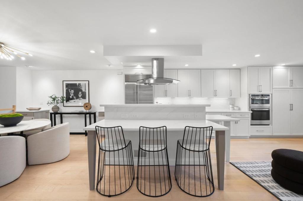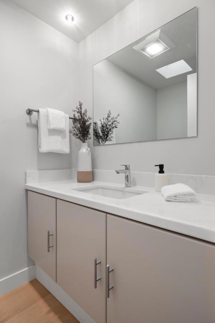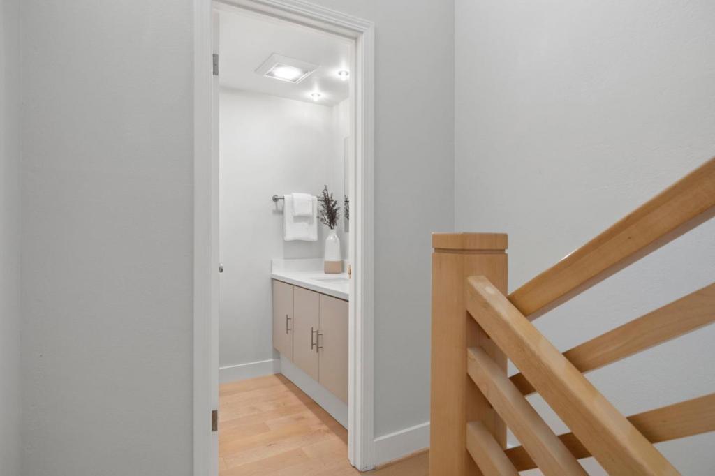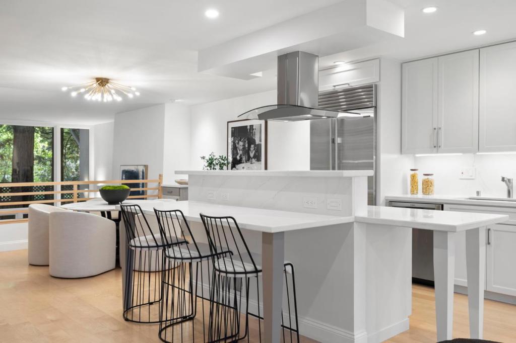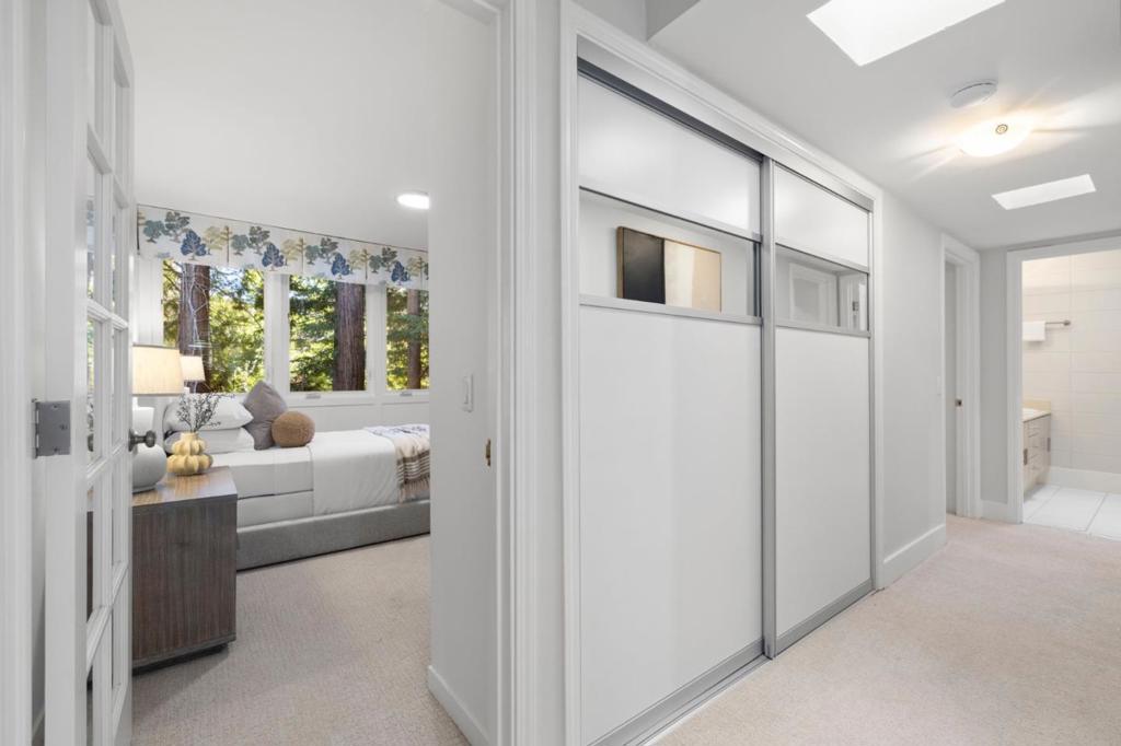Modern sophistication meets natural serenity in this special enclave in Menlo Park. The open-concept main floor features a renovated kitchen equipped with Sub-Zero, Thermador, and Bosch appliances, flowing seamlessly into the family room and dining areas offering a wonderful flow.The dining area, features custom built-ins and a wine fridge, as well as offering a stunning and unique birds-nest perspective over the formal living room below. This dramatic, double-height living space is anchored by a floor-to-ceiling glass wall, providing a quiet and immersive view of the redwood-studded patio. The private quarters are equally refined, featuring a primary suite with a dedicated balcony and a beautifully updated ensuite bathroom with soaking tub. Two additional bedrooms share a hallway bath with a dual-sink vanity and stone counters. Recent owner upgrades include double-pane windows for sound and climate control, light hardwood floors, and custom California Closets throughout. This home includes a 220V EV-ready garage and a professional Culligan water system. Located blocks from the newly developed Springline, Santa Cruz Avenue dining, and Menlo Park Caltrain. Served by acclaimed Menlo Park schools.