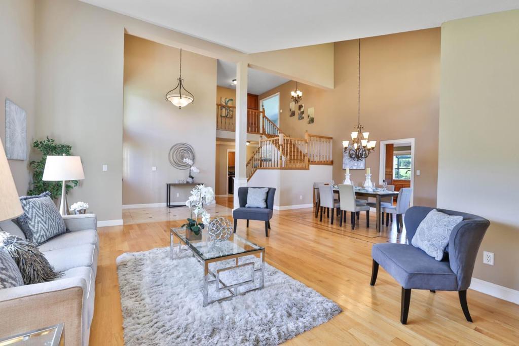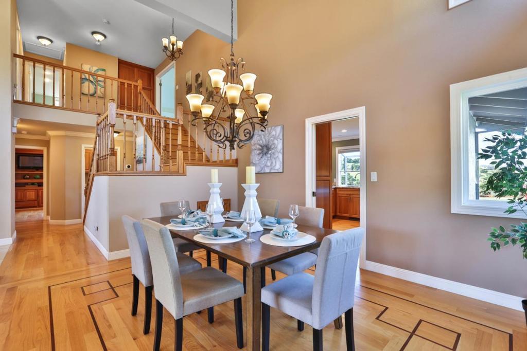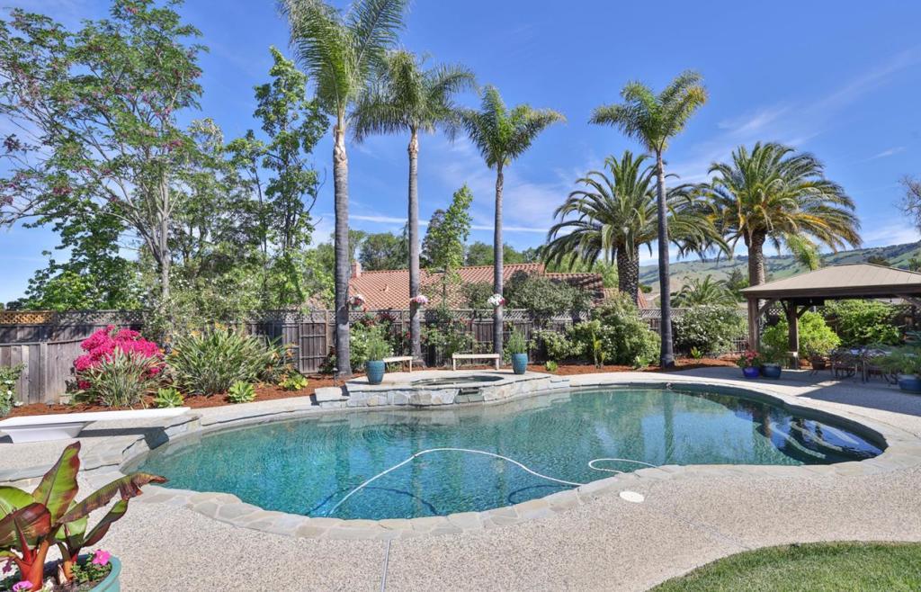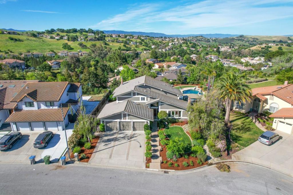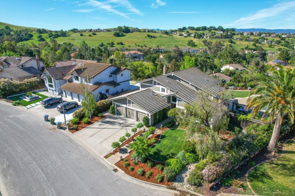 Best VIEWS in the Evergreen Valley from this meticulously maintained home in The Meadowlands. Located on a 25,000+ sf lot and landscaped to perfection to offer both privacy, breathtaking views & fabulous sunsets. The large backyard is equipped with a built-in pool, spa, pergola, lawn play area & planter boxes in the rear yard for the gardening enthusiast. The interior of the home has 2768 sf of gorgeous living space with 4 bedrooms & 3 full bathrooms. Oak hardwood flooring flows throughout. The main floor bedroom was remodeled to include cherry cabinets, built-in desk, Murphy Bed plus a walk-in closet. Across the hall is a full bathroom with a walk-in shower. The Chef's kitchen is equipped with granite counter tops, cherry cabinets, stainless steel appliances, six burner stove, double ovens, pantry with pull out shelves and recessed lighting. The adjacent family room has cherry cabinetry, bar area with beverage fridge & a gas fireplace. Upstairs is the primary suite with gorgeous views, ensuite bathroom & walk-in closet. Completing the upstairs are two additional generously sized bedrooms and a beautifully remodeled hallway bath. Additional upgrades include Milgard double- paned windows throughout, NEST thermostats, and dual air & heat. Move-in ready! A spectacular must see home!