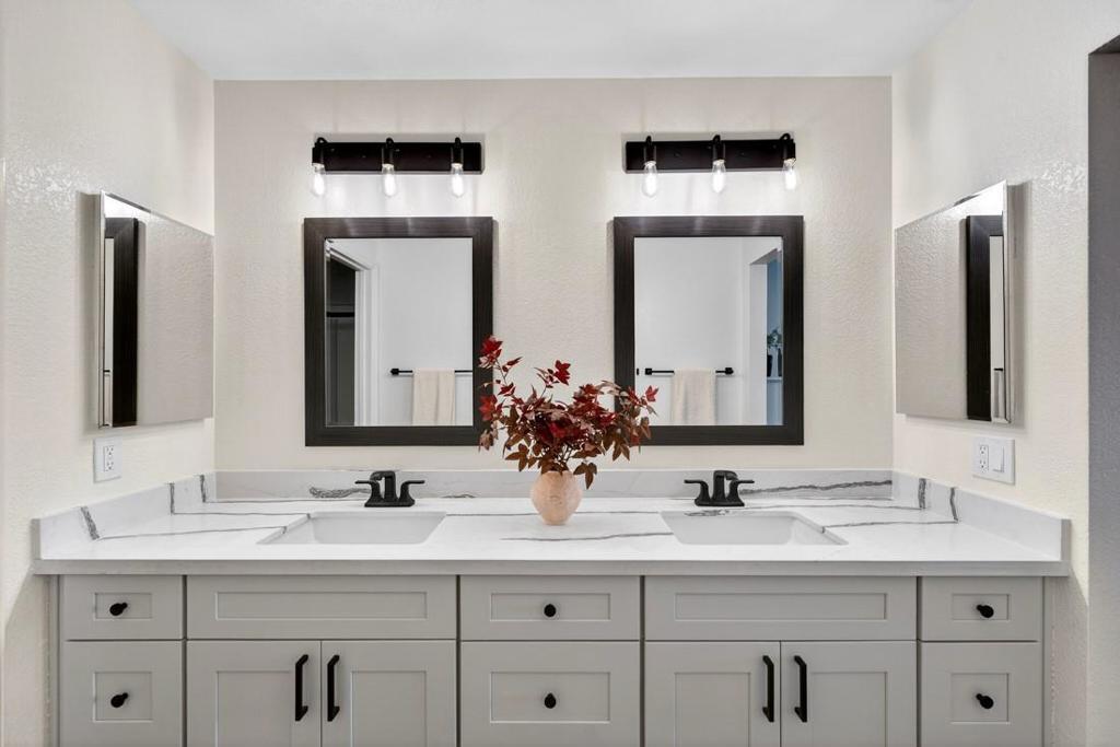 Welcome to this beautiful Morgan Hill home, which has been nearly entirely remodeled over the past 5 years in a quiet poolside view location. At the heart of the home is a fully remodeled kitchen (2025) featuring new cabinetry with soft-close hardware, quartz countertops and backsplash, under-cabinet lighting, and new GE Profile stainless steel appliances. The space flows seamlessly into the dining and living areas, enhanced by new LVP flooring, updated lighting, and refined finishes throughout. Both bathrooms have been stylishly renovated with quartz vanities and updated fixtures, while the primary suite offers a refreshed retreat with new paint, flooring, and an upgraded bath. Additional improvements include new Milgard windows and sliding doors, updated baseboards, fresh interior and exterior paint, and modern hardware throughout. Major system upgrades provide peace of mind, including new exterior trim, gutters, fencing, garage door and opener, water heater, and a Tesla EV charger. The backyard has been newly landscaped with fresh sod, updated irrigation, and space to relax or entertain, making it perfect for enjoying Morgan Hills' indoor-outdoor lifestyle.