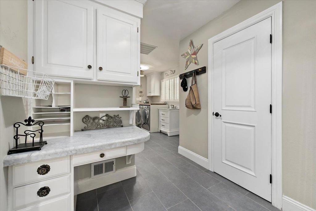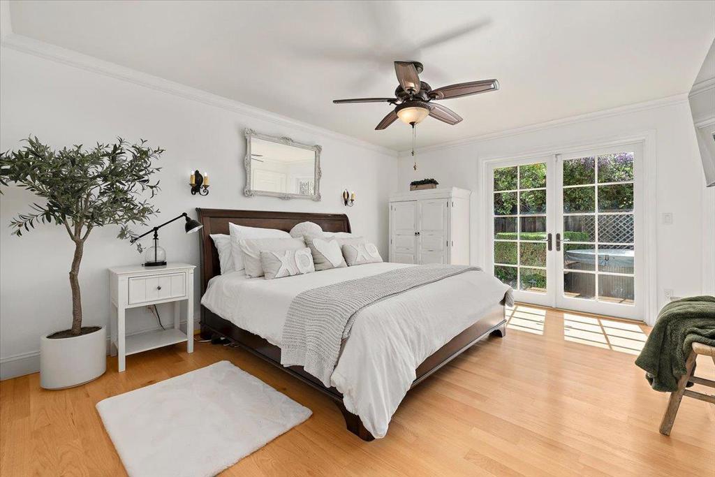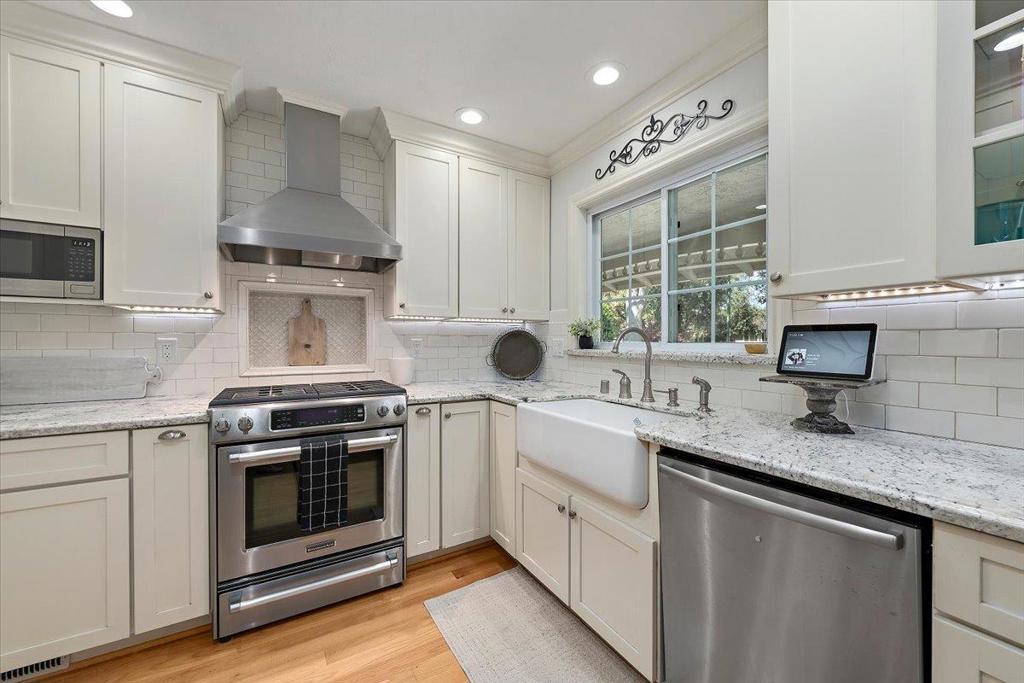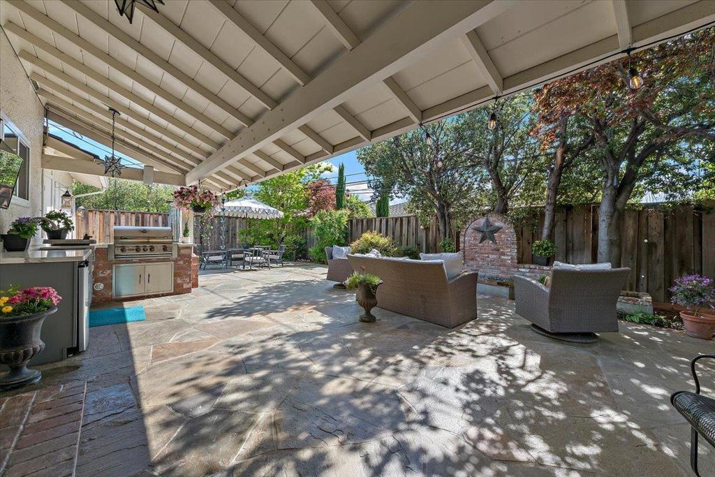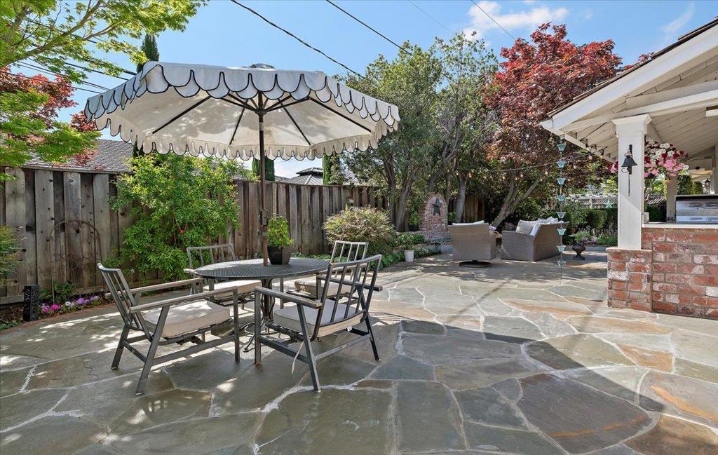 Beautifully updated single level 4 bedroom home on enchanting tree-lined street just 1/2 mile to neighborhood Booksin Elementary as well as St Christophers. Well appointed kitchen with granite countertops, stainless appliances, breakfast bar open to family room with brick wood burning fireplace. Separate formal dining/living room with secondary elegant gas fireplace. En-suite bedroom features: French door access to private rear yard hot tub, walk-in closet & oversized spa-like bath w/ jetted tub and separate shower. Laundry/mud room with sink, pantry and beautiful marble-top built in desk. Large bedrooms share hall bath with double sink vanity & walk-in shower. Hardwood flooring throughout. Multiple built-in desks & cabinetry. Oversized 10,602SF lot with lush grounds, outdoor kitchen, flagstone patio, glass fire feature, meandering pathways to hidden hot tub and quaint hanging swing where you can enjoy the bountiful fig, persimmon, plum, apple, tangerine & apricots from your own garden! Other highlights include Dual Zone HVAC, 2 car garage