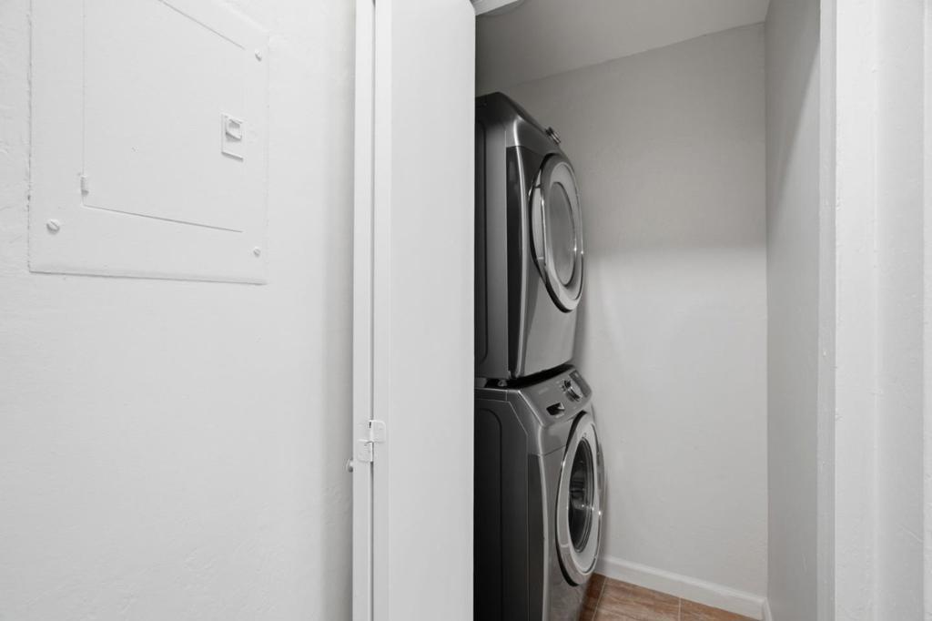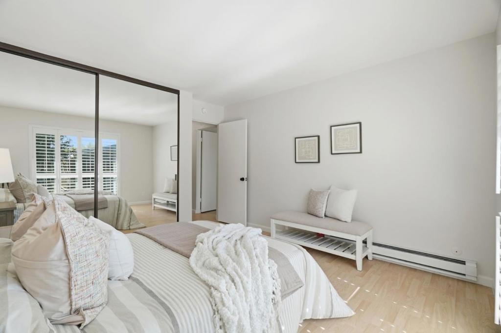 Best location within the complex! Top-floor, south-facing condo featuring serene treetop yard/pool views, abundant natural light, & rare privacy with no shared wall in the primary bedroom. This 1,140 sq ft home in a secure gated community offers a spacious open layout with bright living room, generously sized secondary bedroom, upgraded U-shaped kitchen featuring quartz countertops and stainless steel appliances, plus an oversized balcony ideal for relaxing. In-unit laundry, laminate flooring, & window shutters add both convenience and style throughout. Prime South Bay location within walking distance to Safeway, Sutter Health PAMF, Best Buy, CVS, UPS, and Sylvan Park; within minutes to Downtown Mountain View, Downtown Sunnyvale, Grant Road Center, and San Antonio Center for major shopping, dining, and entertainment hubs. Easy access to Hwy 85/237, 10-20min driving to major tech campuses with nearby shuttle stops. Community amenities include elevator, underground parking, additional storage, gym, billiards room, pool, private garden, and 24-hour security. HOA covers water, sewer, and garbage. Top-rated schools: Amy Imai Elementary and Mountain View High. This home perfectly combines comfort, convenience, and resort-style living in one of the most desirable South Bay locations.