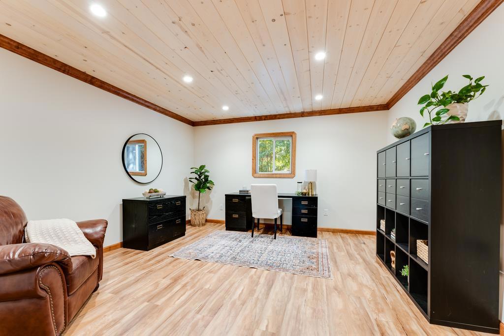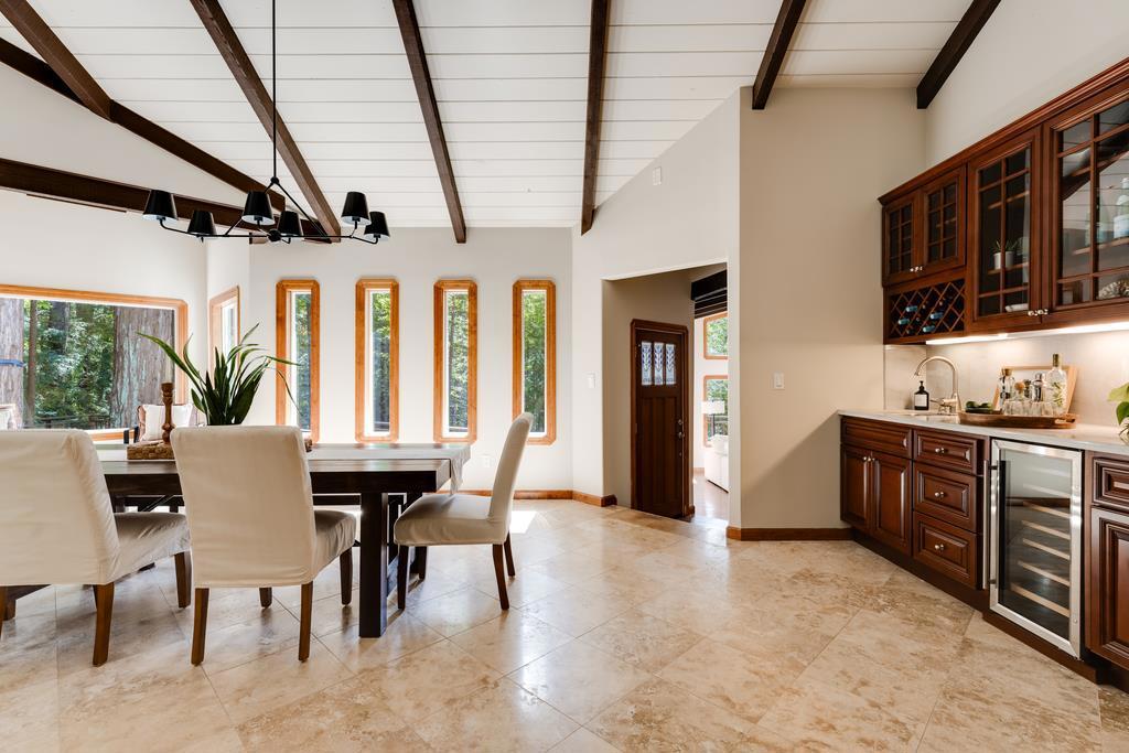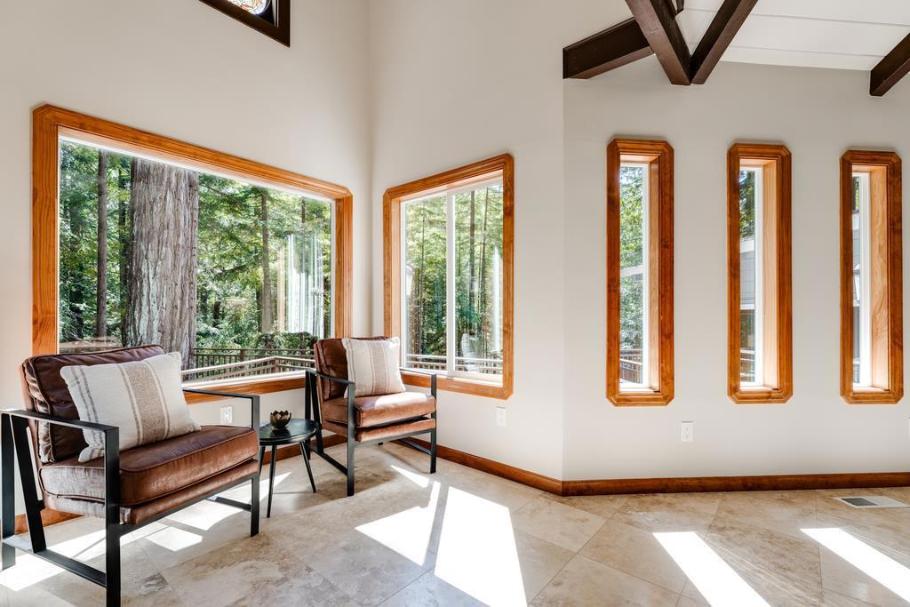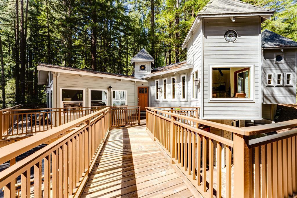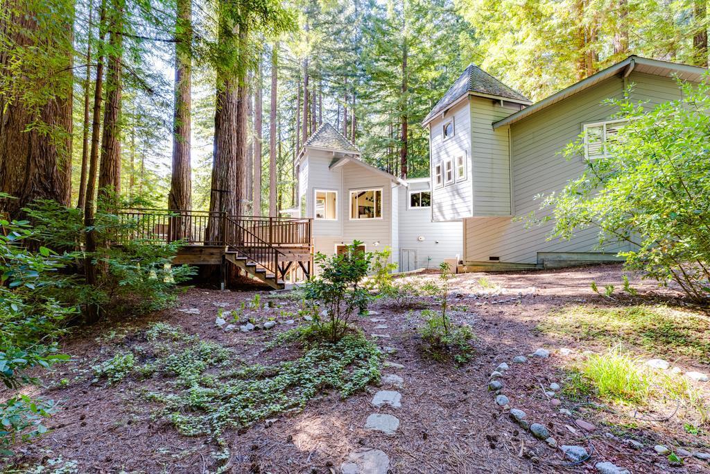 Set on over an acre in the redwoods, this intriguing Summit property balances privacy, design & livability. Surrounded by mature redwoods & a nearby stream, the home offers quiet & separation, while still maintaining direct access to Silicon Valley, Los Gatos & the coast. Easy access to Loma Prieta Elementary, the Summit Store & local wineries. Architecturally, the turret elements, stained glass & warm wood detailing give it one-of-a-kind character. Inside, the main living space is defined by open beam ceilings & windows that look into the surrounding forest. The step-down living room is anchored by an efficient wood-burning fireplace. The elegant kitchen & dining areas are open & functional, finished with quartzite counters, a wine fridge, wet bar & additional windows maintaining a connection to the outdoors. The primary suite is a private retreat with skylights & a clawfoot tub beneath high ceilings & stained glass. The floor plan includes a bonus office, rec room & garage. Decking & trails through the redwoods create multiple usable areas to enjoy the afternoon sun. The property is equipped with a Tesla charger, automatic generator, 4 zone heat & AC, public H20 & Comcast. An enchanting home that brings together thoughtful design, a lovely redwood setting & modern conveniences.