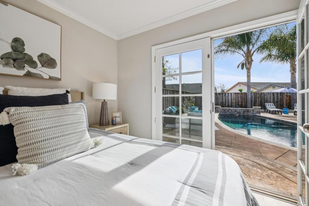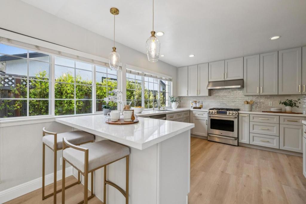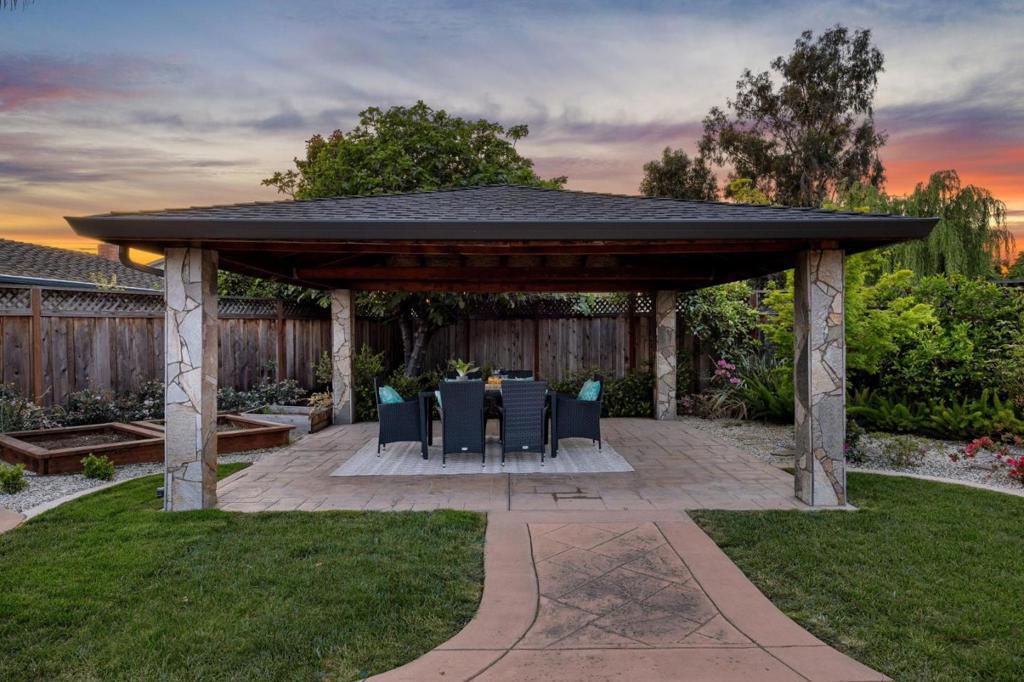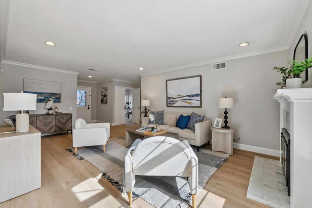 Beautifully updated home with vibrant landscaping, stamped concrete driveway & freshly painted exterior. Inside, a light-filled living room features a fireplace with marble tile surround. Remodeled kitchen offers shaker-style cabinetry, quartz countertops, tile backsplash & stainless-steel appliances, opening to a dining area and bright family room with bay window, and sliding glass door to backyard. Spacious primary suite includes a wall of closets, French doors to patio & updated ensuite with marble vanity & spacious walk-in shower featuring designer tile. 3 additional bedrooms & updated hall bath provide flexibility for guests or family. The tropical-inspired backyard features multiple patios including a pergola-covered area & sparkling pool with waterfall. Highlights include luxury plank flooring, fresh interior & exterior paint, recessed lighting, updated R-38 attic insulation, dual pane windows, central A/C & attached 2-car garage with laundry. Quiet cul-de-sac location just minutes from Lions Supermarket, local dining, only .5 mile to NewPark Mall complex featuring AMC, Costco, 24 Hour Fitness and The Newark Farmers Market every Sunday. Across the street sits Shirley Sisk Grove where you can enjoy the "Groovin' at the Grove" free summer concert series on Friday evenings.