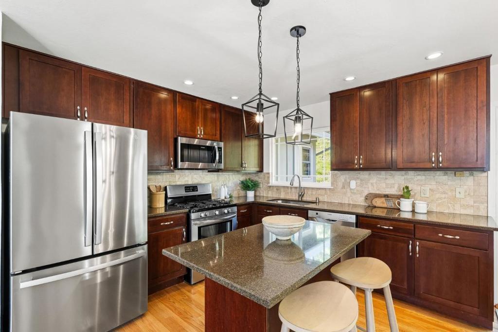 Sunny Sun Valley home is fresh, clean, updated, remodeled, and move-in condition. Maximize natural light with an open living, kitchen, and dining concept. This design focuses on culinary, dining, and lounging area connected with an island to ensure the cook stays engaged with family or guests . Refinished natural hardwood flooring throughout the upstairs living and bedroom areas adds a timeless beauty statement. Stylish three bathrooms with new vanities, lighting, hardware, and designer showers, with a sunken tub in the primary bathroom for a more spa-relaxing retreat at the end of the day . Downstairs has one bedroom/1 bathroom apartment for extra family members, guests, plus a separate entry for a rental-income opportunity. Have a musician in the family? Included is a flexible sound proofed bonus room for musical artists or use as a media room, rec room, or office. This backyard deck is perfect for a sunny BBQ or an afternoon wine tasting venue. Plus, a patio backyard garden is a delightful place for relaxing and enjoying your down-time, guests, and family-time. A close proximity to shopping, schools, library, hiking, and biking. You'll love the bright, welcoming atmosphere here--a perfect place to create your own little slice of paradise.