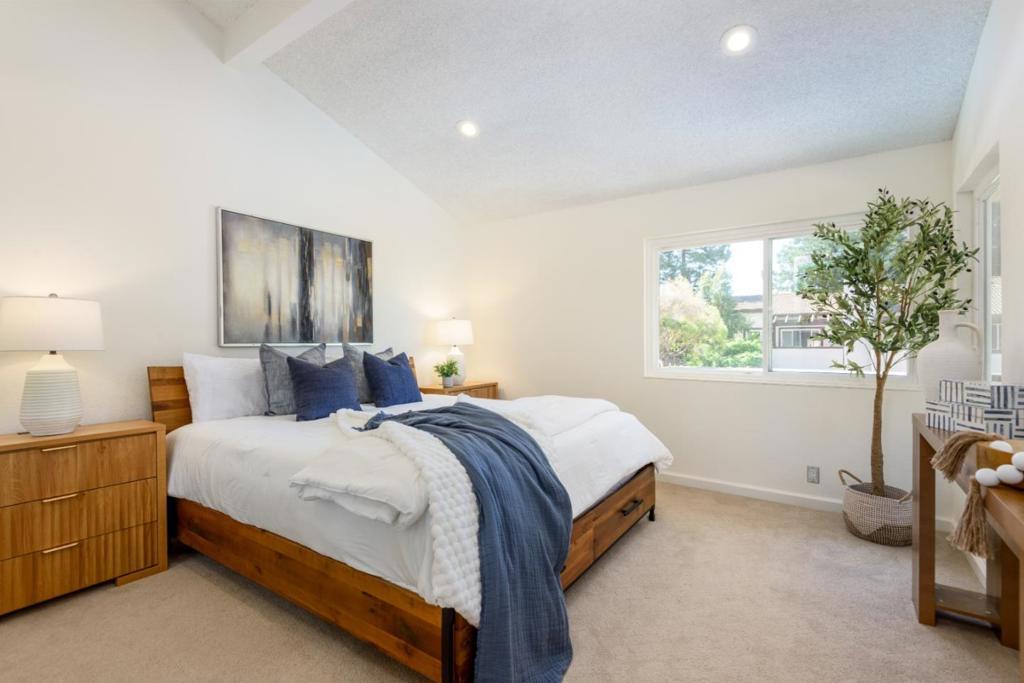 They say LOCATION, Location, location and this is it! Great central Silicon Valley location, wonderful commute location and a private and peaceful light and bright location. Welcome to this lovely top-floor retreat where natural beauty and modern comfort converge. This 2-bedroom, 2-bathroom residence lives remarkably large, with soaring vaulted ceilings and spacious rooms that amplify the volume of living and dining space for entertaining or relaxing. The updated kitchen enjoys a tranquil backdrop of redwood trees from the garden window - an unexpectedly meditative view to start (or end) each day. Morning light fills the front of the home with a gentle warmth, while sunset views serenade in the evening. Step outside the front door and a lush lawn area invites you to relax, read, or simply enjoy the quiet presence or the majestic redwoods. Within this secure, gated community a sparkling pool and spa offer an effortless extension of the lifestyle - a peaceful escape just moments from home. This top-floor haven delivers a rare blend of privacy, greenery and understated elegance.