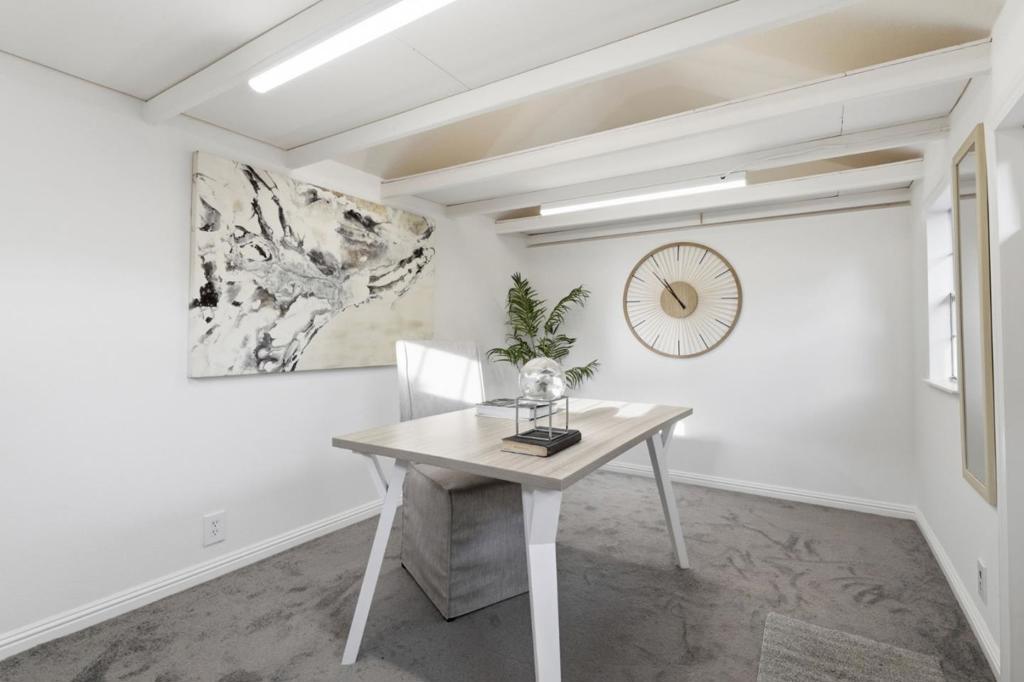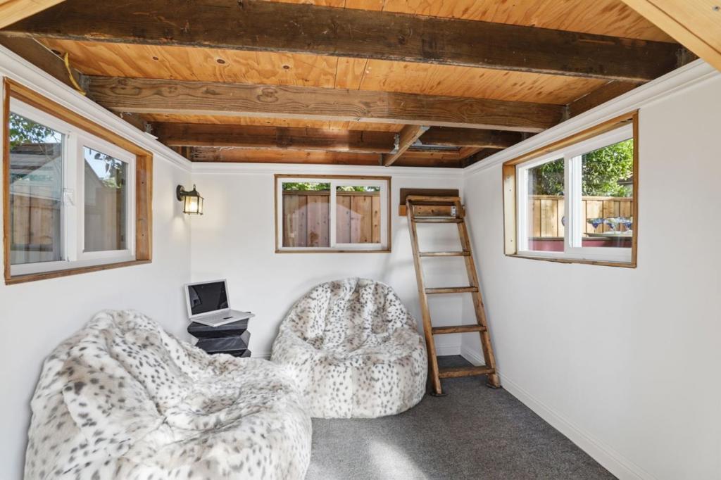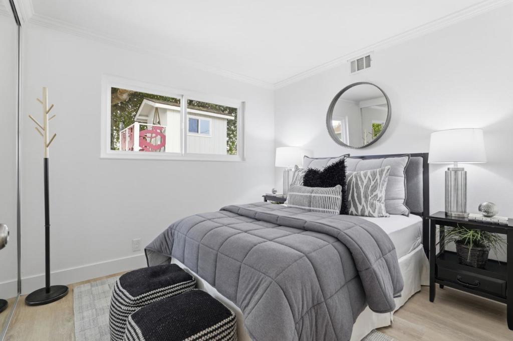 Move right into this refreshed 5 bedroom, 2.5 bathroom home offering a flexible layout for everyday living, work, and creative space. New flooring and a bright interior with recessed lighting create a welcoming feel, while the main living and dining areas flow naturally together. The kitchen features tile countertops, newly painted cabinetry and a full suite of appliances. Bedrooms include mirrored closets with built-in organizers, and the primary suite offers a private ensuite bath with a tiled stall shower. Leased solar supports energy efficiency. The dining area opens directly to an expansive deck, creating a seamless indooroutdoor connection. Brick and stepping-stone paths lead to a backyard shaded by a large oak tree, with multiple areas to relax, work, entertain, or play. A detached structure with electricity provides additional versatility for remote office, hobbies, and storage, and a whimsical play structure for the kids. A custom bar area adds a natural gathering point. The layout offers flexibility for both quiet enjoyment and larger get-togethers. Attached 2-car garage with built-ins and workshop space. Excellent commuter location near major Silicon Valley employers, shopping and dining, and quick stroll to Baker Elementary, Moreland Middle, and the Harker School.