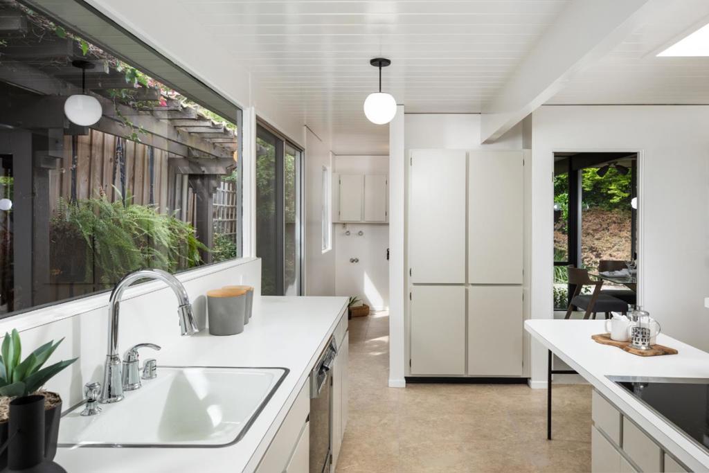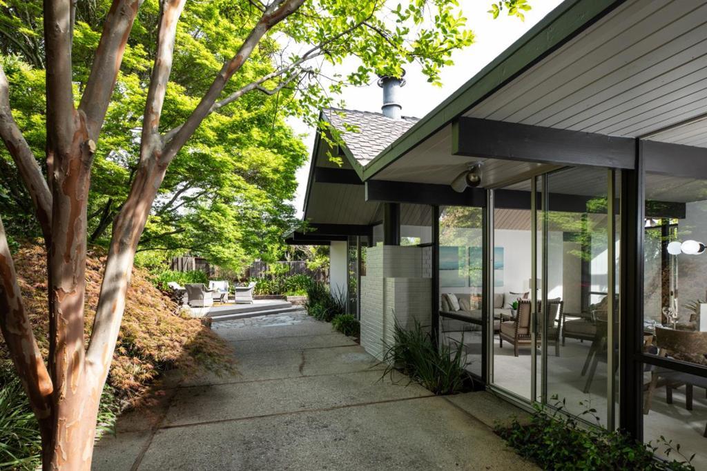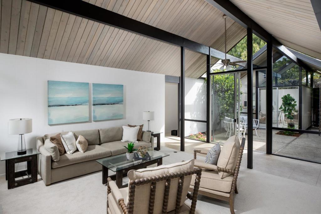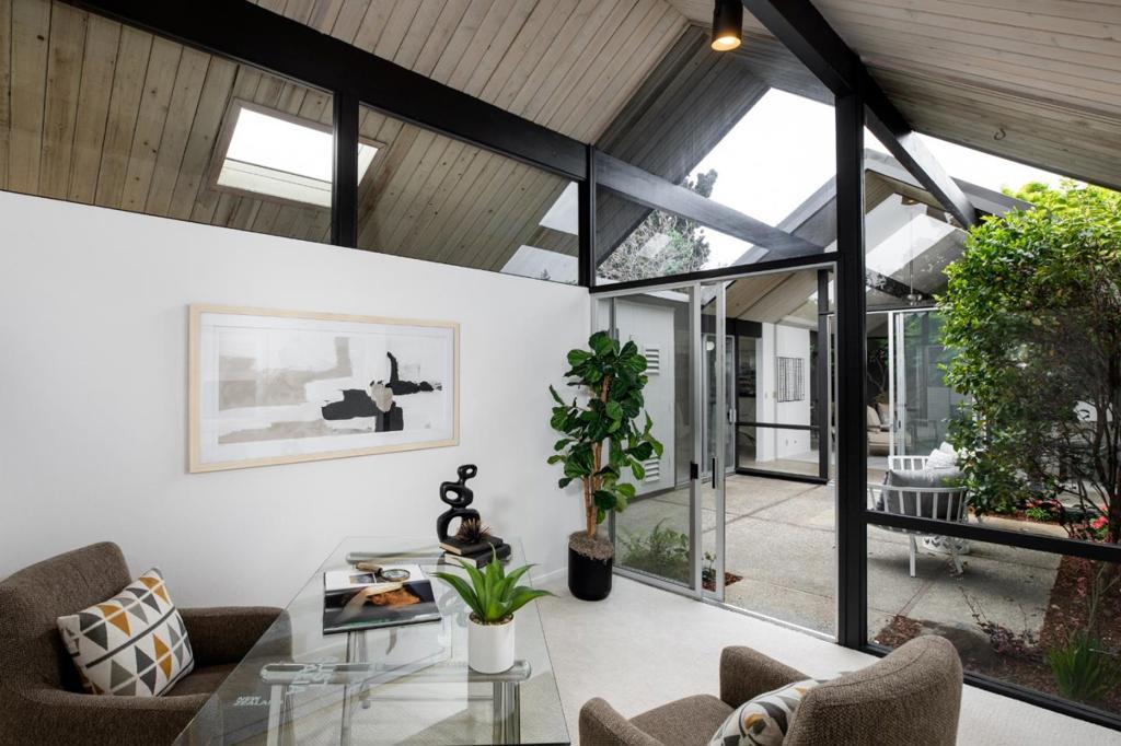 Welcome to this sleek mid-century modern home. Enter through the open-air atrium foyer which allows light to the center of this beautifully built Eichler home. One is greeted by the bright & contemporary living room with a wall of windows, floor-to-ceiling brick fireplace, white washed wood ceiling & dramatic post-&-beam architecture. Adjoining is the dining area with a sophisticated mid-century lighting fixture & views of the pristine garden. Open eat-in kitchen with a center island, skylight, globe lighting & spacious pantry. Adjacent to a convenient laundry area & access to the attached two-car garage. The property has been enhanced with fresh interior & exterior paint, new carpeting & lighting fixtures. The primary bedroom has access to the rear yard, walk-in closet, plus bathroom with new vanity, flooring and lighting. Tucked on a quiet cul-de-sac in coveted Ortega Park, on a private lot with mature landscaping, radiant heat, walls of glass & open-air atrium taking advantage of California's indoor/outdoor lifestyle. Top-rated schools: Stocklmeir Elementary, Cupertino Middle & Fremont High School. In close proximity to schools, Caltrain & Apple Park. A rare opportunity to own a preserved Eichler with timeless minimalist appeal and modern amenities.