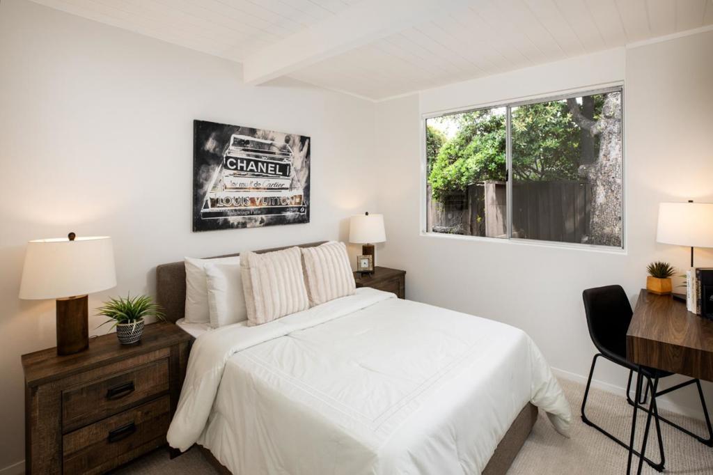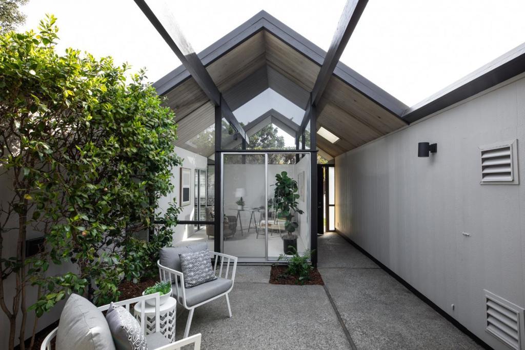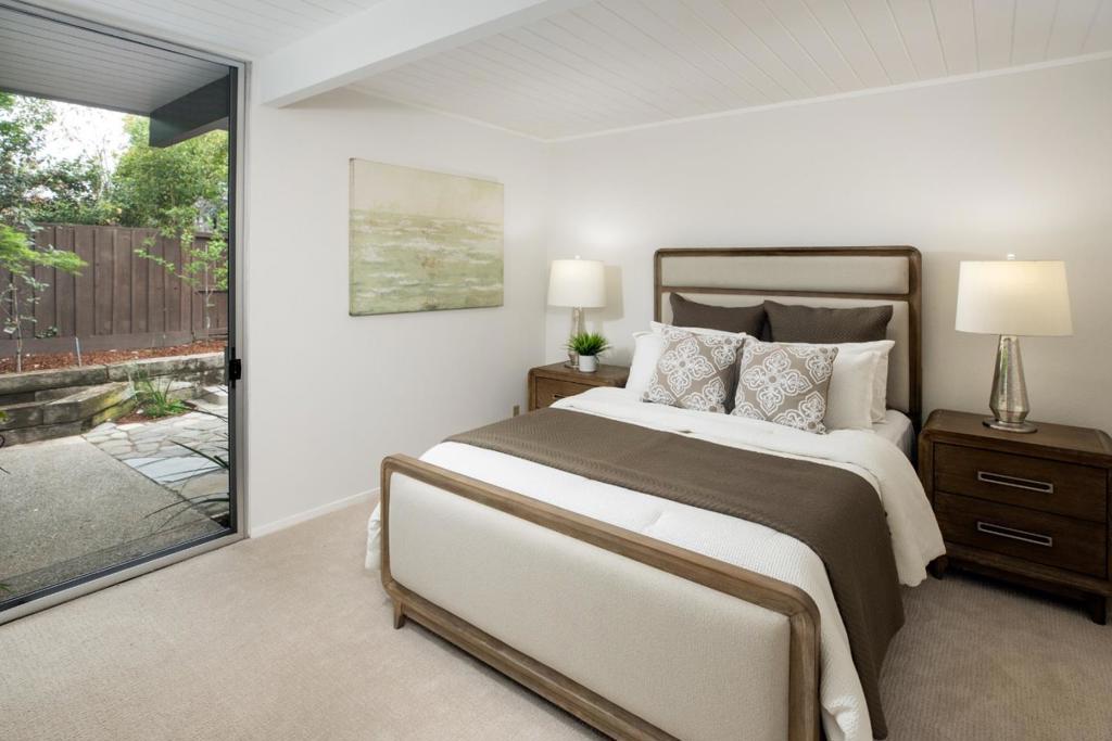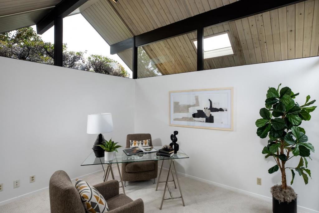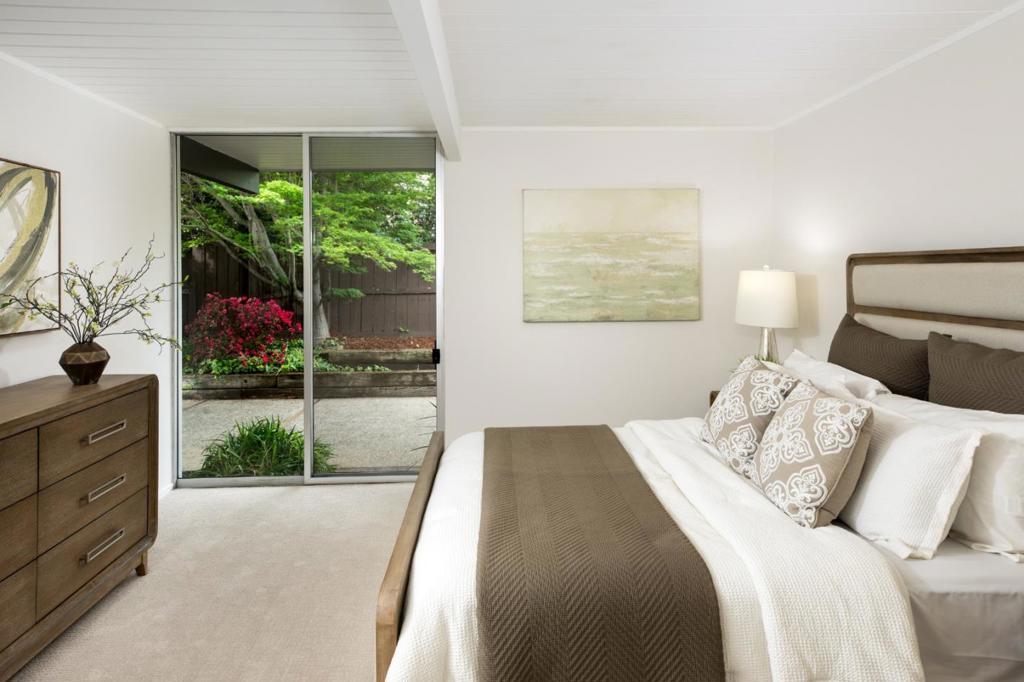 Welcome to this sleek mid-century modern home. Enter through the open-air atrium foyer which allows light to the center of this beautifully built Eichler home. One is greeted by the bright & contemporary living room with a wall of windows, floor-to-ceiling brick fireplace, white washed wood ceiling & dramatic post-&-beam architecture. Adjoining is the dining area with a sophisticated mid-century lighting fixture & views of the pristine garden. Open eat-in kitchen with a center island, skylight, globe lighting & spacious pantry. Adjacent to a convenient laundry area & access to the attached two-car garage. The property has been enhanced with fresh interior & exterior paint, new carpeting & lighting fixtures. The primary bedroom has access to the rear yard, walk-in closet, plus bathroom with new vanity, flooring and lighting. Tucked on a quiet cul-de-sac in coveted Ortega Park, on a private lot with mature landscaping, radiant heat, walls of glass & open-air atrium taking advantage of California's indoor/outdoor lifestyle. Top-rated schools: Stocklmeir Elementary, Cupertino Middle & Fremont High School. In close proximity to schools, Caltrain & Apple Park. A rare opportunity to own a preserved Eichler with timeless minimalist appeal and modern amenities.
