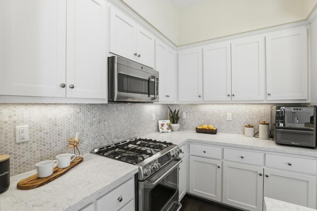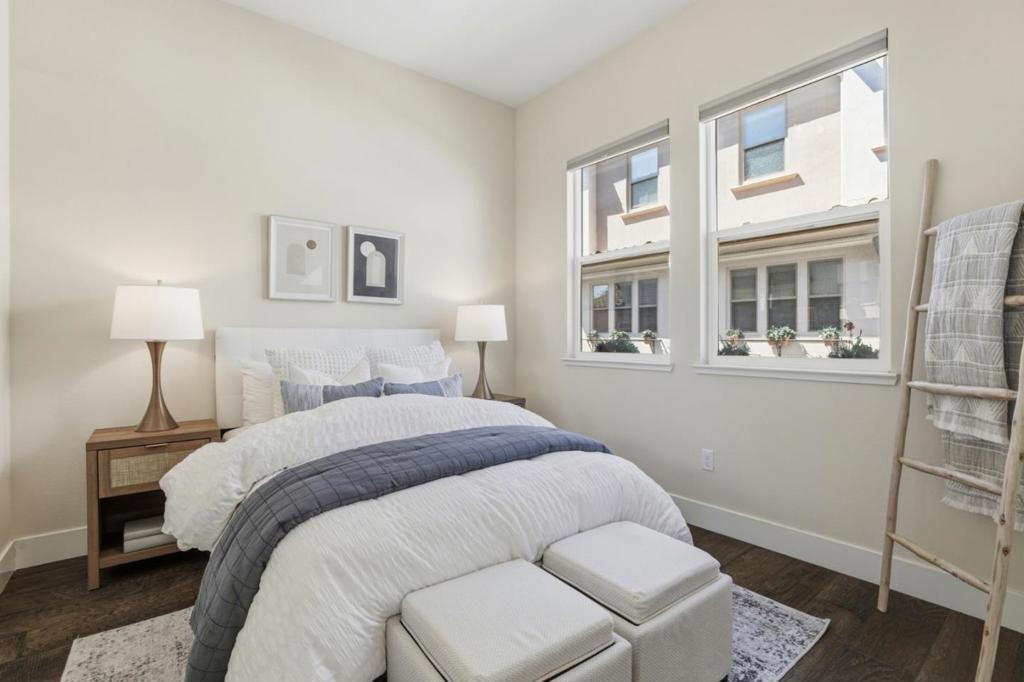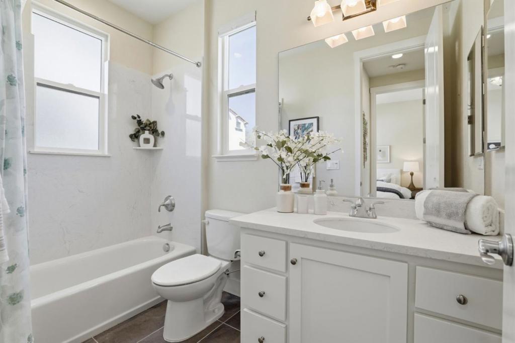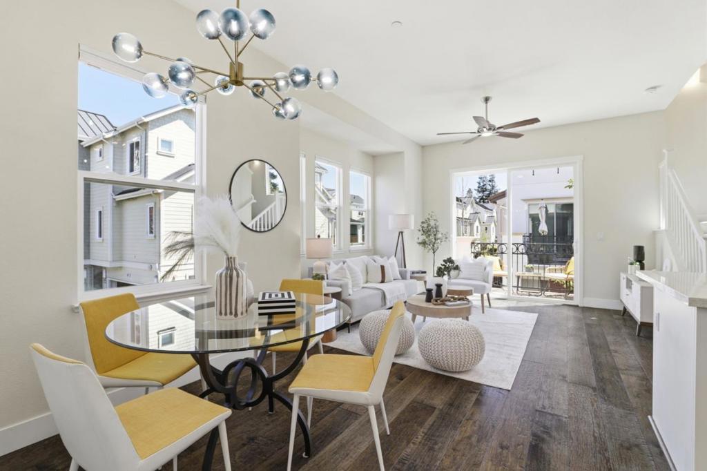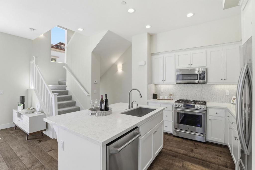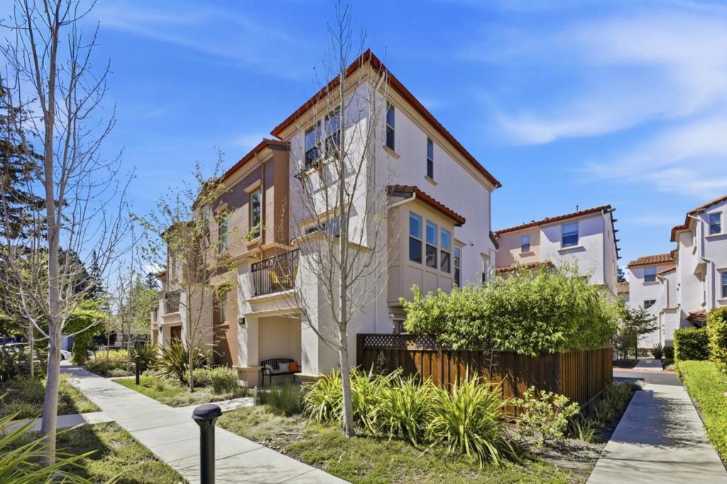 Rare peaceful corner unit in a picturesque, tree-lined neighborhood in the heart of Silicon Valley, this stunning 3-bedroom, 3-bathroom townhome combines modern living with an unbeatable location. The main level has an open floor plan with natural light designed for comfort and entertainment. The spacious living room offers balcony access and integrated into a gourmet kitchen. The chef's favorite kitchen comes with quartz countertops, high-end stainless steel appliances, and ample workspace. A versatile bedroom and full bathroom on this level provide an excellent option for home office or guest suite. The luxurious primary suite features a generous walk-in closet and a beautifully designed bathroom with a double-sink vanity, creating a private retreat. Additional highlights include a large 2-cargarage, an in-unit washer/dryer, and unparalleled convenience. Close to major employers such as Google, Meta, Apple, etc. Walk or bike to groceries, shops, parks, hiking trails. Downtown Mountain View is just minutes away, and easy access to highways 101 and 85. Zoned for the highly acclaimed Los Altos schools!!