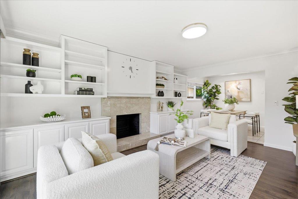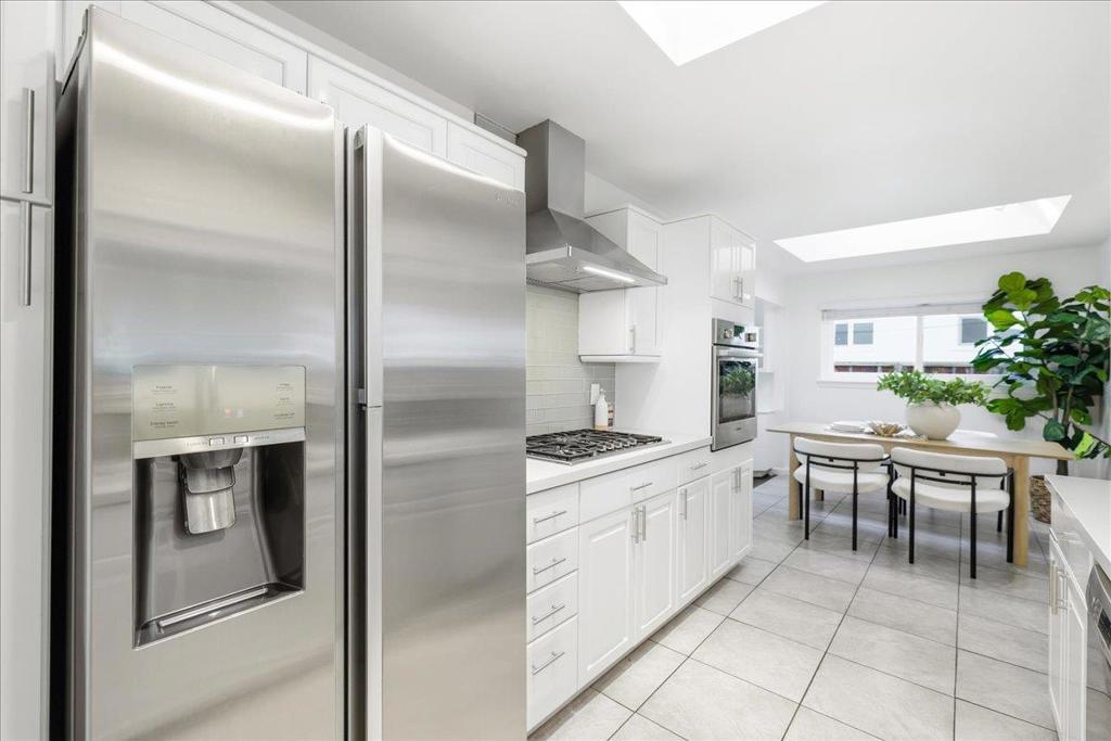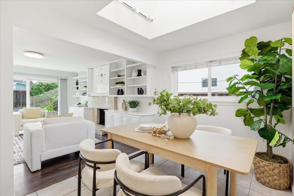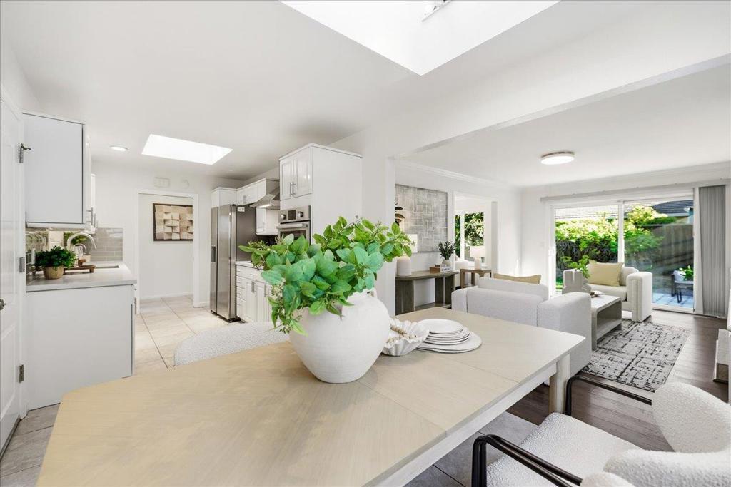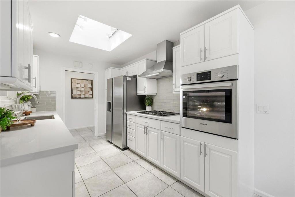 Beautifully updated single-story home minutes from top rated Cupertino schools, Santana Row & Apple Campus featuring a bright, light-filled interior & functional layout with luxury vinyl and tile flooring. Spacious living & family room with fireplace, built-in white cabinetry, recessed ceiling lighting, and large picture window. A sliding glass door provides seamless indoor-outdoor flow. Formal dining area enhanced by skylights with integrated track lighting. Bright galley-style eat-in kitchen showcases white shaker-style cabinetry, full tile backsplash, window above sink, and stainless steel appliances including refrigerator, cooktop, hood, built-in Bosch wall oven, & dishwasher. Spacious bedrooms offer built-in closets. Primary bathroom features a freestanding soaking tub, frameless glass shower enclosure with dual shower heads (rain + handheld), built-in recessed shower niches, linear drain, vanity, & consistent designer tile work. Additional highlights include a dedicated laundry area & thoughtfully designed living spaces throughout. Fenced backyard with lush lawn, concrete patio, raised planter area, & mature greenery, perfect for entertaining or relaxation. Low-maintenance landscaping & attached 2-car garage complete this move-in ready home.