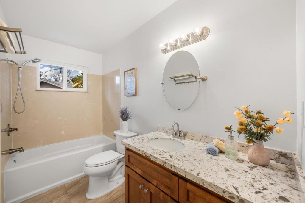 Welcome to 1291 Spencer Avenue, a beautifully updated 2 Bedroom + Office home located on a quiet, tree-lined street in the heart of Willow Glen. Charming curb appeal welcomes you with a front patio, mature orange tree, and a rare U-shaped driveway. Inside, 1,545 sq ft of light-filled living space features brand new LVP flooring, fresh interior paint, and recessed lighting throughout. The downstairs areas offer an open, comfortable flow, while a cozy sitting room with a wood-burning fireplace. The updated kitchen features quartz countertops, stainless steel appliances, ample cabinetry, and a large window overlooking the front yard. The bright sunroom offers a versatile living space, ideal for a family room, office, or playroom with direct access to the backyard. A large downstairs bedroom and updated full bath provide flexibility and convenience. Upstairs, the private primary suite features plantation shutters and an updated en-suite bath with a custom tile walk-in shower. Additional highlights include a laundry room, basement, and an attached garage with epoxy flooring, storage, and EV outlet. Enjoy a private backyard with turf, paver patio, a finished office and a storage shed. Ideally located near downtown Willow Glen, parks, shopping, dining, and major commute routes.