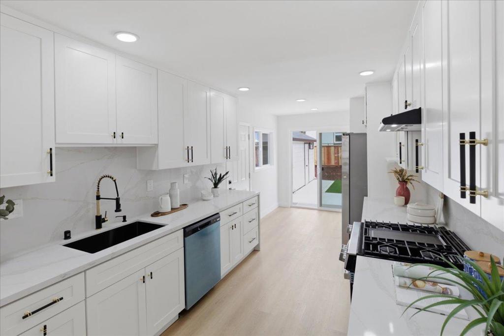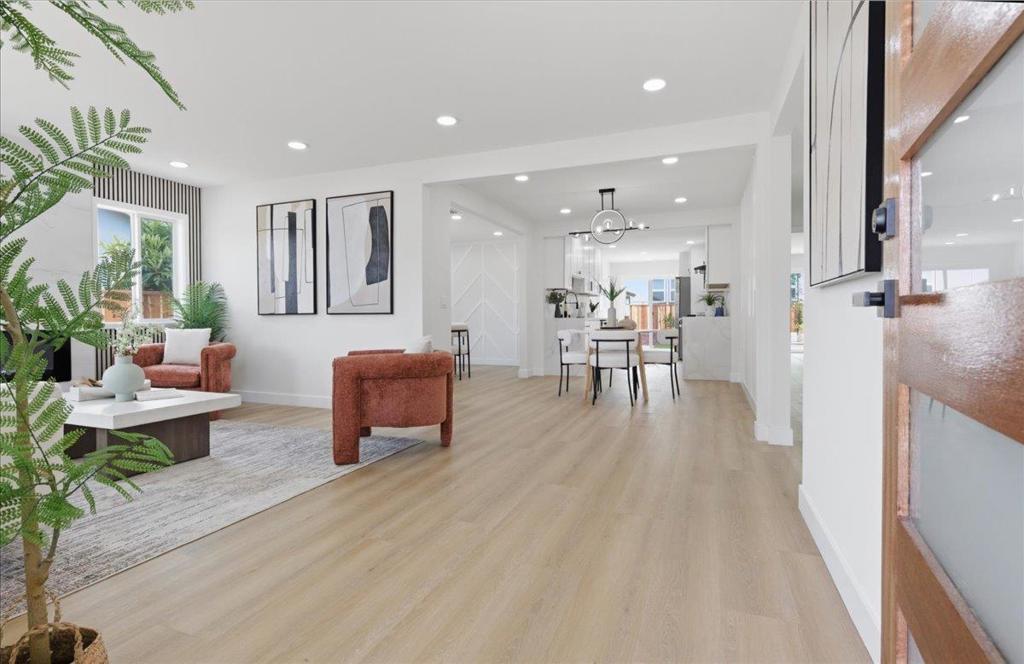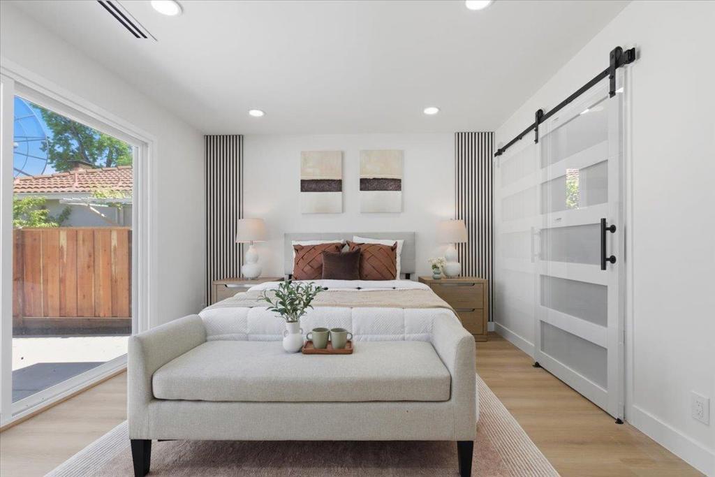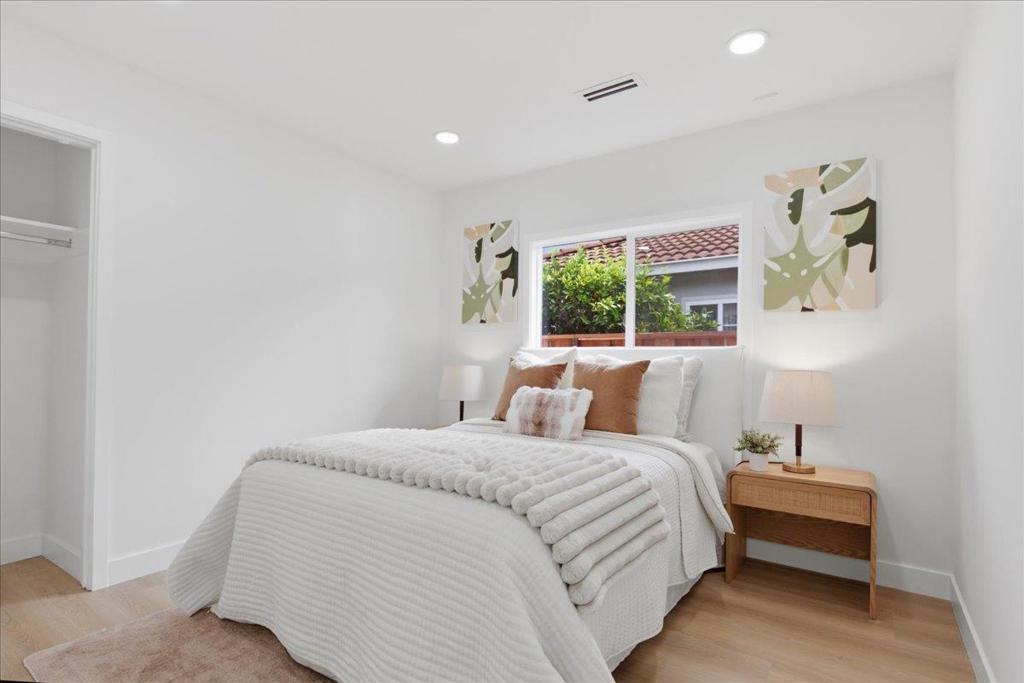 Completely renovated 3-bedroom, 2-bathroom home featuring a contemporary design and premium finishes throughout. Highlights include a one-year-old roof, new copper pipes, new subpanel, new interior and exterior paint, new recessed lighting, new flooring, new doors, new double-pane windows and new fences. Step inside to a spacious living room with a beautiful fireplace, flowing into dining area and a family room perfect for entertaining. The open kitchen boasts sleek quartz countertops, ample cabinetry, and brand-new stainless-steel appliances. The primary suite offers a luxurious ensuite bathroom with dual sinks, a separate stall shower, and a smart toilet. Two additional bedrooms share a well-appointed bathroom, ideal for children, guests, or a home office. Step outside to a large backyard with a newly paved concrete patio and low-maintenance artificial lawn, offering excellent potential for building an ADU. A separate detached two-car garage with extra parking in driveway. Centrally located near Apple, Cisco, and Adobe, with easy access to highways 680 and 101, and downtown San Jose for shopping and dining. A must-see opportunity to own a fully upgraded home in a desirable neighborhood!