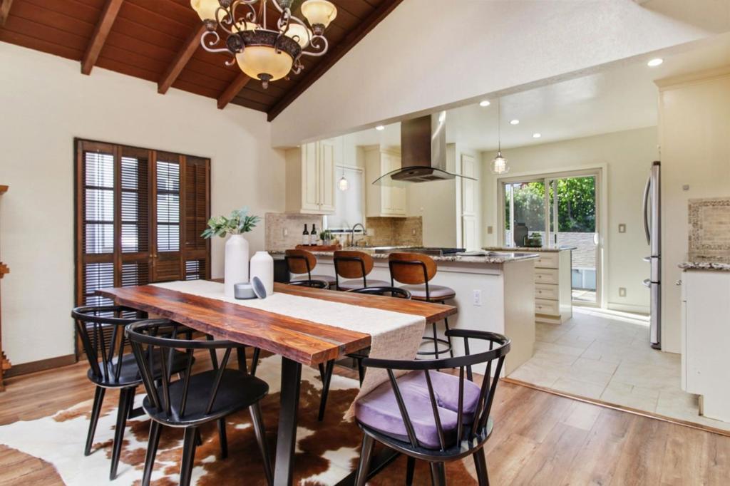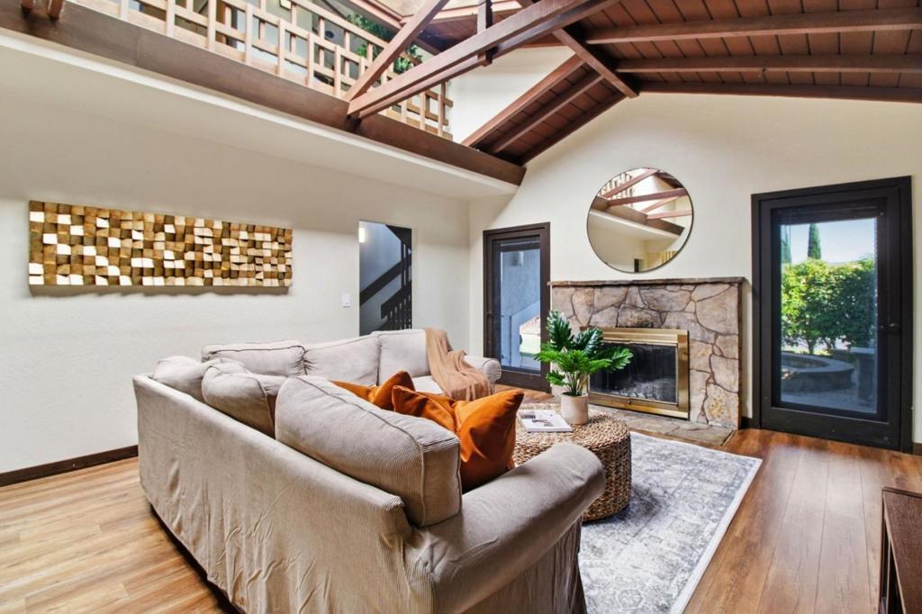 This lovely home sits on a corner lot and welcomes you with a lush private courtyard entry. Featuring 4 bedrooms, 2 baths on two levels, this home offers dramatic vaulted open beam ceilings with an open concept. The main level features an expansive living room, dining area and kitchen. The kitchen has been elegantly renovated and offers granite counter tops, a gas range, stainless steel appliances and access to a deck, making it the perfect place to start your day. There are 2 bedrooms on the main level. One of them has the laundry in it and is ideal for a home office or gym. The other 2 bedrooms, including the primary, are located on the upper level have access to the shared bathroom that features a dual vanity. The bathroom on the lower level has been elegantly updated. The outdoor space offers a fire pit, a lush lawn, and a built in outdoor kitchen with a sink that has hot and cold water, BBQ and Gazebo, making the space perfect for al fresco dining and gatherings. Centrally located on the Peninsula, this home offers convenient access to shopping, dining, sought after schools and major commute routes. square footage is provided by seller from floor plans,different records show different sq footage numbers.Buyers to investigate to their satisfaction prior to making an offer.