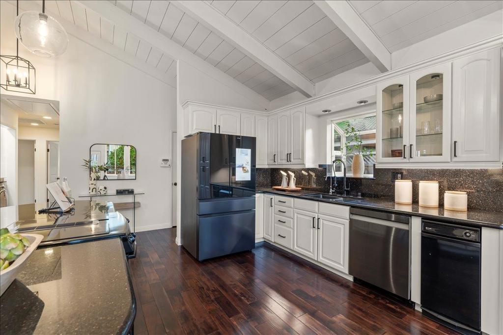 Ideally located just moments from the charm of Downtown Willow Glens Lincoln Ave shops, dining and parks, fully setback from the street, this Magnolia farmhouse-inspired home offers exceptional walkability while providing a sense of calm and retreat. The sought-after open-concept floor plan showcases a custom open-beam vaulted ceiling that anchors the spacious main living area, complemented by designer lighting, granite countertops, gas fireplace and hand-scraped Acacia walnut hardwood flooring. Over $200K in thoughtfully executed improvements provides turnkey living. 2026: new interior paint, landscape refresh, new light fixtures in primary and dining area. 2023: fully reimagined 537 sq ft garage 2019: comprehensive renovation including kitchen, fireplace, guest bath, laundry, flooring, exterior paint, new gutters, along with additional upgrades in 2014. Beyond design, the investment is substantial and intentional: new HVAC and ducting, water softener/ RO filter, upgraded electrical, smart home features, remodeled kitchen and baths and large bedrooms featuring closet organizers and window treatments. Outdoors, professionally curated grounds include over $50K in landscaping, flagstone hardscape, irrigation and full redwood fencing, creating a lush, functional, and peaceful yard.