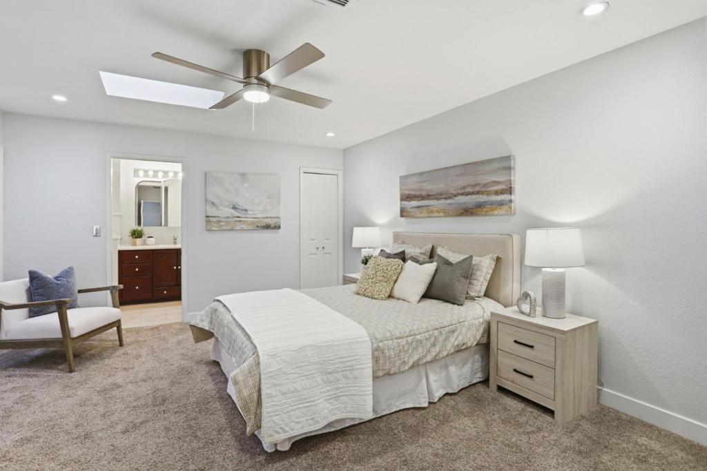 Spacious Cambrian 3 bedroom, 2 bath home featuring 2 primary suites. One suite offers an ensuite bathroom with a walk-in shower and vanity, along with two closets, including a walk-in closet and a separate large closet. This bedroom also features a skylight, in-wall air conditioning, and a slider to the backyard deck. The second suite includes a Jack and Jill bathroom, also accessible from the hallway, with its own slider leading to the front yard deck. Each bedroom features a slider, providing abundant natural light and seamless indoor-outdoor living. The kitchen offers stainless steel appliances, a pantry, a garden window, and opens to the dining area. The spacious living room features a fireplace and slider to the back deck and patio. An additional bar area is complete with a sink, small fridge, and a wine closet in-between the bar and kitchen area. The backyard is designed for both relaxing and entertaining, with a deck, patio area, sheds, and garden spaces. Additional features include recessed lighting, a tankless water heater, owned solar, whole house fan, spacious rooms and bathrooms, a light-filled interior throughout, and more. Come see this wonderful home for yourself!