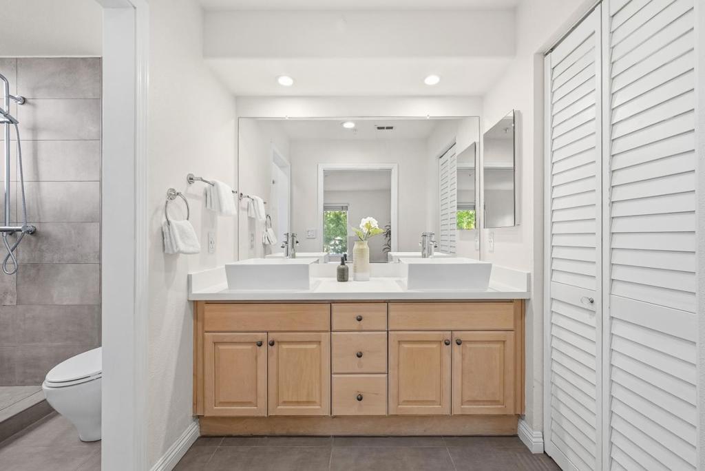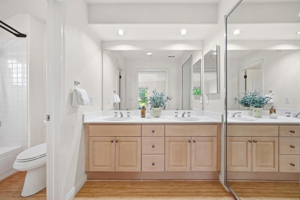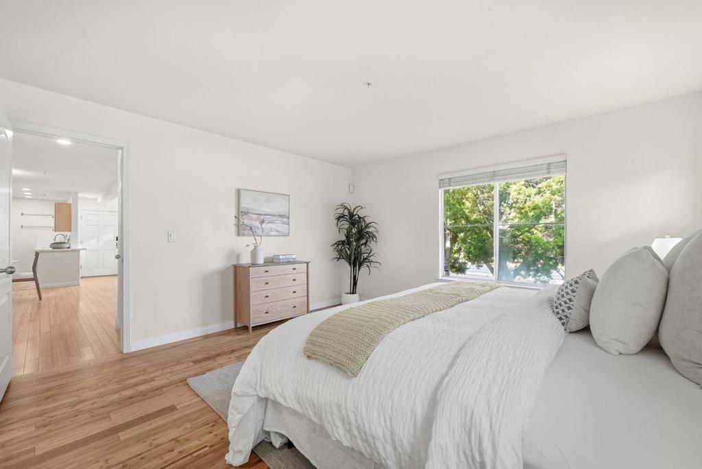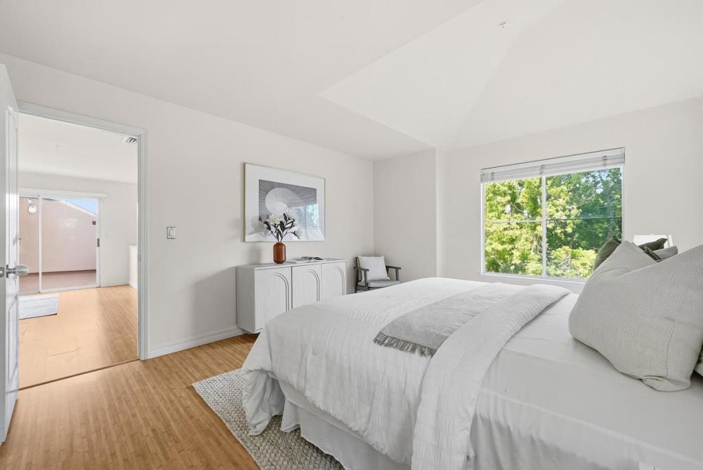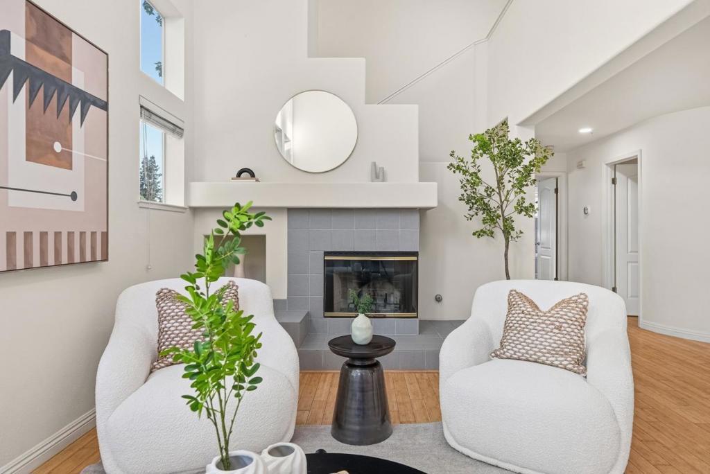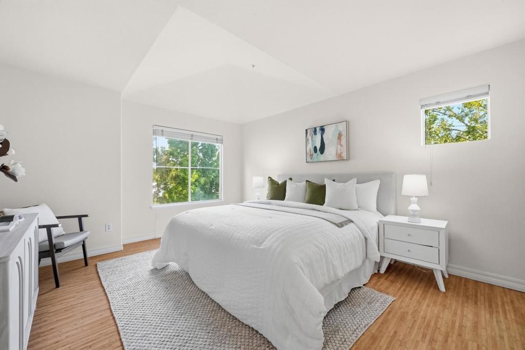 Beautiful two-story Expressions townhouse-style home featuring 2 spacious primary suites, 2.5 baths, a den, and approximately 1,584 sq ft of living space, plus a large private balcony. Dramatic high ceilings create an open and airy atmosphere, while the living room offers a cozy fireplace for added warmth and charm. The kitchen is equipped with stainless steel appliances, including a gas range, and the home also features interior laundry, central heating and air conditioning, premium bamboo flooring, new bedroom flooring, and updated stairs. Enjoy the convenience of an oversized side-by-side 2-car garage.Ideally located in the heart of Silicon Valley, the community offers resort-style amenities including a pool, spa, clubhouse, playground, and BBQ area, with HOA covering water. Excellent location close to schools, parks, shopping, major tech companies, downtown Sunnyvale, Highways 237, 85, 101, and Caltrain.