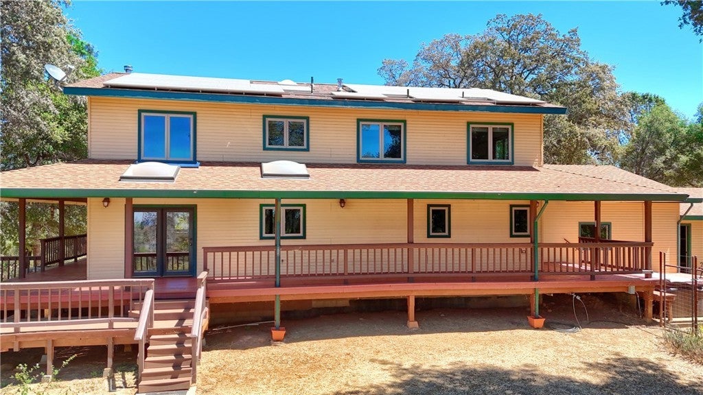 AMAZING CUSTOM HOME with PANORAMIC VIEWS from this private mountain retreat! Just minutes from Yosemite National Park, Bass Lake, and other popular lakes for boating, fishing, house boating, and year-round recreation, this 4-bedroom, 2-bath residence offers 2,760 sq. ft. of inviting living space on 27.54 acres, only a short drive to the historic town of Mariposa. Step inside to discover beautiful wood-beamed ceilings, wood-encased windows, custom wood flooring, and a stunning river rock fireplace with slate hearth that bring warmth and rustic elegance to the main living area. The spacious kitchen boasts custom cabinetry, stainless steel appliances, and a walk-in pantry, opening to the dining area and expansive wrap-around deck with spa—perfect for entertaining or simply taking in the spectacular views of the gardens, fruit trees, and wide-open skies. A versatile bedroom/office, ¾ bath, and a large laundry room with space for additional appliances complete the first floor. Upstairs features a bright open family/game room showcasing sweeping Sierra mountain views, three additional bedrooms, and a full bath. The oversized primary bedroom provides plenty of space to add a bath, if desired. Additional highlights include a fully paid solar system, private well, attached 2-car garage, several outbuildings plus an additional covered 2-car carport—ideal for a future conversion into a workshop or ADU. Outdoors, enjoy three fenced areas for gardening, pets, or farm animals, along with a detached deck for relaxation or entertaining. A true retreat designed for family and friends—close to Yosemite and Mariposa, yet private and serene with sweeping scenic Sierra Mountain Views. The perfect blend of mountain living, rustic charm, and modern convenience!