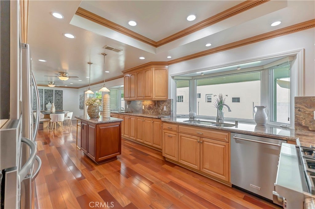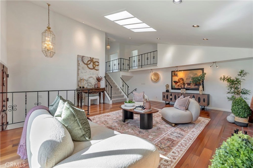 A spacious and distinctive corner-lot residence offering style, comfort, and flexibility in one impressive package. With its striking architecture, lush front lawn, and inviting curb appeal, this home makes a memorable first impression and continues to deliver throughout. Inside, you’re greeted by soaring ceilings, abundant natural light, and beautifully finished hardwood flooring that brings warmth and character to the main living spaces. The sun-drenched living room features dramatic volume, oversized skylights, elegant iron-rail accents, and a statement fireplace that serves as a true centerpiece for gathering and entertaining. The flowing layout offers both openness and defined spaces, making the home feel grand yet comfortable. The kitchen is generously sized and thoughtfully designed with extensive custom cabinetry, granite countertops, stainless steel appliances, a center island, and abundant prep and storage space. Just off the kitchen, the dining area opens seamlessly to the backyard, creating an ideal setup for indoor-outdoor living and easy entertaining. One of the home’s most unique features is its rare basement, an uncommon and highly valuable amenity for a California property. This flexible lower-level space is perfect for a secondary family room, media room, game room, home office, gym, guest retreat, or creative space, offering versatility that is difficult to find in the area. The home’s layout continues with spacious bedrooms, updated bathrooms, and an expansive primary suite that offers a peaceful escape with ample room to relax, along with direct access to a private balcony, perfect for enjoying morning coffee or evening sunsets. Step outside to a generously sized backyard designed for both entertaining and everyday enjoyment. The covered patio provides a comfortable setting for outdoor dining or lounging year-round, while the large grassy yard offers room to play, garden, or simply unwind. The backyard also offers potential for recreational vehicle parking, a standout feature that adds convenience and flexibility for those who need extra space for an RV, boat, trailer, or additional vehicles. A storage shed adds even more utility, and the corner-lot positioning enhances both space and presence. Additional highlights include a dedicated laundry room, multiple indoor and outdoor gathering spaces, abundant natural light throughout, and a layout well-suited for multigenerational living, entertaining, or simply spreading out in comfort.