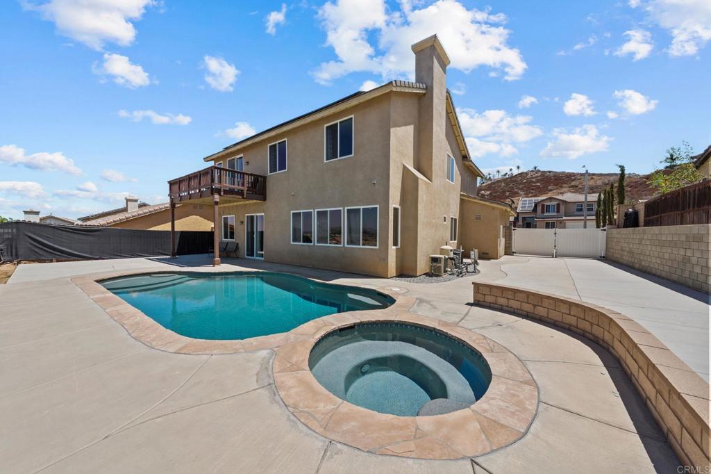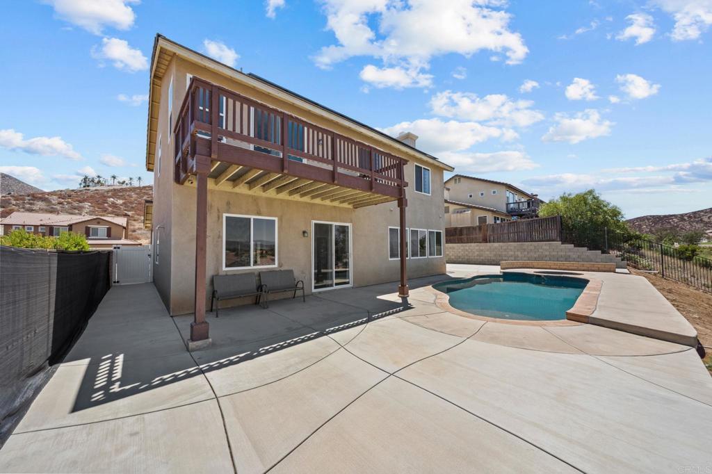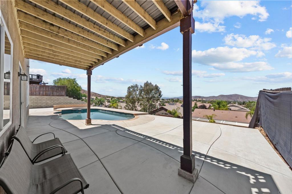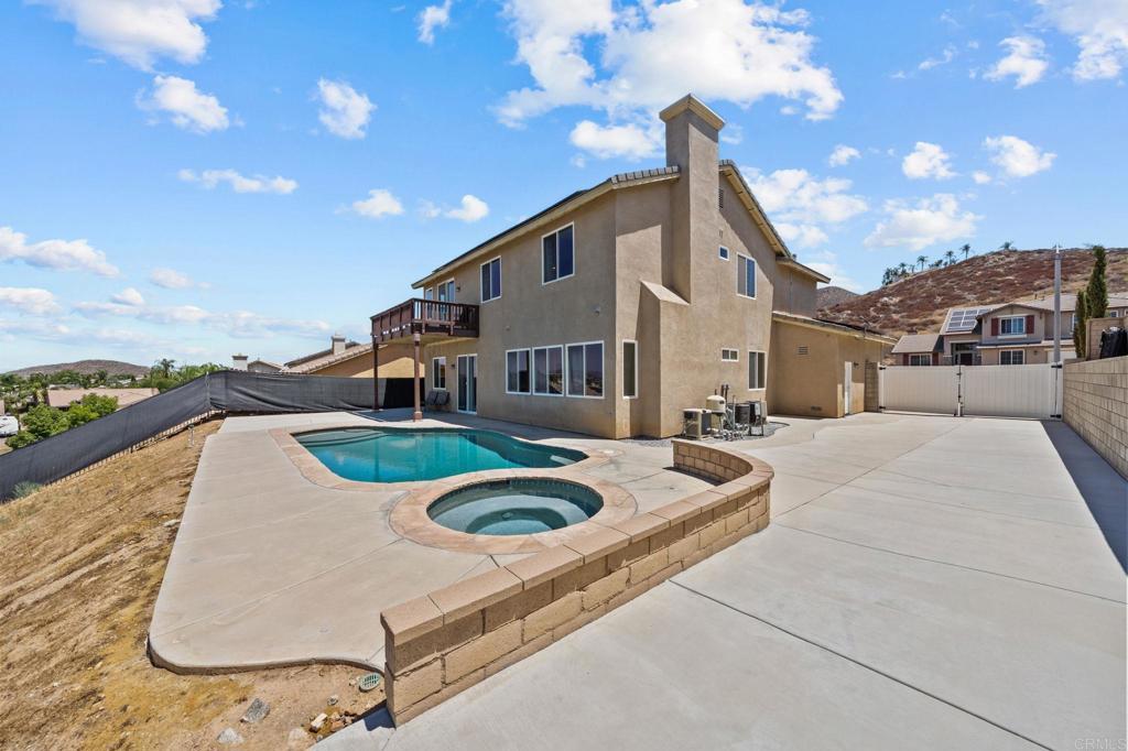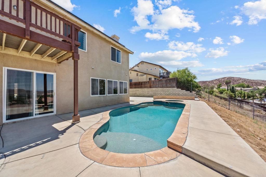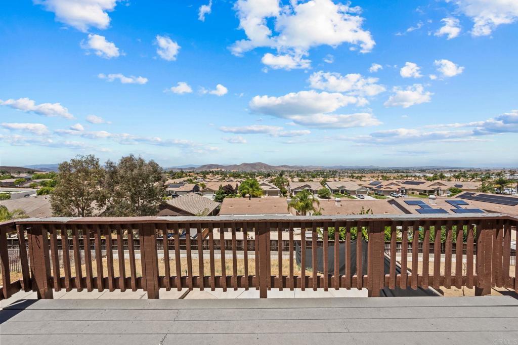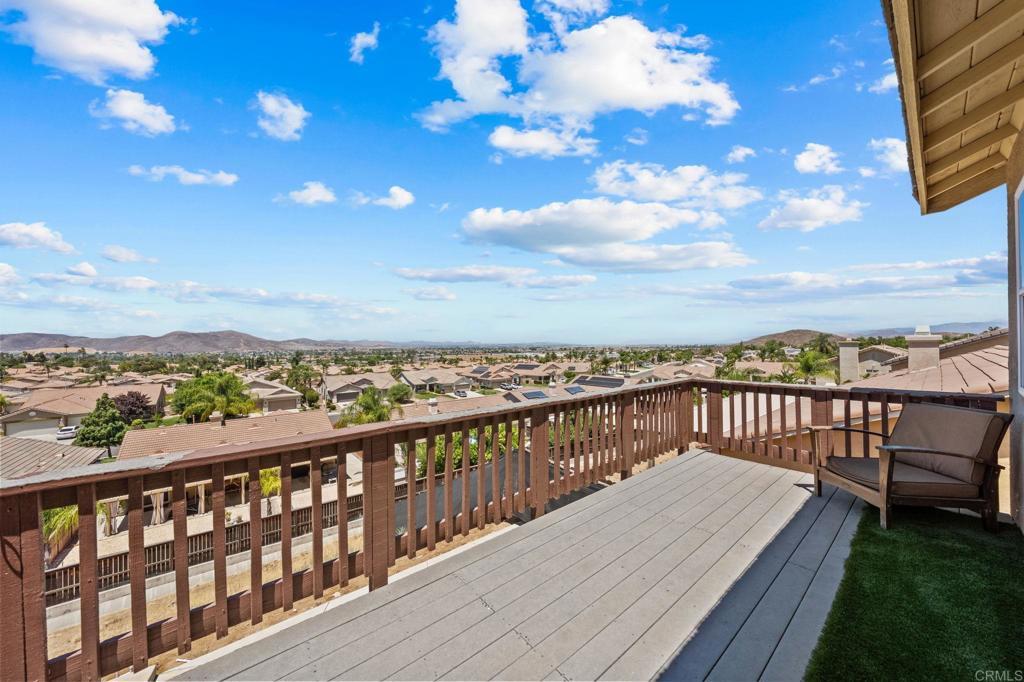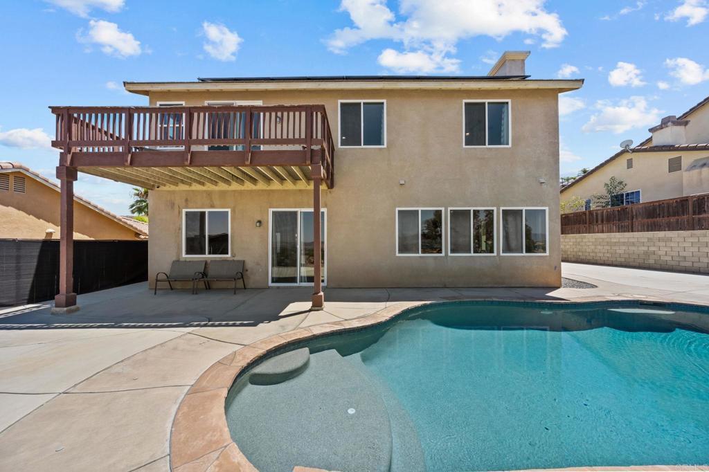 Welcome to your dream home in the heart of Menifee! This spacious 6-bedroom, 3-bath property offers over 3,250 square feet of thoughtfully updated living space on a quarter-acre lot—complete with RV parking and low-maintenance artificial turf in the front yard for effortless curb appeal. Inside, you’ll find a bright, open-concept layout with formal living and dining rooms, a large great room with a fireplace, and a gourmet kitchen featuring granite countertops, a center island, and a walk-in pantry—ideal for hosting or everyday living. A main-floor bedroom and full bath provide flexible options for guests, in-laws, or a home office. Upstairs, the expansive primary suite features a private view deck, walk-in closet, and spa-inspired bath, providing a serene retreat for you. You’ll also find a generous bonus room—perfect as a media room, game room, or additional lounge space for the whole family. The two-car garage boasts a sleek epoxy floor, providing added durability and style. Step outside to your backyard oasis with a sparkling PebbleTec pool and spa, framed by mountain views and room to entertain, relax, or play. Energy-efficient solar panels help keep your electric bills low. Located near top-rated schools, parks, and shopping, this move-in-ready home truly has it all.