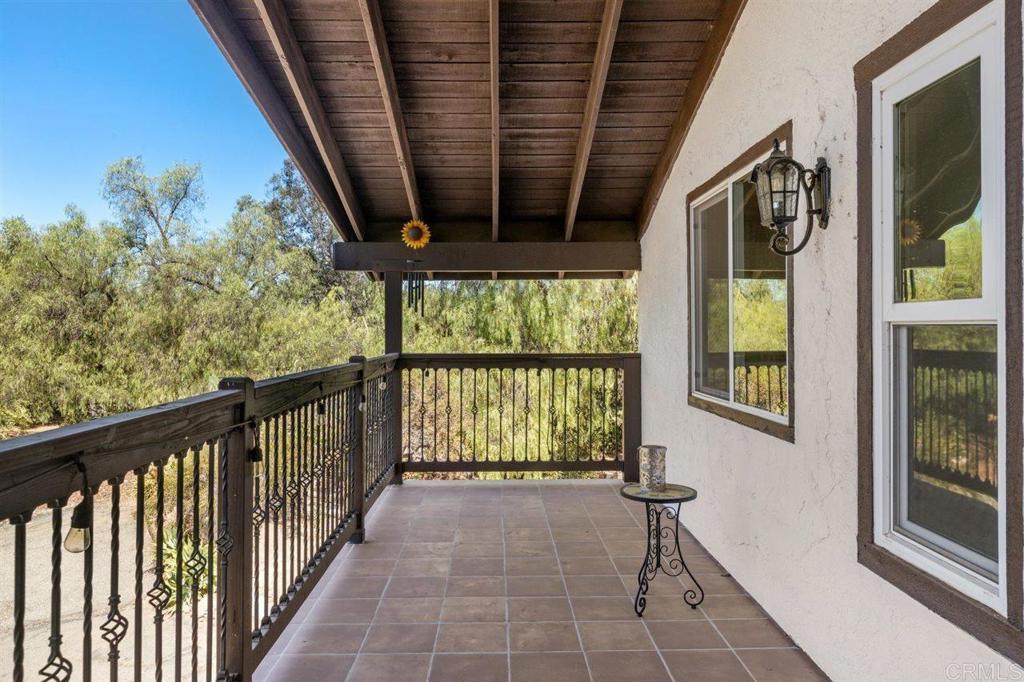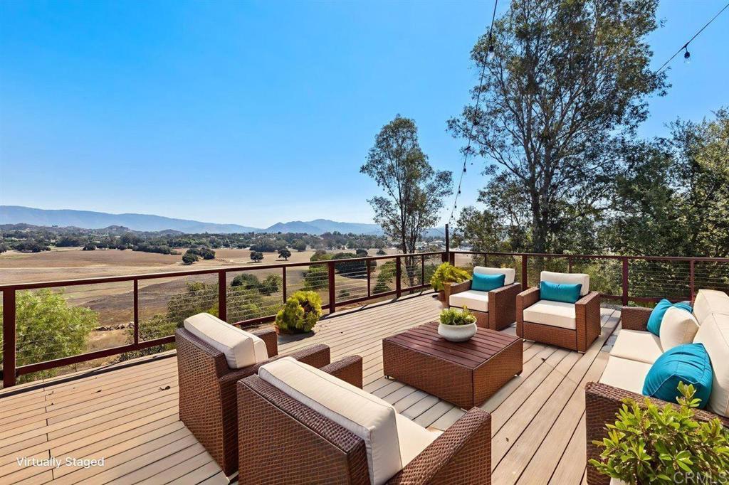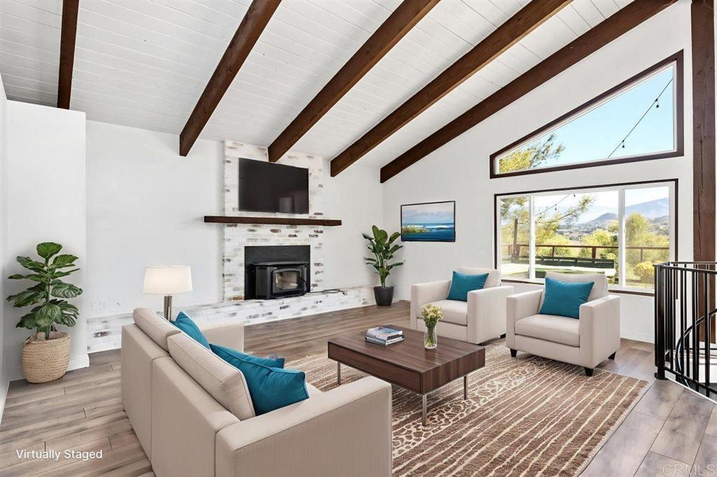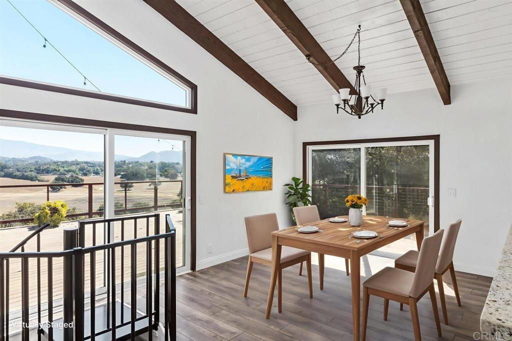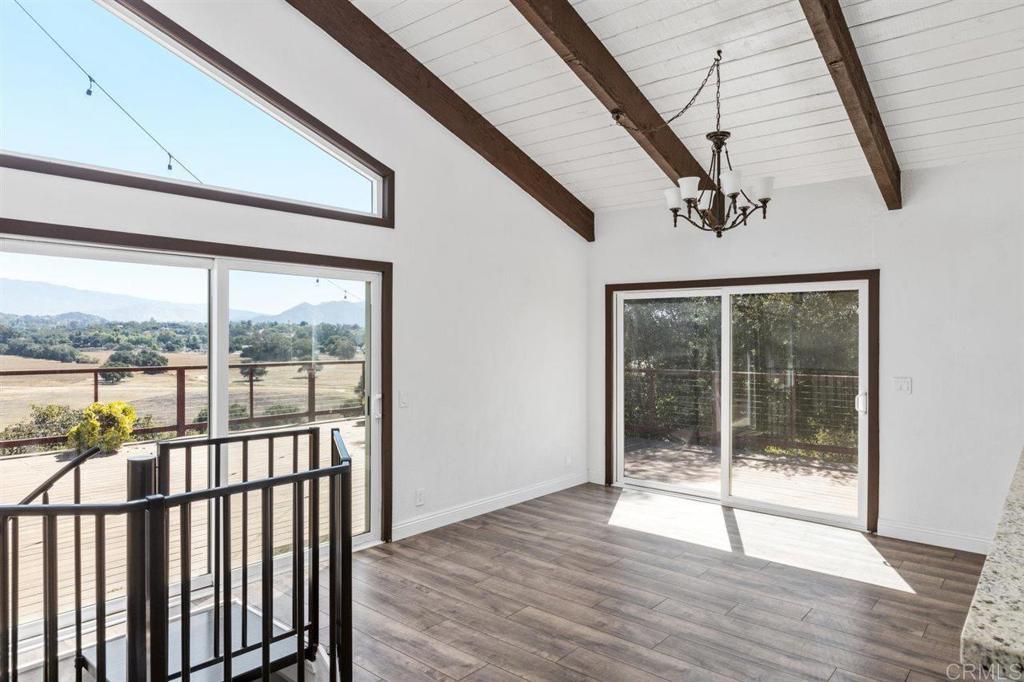 Perched on 2.08 acres with jaw dropping panoramic views of Palomar Mountain and Valley Center’s rolling hills, this unique and extensively renovated split-level property offers space, privacy, and charm in every direction. From the gated circular drive, you will find a blend of modern updates and timeless country character. Freshly painted inside and out, the home features new luxury vinyl plank flooring throughout, updated ceiling fans, a modern new spiral staircase railing, and so much more! The main level’s freshly painted light and bright vaulted open-beam ceilings and dramatic great room look out to WOW views and set the stage for everything from cozy nights by the wood-burning fireplace to lively gatherings. The entertainer’s kitchen features granite counters, an oversized island with cooktop, a walk-in pantry, and ample cabinetry. The dining area opens to an expansive, zero-maintenance EON wrap-around deck where you can enjoy breathtaking sunsets and starlit skies. The primary suite includes a brick fireplace, private balcony, and a spa-like bath with a freestanding tub. The extensively renovated lower-level bedroom and living space offers endless possibilities for a gym, guest suite, multi-generational living. Outdoors offers a playground for all ages; wander winding paths through lush landscaping, explore the unique whimsical replica western mine, or garden in the fenced vegetable beds. Pipe corrals are ready for horses, and a versatile outbuilding can serve as a workshop, art studio, office, playroom or whatever you can envision! Additional features include an attached 3-car garage with built-in cabinets and workbenches, leased solar ($303/mo), and no HOA! Truly an enchanting property not to miss!