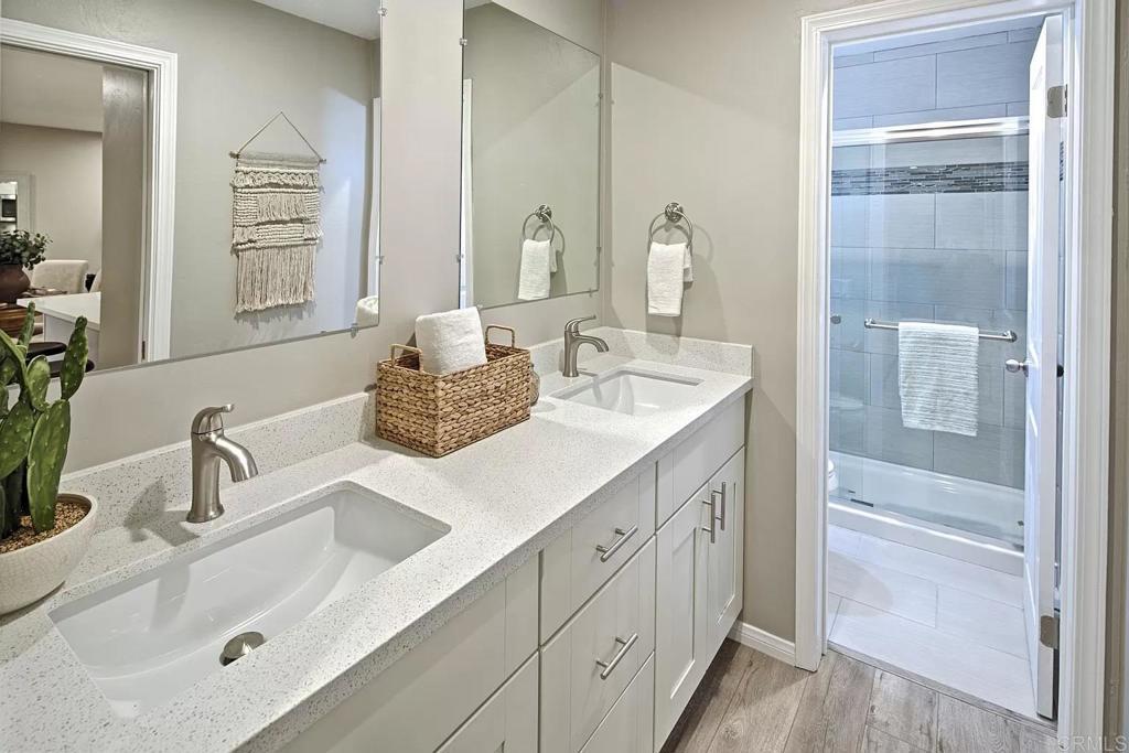 Owner is open to negotiations to close quickly. Full reno in 2019, the home features, new A/C, new plumbing, electrical panel & circuits, lighting, & finishes. The stunning kitchen showcases solid wood cabinetry, white quartz countertops, oversized deep sink & new stainless steel appliances. The bathroom is equally refined, with dual vanity sinks, mosaic-tiled shower walls & modern fixtures. Additional upgrades include new closets & doors, wood flooring, recessed lighting & drywall ceilings, giving the home a bright, contemporary feel. This first floor corner unit has exceptional privacy with no shared walls, & a quiet interior location free from street noise. From the private patio, take in serene lagoon & lush garden views—a tranquil setting that’s just steps from the main lobby, gym, package room, library, & pool. A rare highlight, this home includes a dual mini-split A/C & heating system with separate zones for the living & bedroom—a premium comfort upgrade found in very few units at The Plaza. Your prime reserved garage parking space is located on the lower level, offering one of the widest stalls in the complex, large enough to fit a full-size vehicle such as a Ford Raptor. Residents of The Plaza Condominium Association enjoy four pools / hot tubs, a fully equipped gym & sauna, tennis courts, clubhouse & beautifully landscaped courtyards with a tranquil lagoon. Just minutes from the beach, bays, Garnet Ave, and iconic Pacific Beach dining & nightlife, the home has unmatched walkability—making this the ultimate beach-city lifestyle destination.