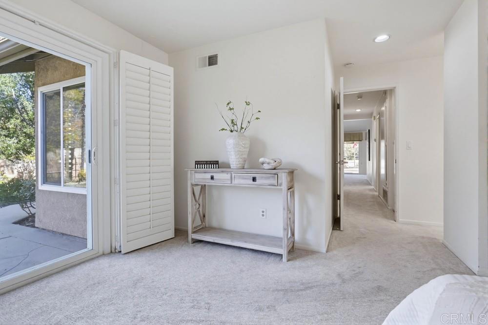 Located at the end of a quiet cul-de-sac, this charming corner-lot Villa offers exceptional privacy and an expansive yard with multiple patios and a shaded arbor—perfect for outdoor living. Inside, high ceilings and tubular skylights create a bright and airy atmosphere throughout the open floor plan. This home features 2 bedrooms plus an optional room ideal for a home office, den, or potential 3rd bedroom, along with 2 full baths. The spacious kitchen includes a breakfast counter and opens seamlessly to the living areas, while sliding glass doors provide easy access to the outdoor patios. Plantation shutters are featured throughout. The Pala Mesa Fairway community offers wonderful amenities including two pools and access to a golf course. Conveniently located with excellent access to the I-15 freeway.
