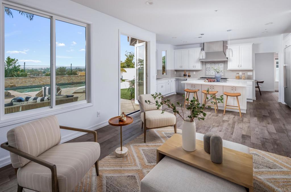 This stunning 5-bedroom, 3-bath, 2,749-square-foot home combines timeless design with modern upgrades in one of Encinitas’ most desirable neighborhoods. A beautifully landscaped front yard with lush tropical plants, turf and a hardscaped patio creates exceptional curb appeal. Inside, the formal living room features high ceilings and large picture windows that fill the space with natural light. The open layout flows seamlessly from the living room to the dining room, then into the designer kitchen and family room, all overlooking the resort-style backyard. The chef’s kitchen is thoughtfully designed with a large center island, counter seating, premium appliances including a Viking 6-burner range with griddle, and a convenient passthrough to the dining room—perfect for entertaining. The adjoining family room offers easy access to the backyard through French doors, creating an effortless indoor-outdoor connection. The first floor also features a spacious bedroom and full bath with a walk-in shower, ideal for guests or multi-generational living. A dedicated laundry room with built-in cabinetry and a sink station adds convenience. The backyard is a private tropical oasis with a sparkling pool, swim-up bar stools surrounding a sunken barbecue island and bar, a cozy fire pit, and a mix of turf, hardscape, and mature palm trees for a perfect blend of relaxation and fun. Upstairs, the primary suite enjoys tranquil views, a fireplace, and a spa-like bath with dual vanities, soaking tub, and walk-in shower. Three additional bedrooms share a beautifully updated bath with dual sinks and a tub-shower combo. Additional highlights include a 3-car garage, tile flooring downstairs, carpet upstairs, owned pool solar, leased home solar, custom window coverings, and designer lighting and hardware throughout. Located in the heart of Encinitas, just moments from top schools, shops, dining, cafes, Trader Joe’s, Sprouts, the Botanic Garden, hiking trails, and only two and a half miles from the beach.