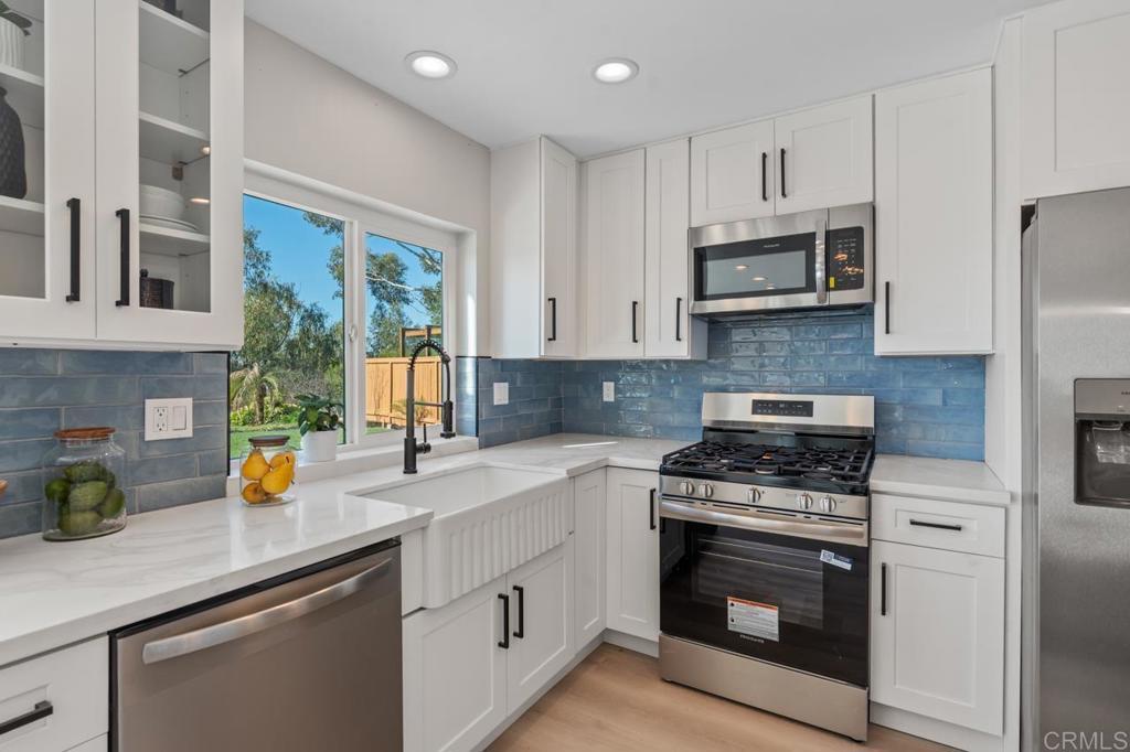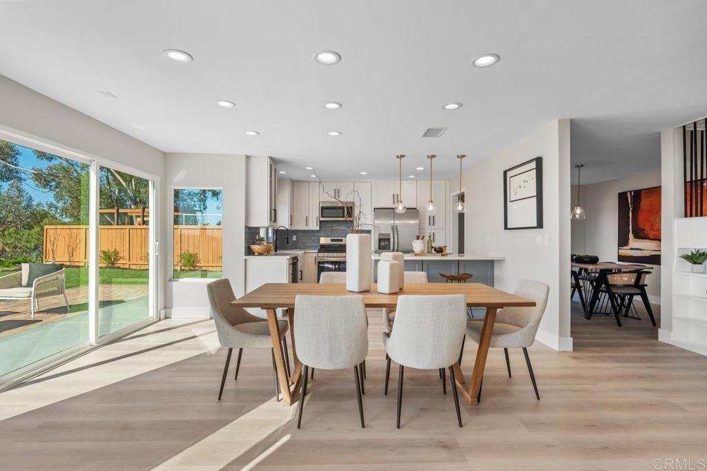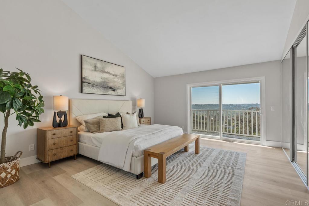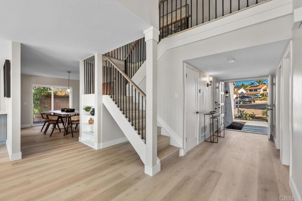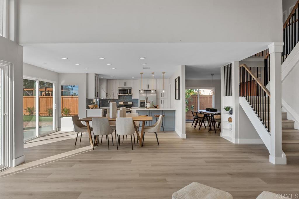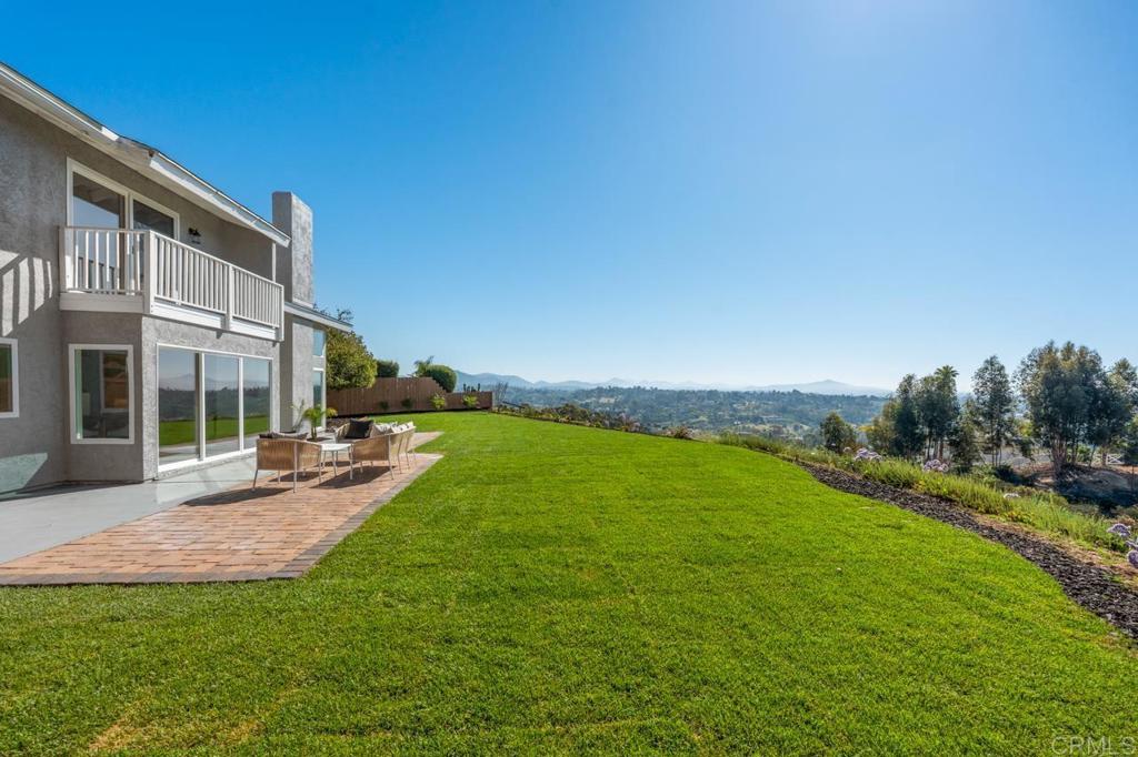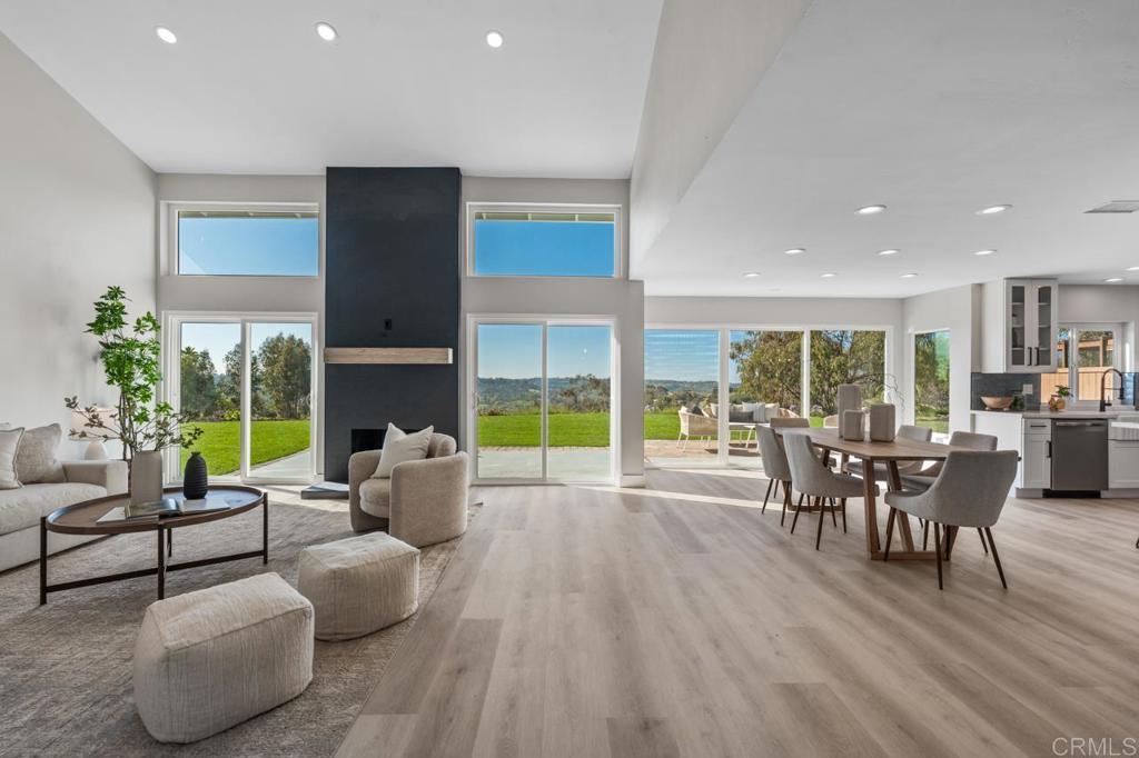 Completely remodeled and ideally located at the end of a premier cul-de-sac, this exceptional Encinitas home offers sweeping 180° panoramic valley and mountain views with a true great room design spanning the entire rear of the home. The open floor plan was reimagined to create a seamless connection from the kitchen through the main living areas, all oriented toward breathtaking panoramic views of rolling hills, canyon, valley, and surrounding natural landscape. With a comprehensive interior and exterior renovation, high-end finishes throughout, and expansive indoor-outdoor living spaces designed to capture the views, this home represents a rare combination of thoughtful design, privacy, and dramatic scenery in one of Village Park’s most sought-after locations.The home was thoughtfully reconfigured with removal of an interior bearing wall to create a true great-room layout and installation of an expanded sliding door system to maximize the panoramic valley views. All structural improvements were completed with City of Encinitas permits and finaled with Certificate of Occupancy. Approaching the home, you immediately notice the quiet end-of-cul-de-sac setting and the newly redesigned front landscape with drought-tolerant plantings that complement the natural surroundings. Inside, soaring ceilings and an abundance of natural light create an immediate sense of openness. As you enter, your eye is drawn through the main living area directly to the sweeping panoramic valley and mountain views beyond. The interior has been fully renovated with new windows, updated lighting, new outlets and fixtures, new shaker-style interior doors with updated handles and hinges, mirrored closet doors, six-inch baseboards, and extra-wide luxury vinyl plank flooring throughout.The main living areas were completely reconfigured to create a true great room overlooking the incredible panoramic views. A wall was removed (with permits) to open the space from end to end, connecting the kitchen, breakfast area, and family room into one expansive living environment designed for entertaining and everyday living. At the center of the room is a dramatic custom two-story fireplace finished with custom black tile and accented by a large white oak mantle, creating a striking architectural focal point. The fully custom kitchen has been thoughtfully opened and redesigned with both style and function in mind. It features an oversized center island with breakfast bar seating, quartz countertops, a glazed ceramic artisan subway tile backsplash, custom soft-close cabinetry, and all new stainless steel appliances. A Signature Curington farmhouse single-basin fireclay sink sits beneath new windows framing the landscape, while Xidane Alturas gold pendant lighting highlights the island. Cooking has been upgraded from electric to gas, making the kitchen as functional as it is beautiful. Large new windows and sliding doors throughout the home maximize the incredible scenery. A dual sliding door system adjacent to the kitchen has been expanded to a triple-panel configuration, creating a seamless indoor-outdoor connection and allowing the entire great room, breakfast area, and living room to open directly to the backyard and views beyond. The flexible Village Park floor plan offers five bedrooms and three bathrooms, including a bedroom and full bathroom on the main level, ideal for guests or a home office. All bathrooms have been completely remodeled with new custom cabinetry, coastal gray quartz countertops, new tile flooring, backlit mirrors, and new fixtures. Upstairs, the oversized primary suite enjoys elevated panoramic views of the canyon, valley, and surrounding hillsides. The suite features a newly built private balcony overlooking the open space, creating the perfect setting for morning coffee or sunset evenings while taking in the scenery. The backyard has been redesigned to take full advantage of the pie-shaped lot and unobstructed views. Fresh sod provides open space