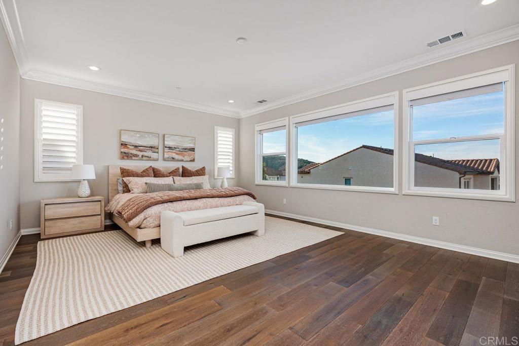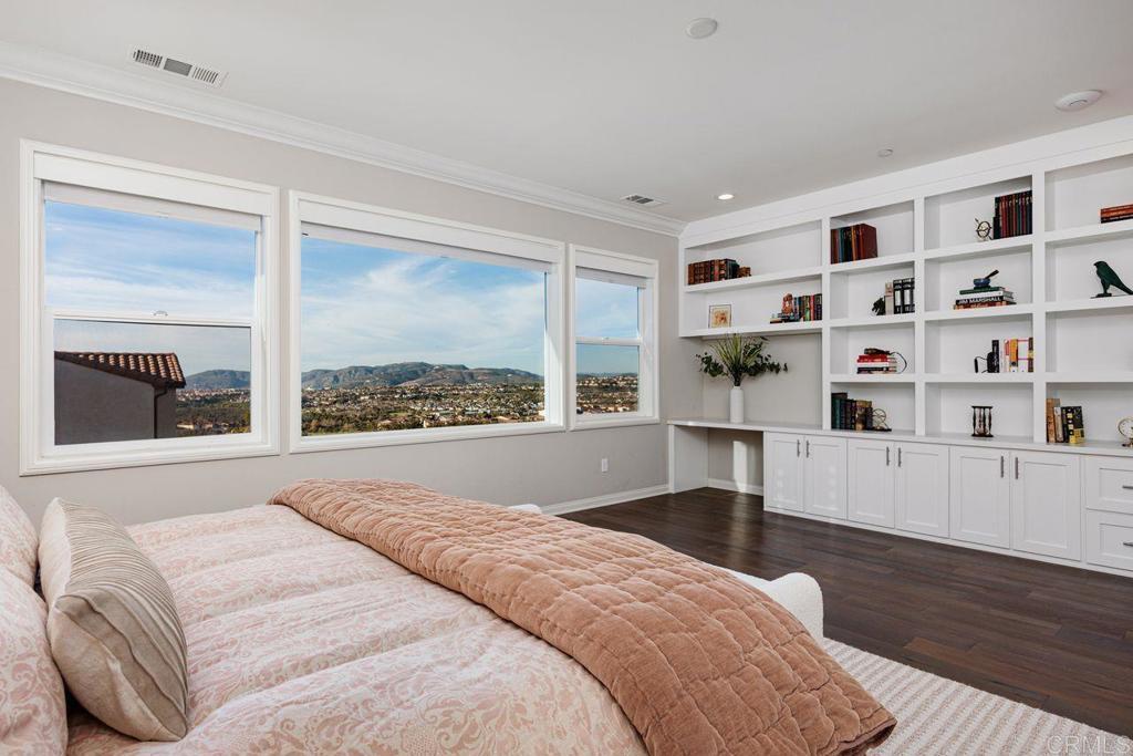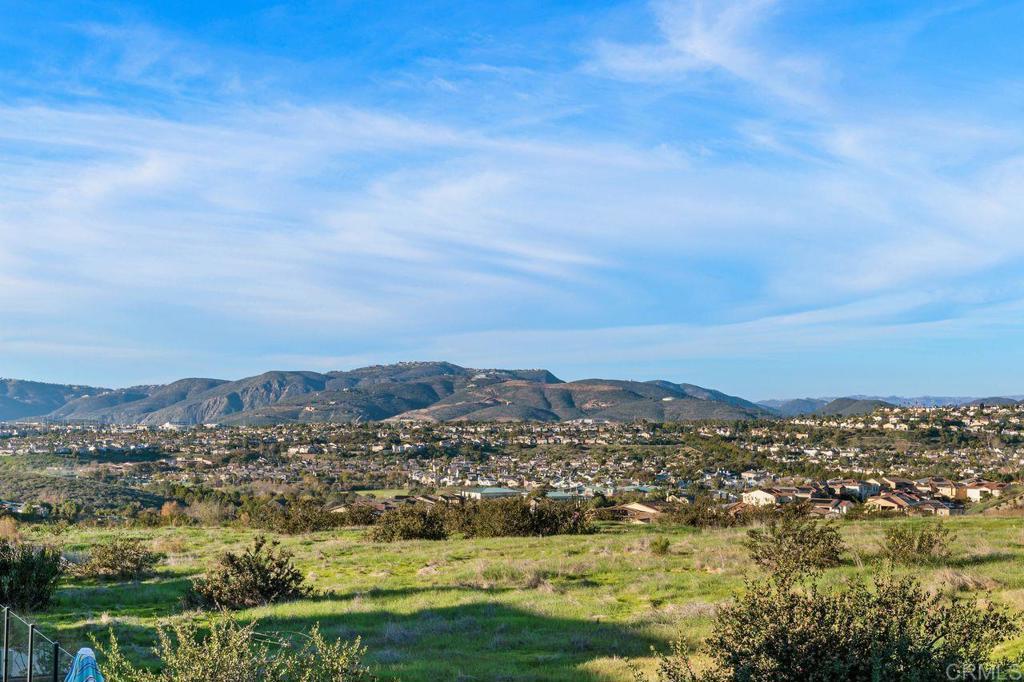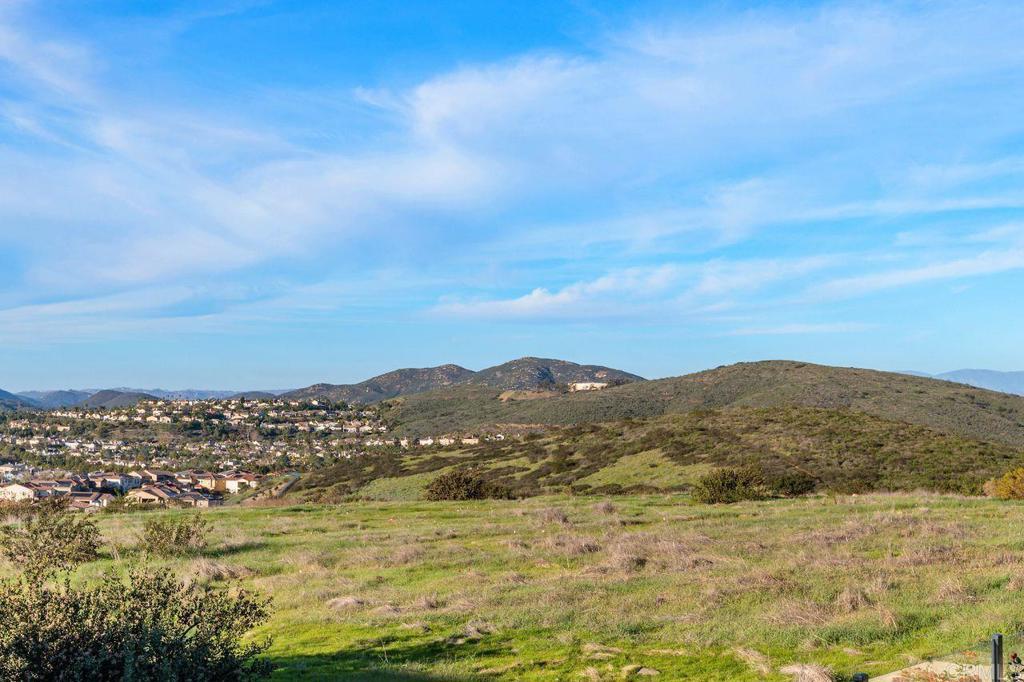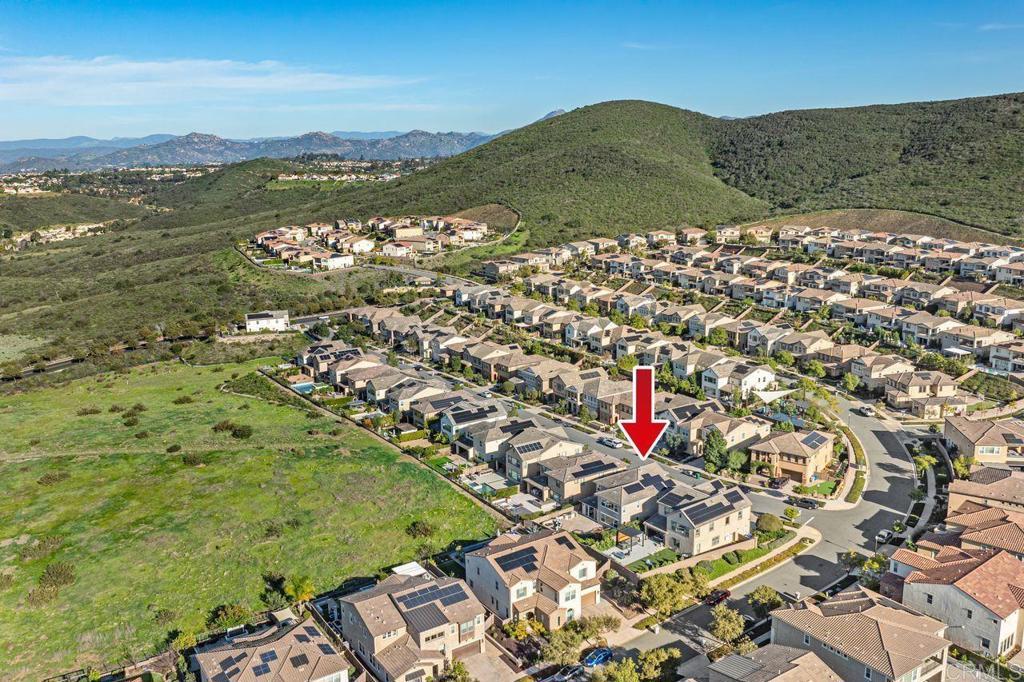 Welcome to your over 3,000 square foot home in the prestigious Heritage Bluffs, featuring five bedrooms and three bathrooms. Offering beautiful views of the surrounding hills with plenty of natural light. Enter to beautiful woodwork in the foyer. This unique property has an added fifth bedroom upstairs and expanded downstairs providing additional living space. Full bedroom and bathroom downstairs. The home features an open layout, a spacious kitchen with a large island and bar seating open to two family rooms. Beautiful hardwood flooring throughout the downstairs and upstairs. This is in immaculate condition with numerous upgrades, including a fully paid off solar system, with a Tesla home battery and 220v car charger. Save money with a newer HVAC unit. Wake up to peaceful mountain views from your Master bedroom which also features a large walk-in closet. Large upstairs laundry room. The 2 car garage sports plenty of custom built in storage cabinets. The open backyard provides a quiet and tranquil outdoor space great for playtime and entertaining. This property is ideally located in the top rated Poway Unified school district and next to Oak Valley Middle School. Nearby, you'll find easy access to trails, shopping, and dining, allowing for a convenient and exceptional California lifestyle. This home is perfect for those seeking a spacious, well-maintained residence in a desirable location.