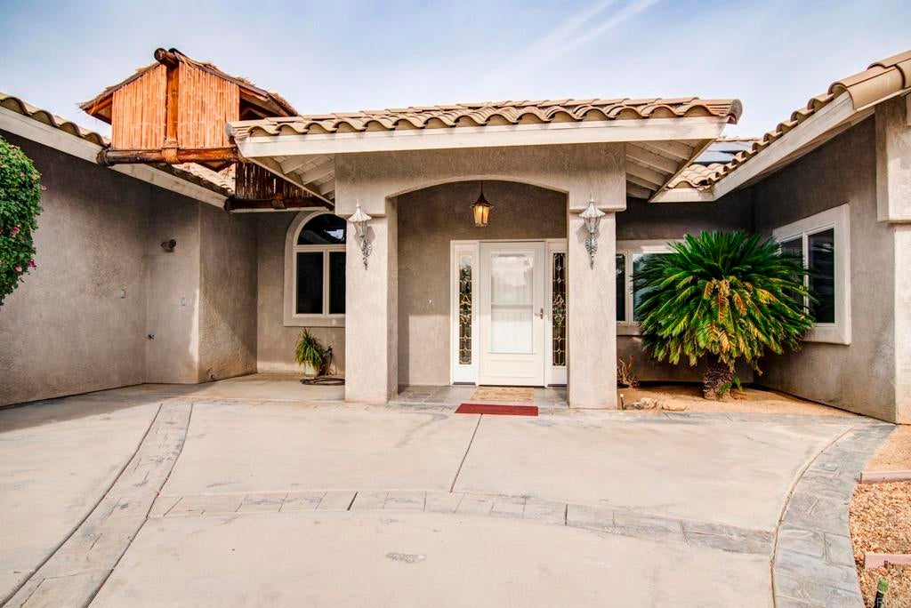 Situated on the golf course at DeAnza Country Club, this contemporary custom home offers 2,498 square feet of well-designed living space with sweeping golf course and mountain views. The open floor plan is highlighted by vaulted ceilings, recessed lighting, and ceramic tile flooring, creating a bright and airy atmosphere throughout the main living areas. The spacious kitchen flows seamlessly into the living and dining spaces, making it ideal for both everyday living and entertaining. The large primary suite is a private retreat, featuring a walk-in closet and a well-appointed bathroom with soaking tub, separate shower, and dual vanities. For added privacy, the primary bedroom and guest bedrooms are thoughtfully located on opposite sides of the home. Out back, the home truly shines as an entertainer’s retreat. A backyard kitchen and palapa create an inviting outdoor living space, complemented by a concrete pad and dedicated electrical ready for a spa—perfect for relaxing while enjoying the golf course and mountain views. Comfort is enhanced year-round with a combination of central air conditioning, a mini-split system, and a swamp cooler. Additional features include leased solar, a two-car garage, and generous indoor-outdoor connections that take full advantage of the desert setting and DeAnza Country Club lifestyle. This is a distinctive desert contemporary home offering space, privacy, and exceptional outdoor living in a premier golf course location. Leased solar.