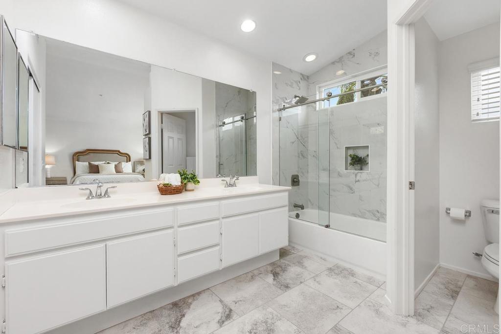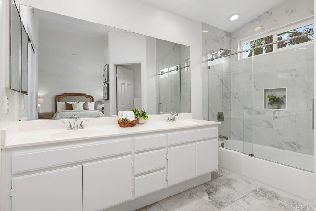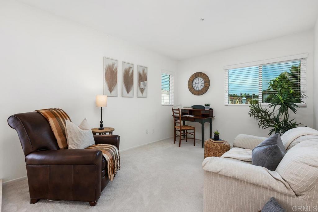 Discover this meticulously maintained home nestled within the gated community of Heritage-Legends. Designed for effortless living, this residence offers comfort, style, and all the amenities you need to move right in and enjoy the next chapter of your life. In 2023, the kitchen received a comprehensive update featuring elegant quartz countertops, crisp white cabinetry, new stainless steel appliances, and modern large-scale tile flooring. The open-concept layout connects the kitchen to a charming dining area, where French doors in two locations lead out to a secluded back patio — perfect for entertaining guests in privacy and comfort. Adjacent to the kitchen and dining area is a cozy living room, complete with a gas fireplace for relaxing evenings or binge-watching your favorite shows. Conveniently located on the main floor is a powder room and direct access to the two-car garage. The garage is equipped with a newer washer and dryer and provides easy entry to the back patio for ultimate convenience. Upstairs, a versatile loft area offers plenty of options — whether you need a home office, workout space, or a potential third bedroom. A secondary bedroom and guest bath are ideal for family or visitors, ensuring everyone feels at home. The primary suite is a true standout, featuring vaulted ceilings that create a spacious atmosphere. Two closets provide for ample storage, and the attached ensuite bath has been recently updated and includes a tub/shower combination, walk-in closet, dual vanities, and a private water closet for added privacy. Heritage-Legends is a gated community offering a tot-lot and generous common areas for children and pets to enjoy. Located within Shadowridge (Vista), residents are moments away from Buena Vista park, which features three miles of scenic walking trails and a duck pond. Additional nearby amenities include Shadowridge Golf Course, Buena Vista Ball Fields, top-rated Rancho Buena Vista High School, as well as a variety of shops and restaurants. Discover the exceptional amenities and stunning natural surroundings available in the Shadowridge community.