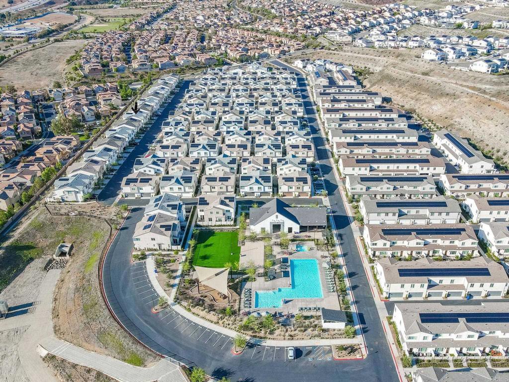 Welcome to 35190 Blossom Place, an elegant residence located in the Zutano at Citro community. This duet-style home is situated in a PREMIUM location with OWNED Solar, backyard w/ turf, no neighbors behind, offering peaceful views of rolling hills and beautiful sunset backdrops. Built in 2022, the home features 1,461 square feet of living space with 3 bedrooms, 2.5 bathrooms, and a bright, open-concept layout filled with natural light. With only one shared wall, it provides enhanced privacy and a more detached-home feel. Additional highlights include smart home features and energy-efficient systems designed to help keep utility costs low. A 2-car garage plus a 2-car driveway offer ample parking, while the fully landscaped backyard with turf and a patio creates a low-maintenance space ideal for relaxing or entertaining. At the popular Citro community, you’ll have access to resort-style amenities including a pool, spa, rec center, and playground. The Spot, Citro’s newest wellness hub, offers even more ways to enjoy an active lifestyle. Residents also enjoy 14 miles of scenic trails, a community garden, and 234 acres of open space. Surrounded by San Diego’s picturesque hillsides near Fallbrook, this home combines natural beauty with everyday convenience.