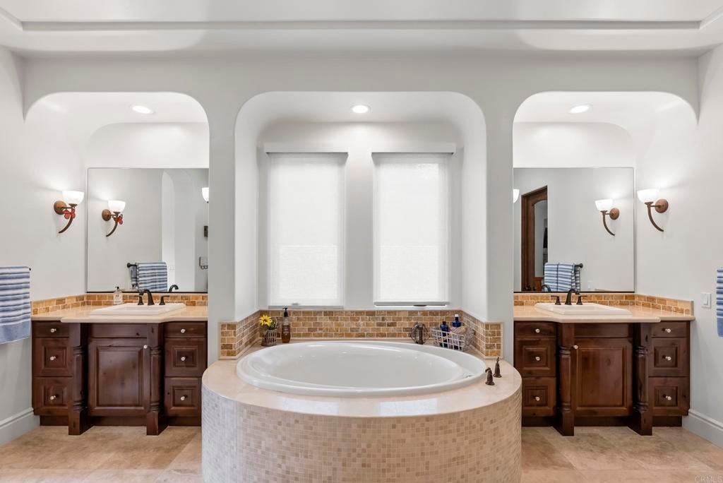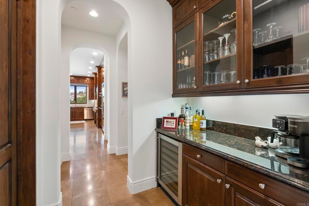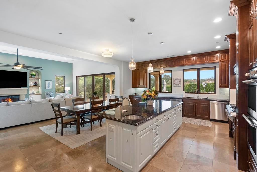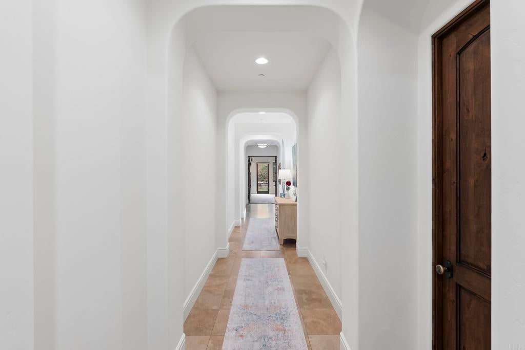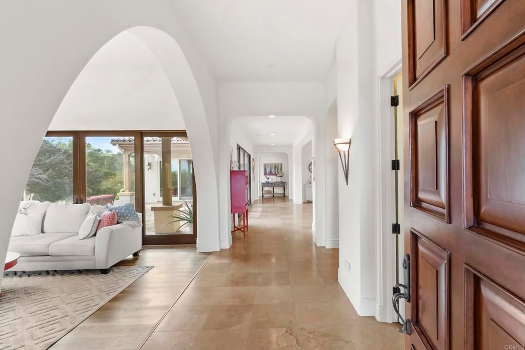 Tucked inside the gated enclave of Malabar Ranch, this SINGLE-LEVEL estate, built in 2011 by Beucler Signature Homes, offers space, privacy, and refined comfort without sacrificing convenience. Less than five minutes to the 76 freeway and 10 minutes to the 15 freeway, yet once inside the gates, it truly feels like a world away. Set on approximately two acres overlooking a preserve, this 4,800 sq ft home is designed to let you breathe. Generously sized living spaces, three bedrooms each with ensuite baths, and a spacious den/office/or fourth bedroom provide flexibility for everyday living or hosting guests. Stunning solid wood doors and windows frame the surrounding views and invite the outdoors in, highlighting the craftsmanship and quality materials throughout. At the heart of the home, the kitchen balances warmth and performance with high-quality cabinetry, a large island, subway tile backsplash, custom tile over the cooktop, dual walk-in pantries, and a butler’s pantry/wet bar. Thermador appliances include a built-in refrigerator, 6-burner range with griddle, double ovens, microwave, warming drawer, and dual dishwashers. Remote control gas fireplaces add instant charm in the family room, living room, dining room, and primary suite. The primary retreat also features a wet bar, soaking tub, and dual-head shower. Outside, life slows down. Enjoy open views from the saltwater pool and spa, gather around the outdoor kitchen and covered dining area with TV, unwind by the courtyard fireplace, or practice on the putting green. Whole-house water filtration, instant hot-water circulator, central vacuum, epoxy-coated floors in the 4-car garage, and public water and sewer add everyday ease. Space. Quiet. Comfort. And still close to everything.