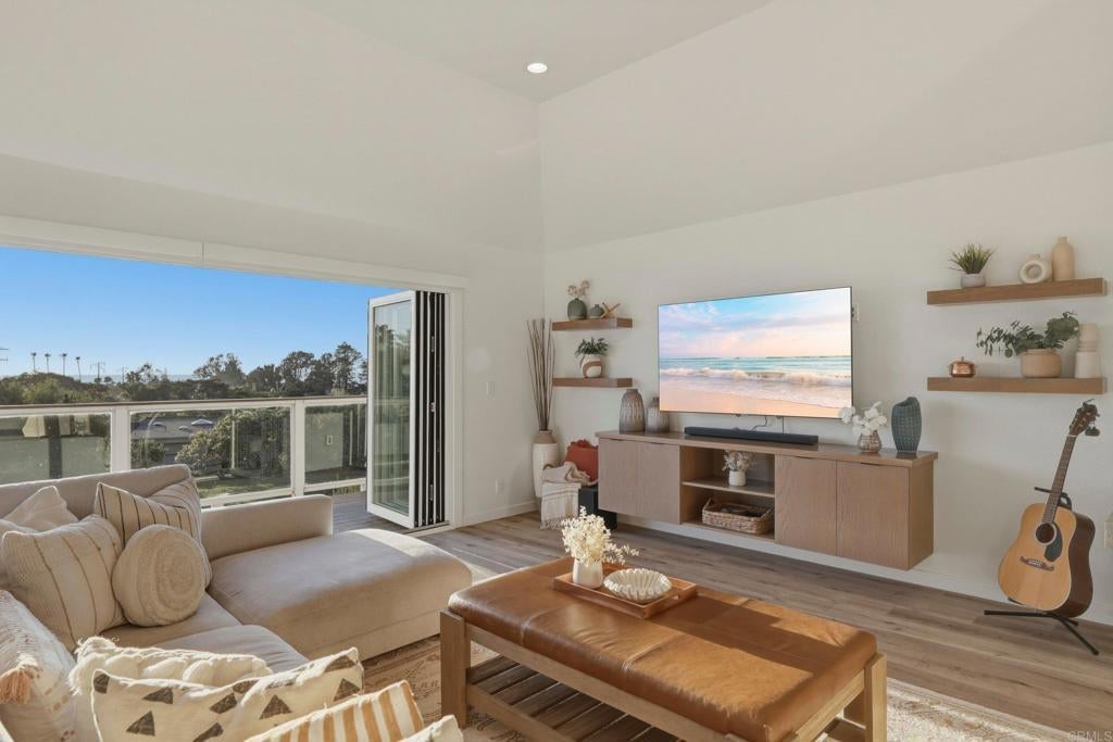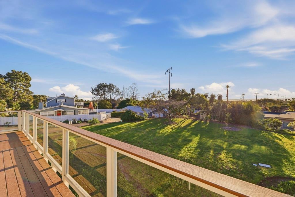 Perched in Leucadia with stunning panoramic ocean views, this 3 bedroom, 3 bathroom home offers abundant natural light and an effortless coastal feel throughout. Recently refreshed with fresh interior paint and newly installed uniform plank flooring throughout, the home feels bright, cohesive, and move-in ready from the moment you arrive. Upon entry, you are welcomed by soaring ceilings and numerous windows that fill the space with natural light. A wraparound deck extends the living area outdoors, creating the perfect setting for entertaining or relaxing while taking in sunset views over the ocean. The family room is centered around a fireplace and showcases the coastal views, with an adjacent dining area that flows seamlessly into the kitchen. Designed for both everyday living and entertaining, the kitchen features a large island with waterfall countertops, a Miele convection oven, Fulgor oven, Frigidaire Professional refrigerator, coffee bar area, floating shelves, and a custom pull-out pantry. Newly installed remote-controlled window coverings in the dining area and living room add both convenience and a clean, modern touch. The main level includes a bedroom and full bathroom, offering flexibility for guests or a home office. Downstairs, the spacious primary suite features an en suite bath with white quartz countertops, a soaking tub, separate shower, and a walk-in closet with built-ins. Remote-controlled window coverings in the primary bedroom enhance comfort and privacy. A secondary bedroom also offers its own en suite bath, highlighted by a striking black quartz tile shower. Additional highlights include an attached two car garage equipped with a MyQ app-controlled garage door, garage camera, and a 220-volt outlet. Smart home features continue with a Schlage smart lock for keyless entry and remote access, providing added security and convenience. Located in the Skyloft community, residents enjoy access to resort-style amenities including a clubhouse, pool, spa, tennis and pickleball courts, dog park, and playground. Ideally situated just minutes from Beacons Beach, Batiquitos Lagoon, downtown Encinitas, Leucadia, Cardiff, and Carlsbad Village, you’ll have easy access to an abundance of shops, restaurants, and luxury resorts such as the Omni La Costa Resort and Spa and Park Hyatt Aviara. Combining an active coastal lifestyle with an unbeatable location, this home is truly a must see.