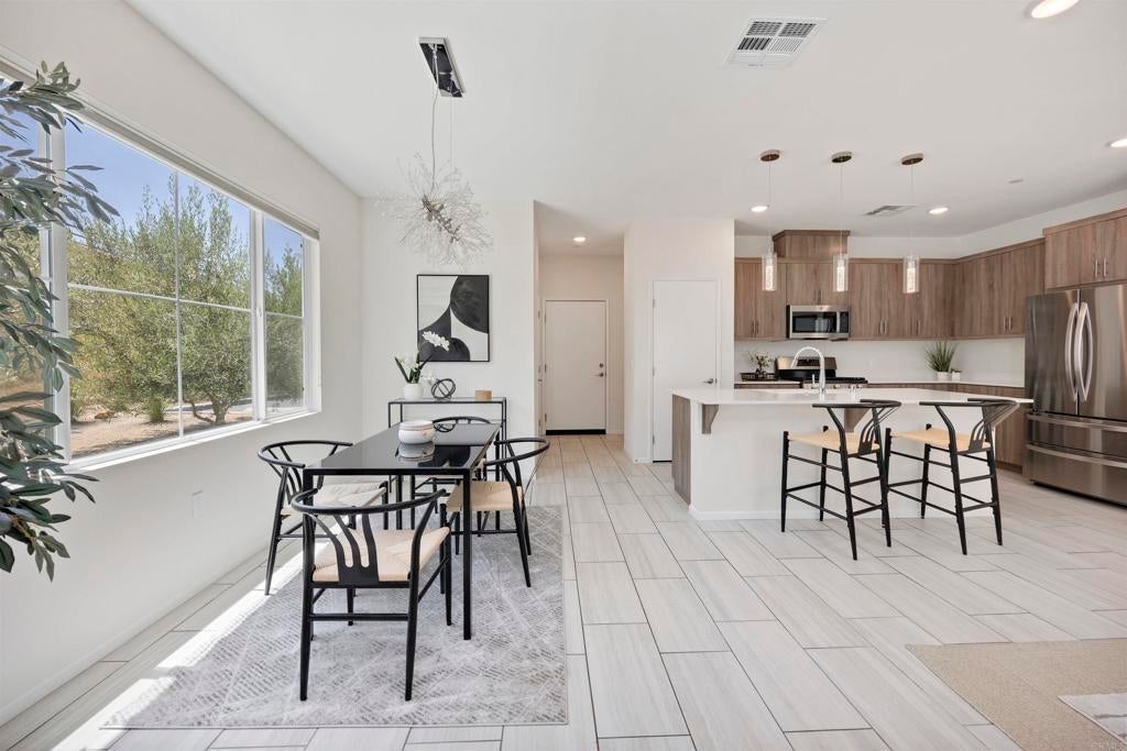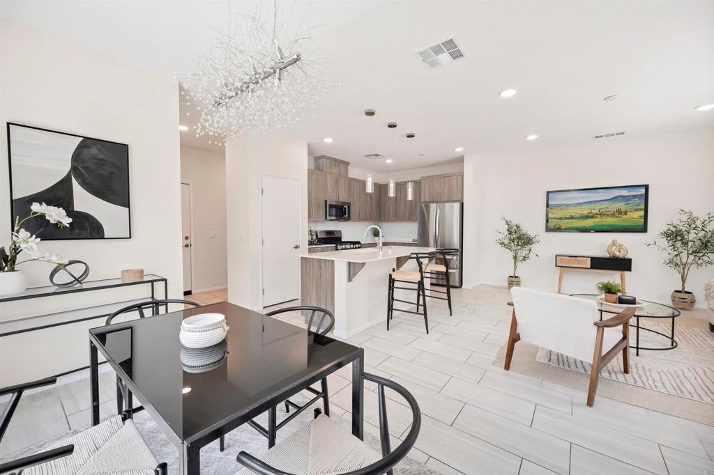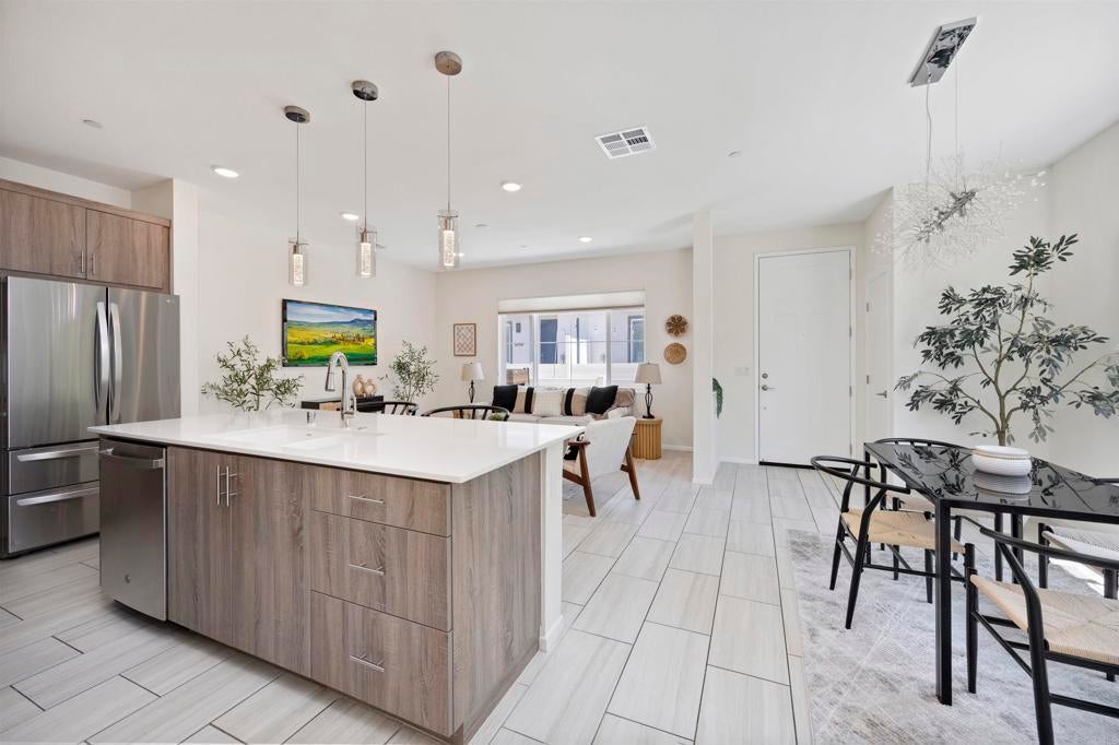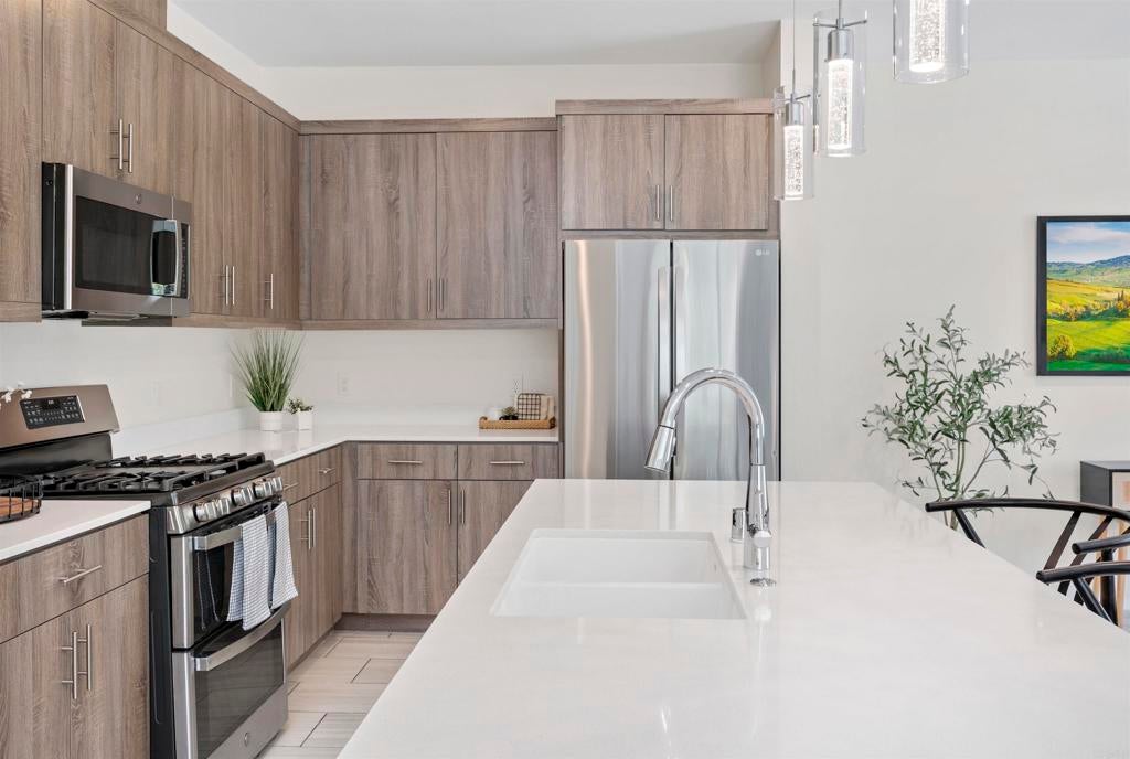 Set in the heart of Citro, Fallbrook’s premier community, this rare corner-unit blends contemporary design with a vibrant, outdoor lifestyle. This 4-bedroom, 3-bath, 1,471 sqft residence combines elegant finishes with everyday functionality. The kitchen features a large island, quartz countertops, stainless steel appliances, large pantry, water softener, and abundant storage—perfect for both casual meals and entertaining. A flexible 4th bedroom offers space for a private office or game room, while light-filled living areas open to a welcoming front porch. Additional highlights include a stackable washer/dryer, attached 2-car garage with extra storage area, and energy-efficient leased solar. Citro offers 235 acres of open space, 14+ miles of trails, a community garden, bocce ball court, clubhouse, dog park, and a resort-style pool/spa—all surrounded by scenic avocado and citrus groves.