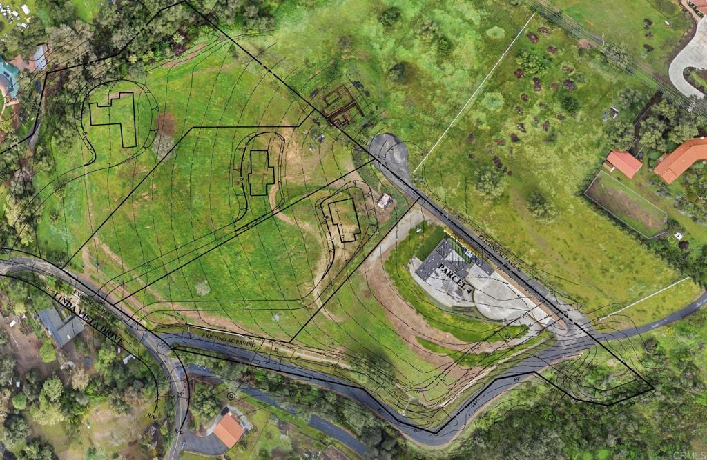 Parcel 2: 2.0 Acres: A Perfect opportunity to build your new custom dream home on one of 3 individual parcels (each listed for sale separately) or take advantage of a recently built one story home. 4 lots recently split into Parcel #1 - 3.06 Acres; Parcel #2 -2.0 Acres; Parcel #3 - 2.0 Acres; and Parcel #4 - 3.07 Acres with a recently constructed 2,703 SF Home (listed for sale on the MLS – see 3600 Linda Vista Drive, Fallbrook). Only one of the 4 lots has a home while the other 3 are ready for construction of your custom home. The builder / owner of the land has several architectural plans to choose from should you wish to use his plans. The builder / owner is open to being a consultant during your building project to ease your process. Each parcel has easy access to electricity adjacent to the lots. Water meters have been installed to each lot. Sewer will be a septic system and gas will be propane. Permitted driveway access from the public street has been recently completed to Lots 1, 2 & 3. An attached aerial photo shows a diagram of homes located on the lots building pads yet can be located anywhere on the parcel within setback requirements of The San Diego County Building Department regulations. Aerial photos also show views from the 3 unbuilt lots. The beautiful setting is rural and peaceful, and each lot has views of the surrounding hills and valleys. Property zoning is Agricultural and allows horses if desired. Building a home is up to your creativity and design. See aerial photos with diagrams overlaying the 3 land parcel layouts and topography.