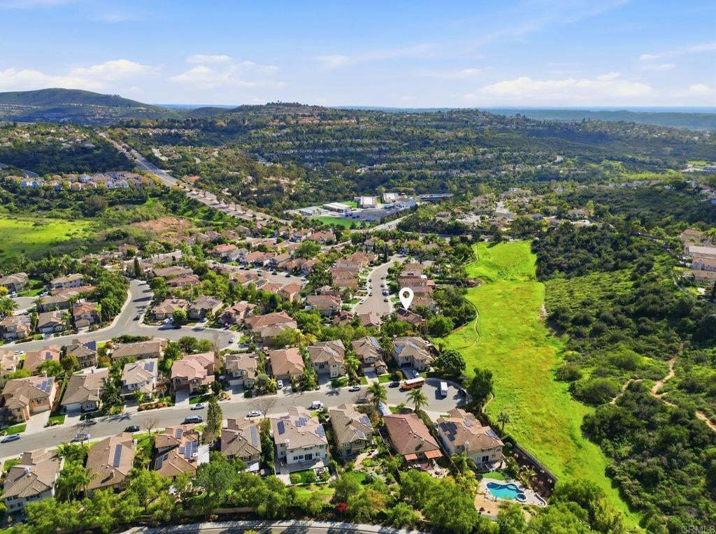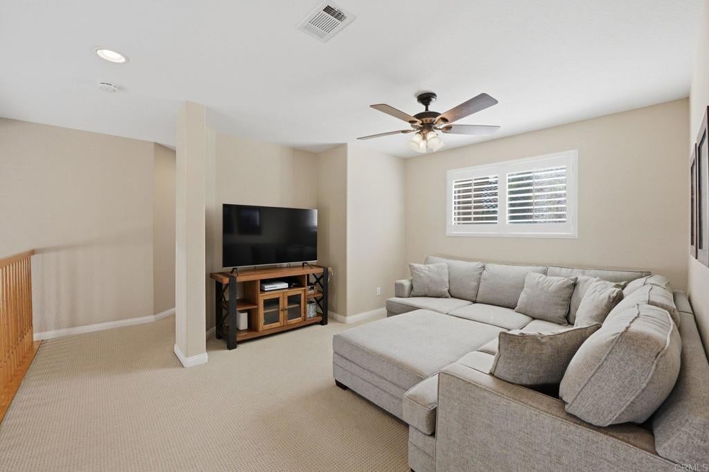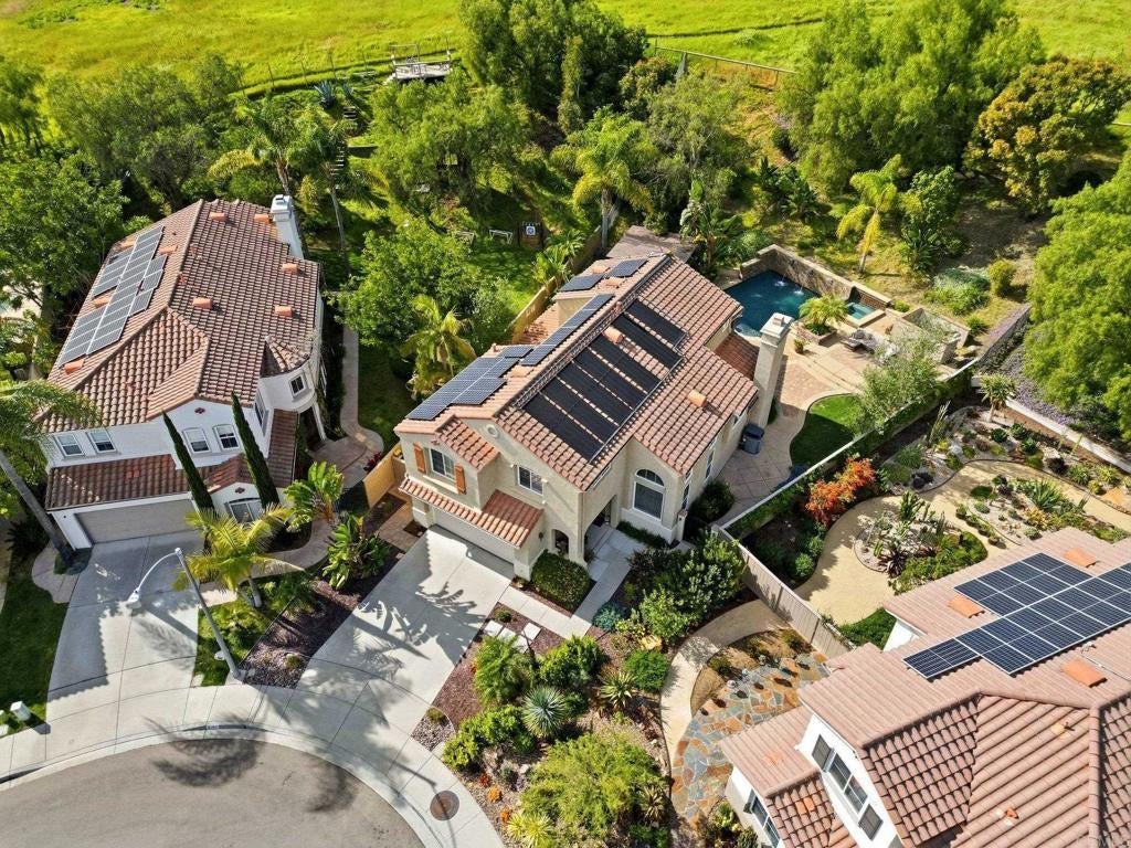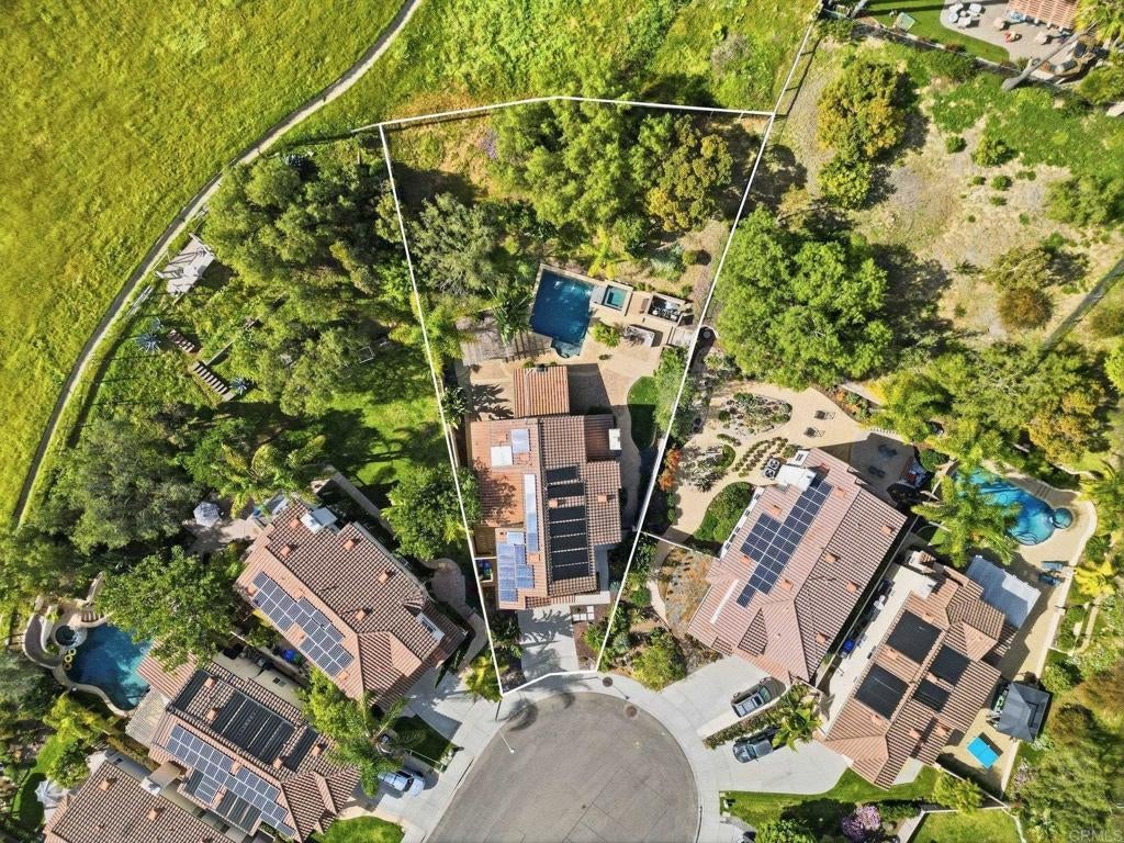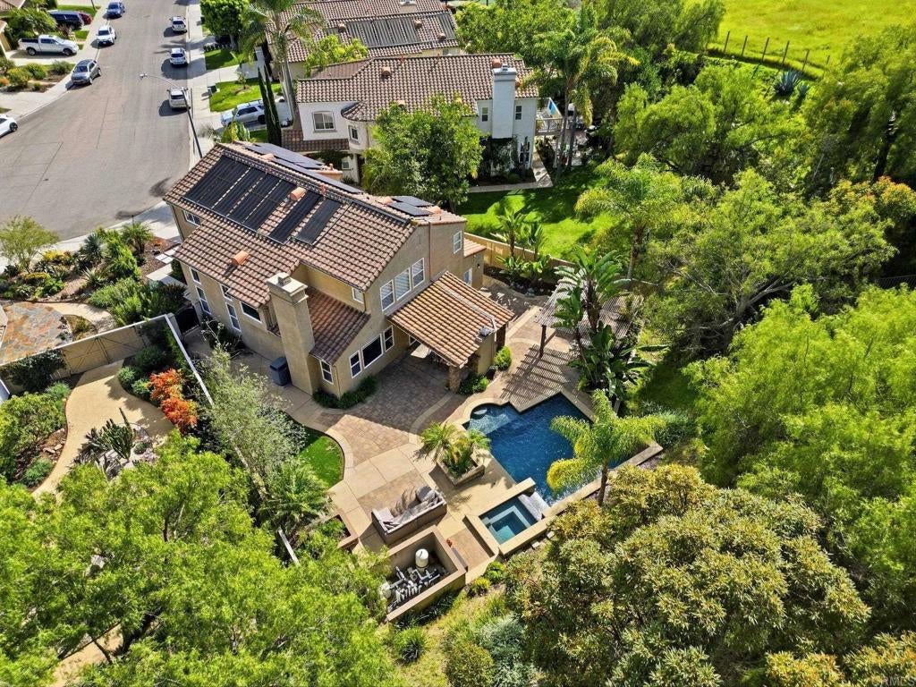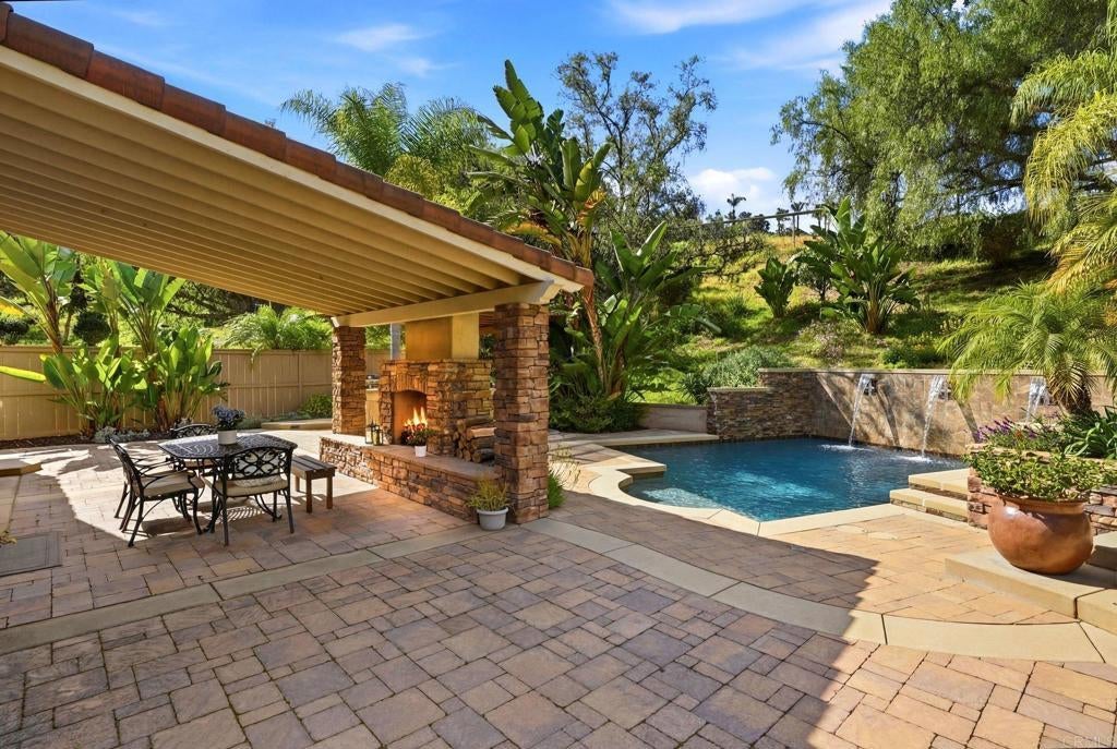 Private resort-style living in Rancho Carrillo. Tucked at the end of a quiet cul-de-sac and backing open space in the Quintana community, this original-owner home opens to a stunning backyard retreat that elevates everyday living. A solar-heated saltwater pool and raised spa with cascading water features and a custom spa-to-pool slide anchor the setting. Expansive paver patios, a covered lounge with built-in fireplace, and a fully equipped outdoor kitchen with bar seating create inviting spaces for relaxing evenings or unforgettable gatherings. Lush tropical landscaping surrounds the yard, creating a private retreat that feels like its own destination. A versatile downstairs en suite addition with exterior entrance, garage access, and backyard access to the full bath is ideal for extended family, guests, or a home office. This flexible space also offers potential for a future junior ADU conversion and rental income (buyer to verify). The kitchen with serene backyard views, center island, and built-in desk opens to the family room and backyard, reinforcing indoor-outdoor flow. Pecan wood floors warm the entry, dining, and kitchen areas, while the living room showcases vaulted ceilings with sun-filled clerestory windows enhancing the home’s airy feel. Upstairs features a flexible loft; a primary suite with views of pool and garden, dual vanities, soaking tub, upgraded shower, and spacious walk-in closet; two additional bedrooms; a hall bath with dual vanities; and a laundry room. Owned solar, A/C, and RV storage add comfort and convenience, while meticulous care reflects pride of ownership. Ideally located in the heart of Carlsbad with convenient access to top schools, dining, shopping, and everyday essentials, along with nearby recreation including nature trails, parks, beaches, golf courses, Legoland, and scenic lagoons. Enjoy the best of coastal living, then come home to your own private retreat. See Amenities and Upgrades doc uploaded to MLS