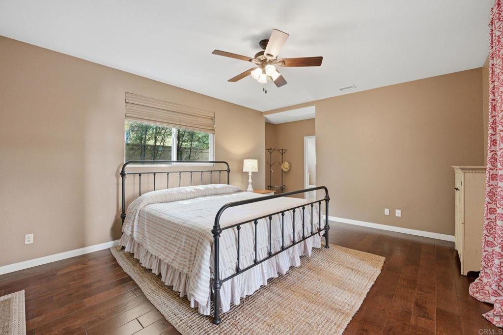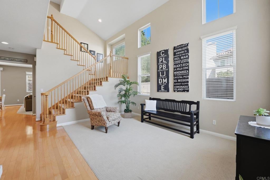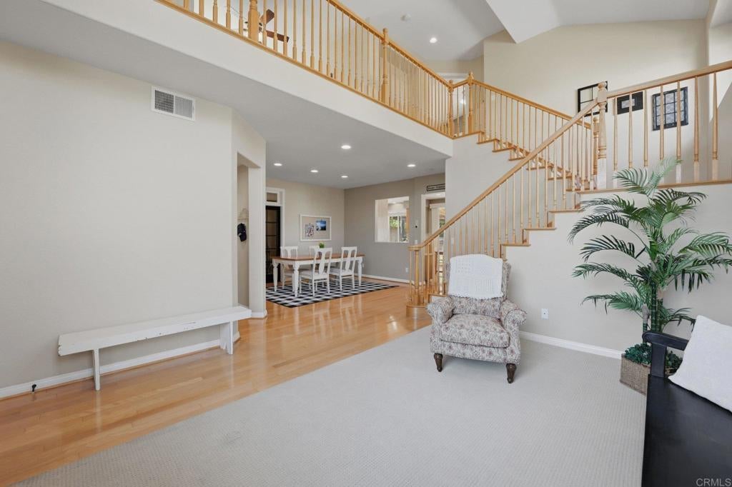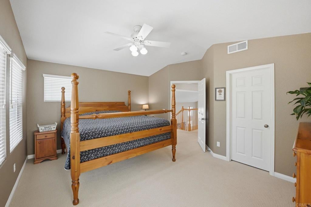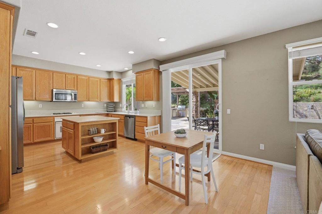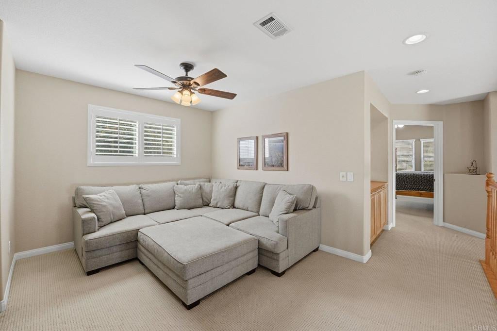 Private resort-style living in Rancho Carrillo. Tucked at the end of a quiet cul-de-sac and backing open space in the Quintana community, this original-owner home opens to a stunning backyard retreat that elevates everyday living. A solar-heated saltwater pool and raised spa with cascading water features and a custom spa-to-pool slide anchor the setting. Expansive paver patios, a covered lounge with built-in fireplace, and a fully equipped outdoor kitchen with bar seating create inviting spaces for relaxing evenings or unforgettable gatherings. Lush tropical landscaping surrounds the yard, creating a private retreat that feels like its own destination. A versatile downstairs en suite addition with exterior entrance, garage access, and backyard access to the full bath is ideal for extended family, guests, or a home office. This flexible space also offers potential for a future junior ADU conversion and rental income (buyer to verify). The kitchen with serene backyard views, center island, and built-in desk opens to the family room and backyard, reinforcing indoor-outdoor flow. Pecan wood floors warm the entry, dining, and kitchen areas, while the living room showcases vaulted ceilings with sun-filled clerestory windows enhancing the home’s airy feel. Upstairs features a flexible loft; a primary suite with views of pool and garden, dual vanities, soaking tub, upgraded shower, and spacious walk-in closet; two additional bedrooms; a hall bath with dual vanities; and a laundry room. Owned solar, A/C, and RV storage add comfort and convenience, while meticulous care reflects pride of ownership. Ideally located in the heart of Carlsbad with convenient access to top schools, dining, shopping, and everyday essentials, along with nearby recreation including nature trails, parks, beaches, golf courses, Legoland, and scenic lagoons. Enjoy the best of coastal living, then come home to your own private retreat. See Amenities and Upgrades doc uploaded to MLS