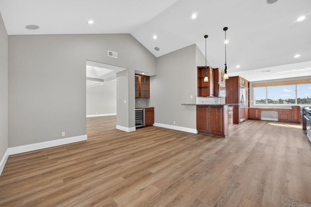 Discover breathtaking panoramic ocean views from this beautifully updated single-level, 4-bedroom home. Designed to capture natural light and the beauty of its surroundings, the home showcases soaring vaulted ceilings and an open, airy layout that creates a sense of space and comfort throughout. Elegant new flooring and highly upgraded appliances including Viking 48 inch range, Viking wine cooler and bar, Miele dishwasher, and built-in Kitchen Aid refrigerator. Multiple living areas make this home perfect for both relaxation and entertaining, with fireplaces in both the living room and family room creating warm, inviting gathering spaces. The chef-inspired kitchen flows seamlessly into the main living areas, making it ideal for hosting family and friends. Step outside to enjoy the ultimate indoor-outdoor lifestyle. A covered patio with flagstone flooring and its own fireplace provides a cozy setting for year-round entertaining while taking in the stunning ocean vistas. The backyard continues the experience with a charming fire pit—perfect for sunset evenings and stargazing. Complete with four spacious bedrooms, thoughtfully upgraded finishes, and a three-car garage offering ample storage and convenience, this remarkable single-level residence combines luxury, comfort, and unforgettable ocean views.
