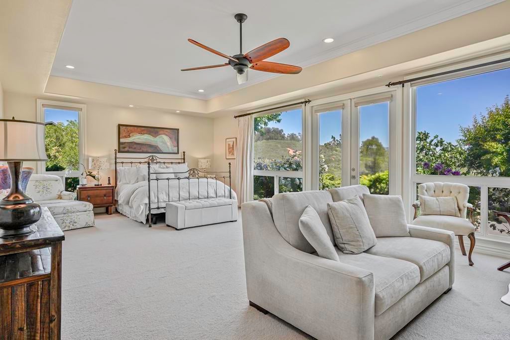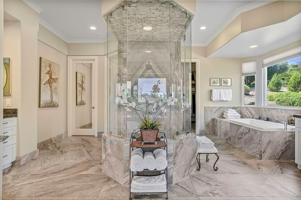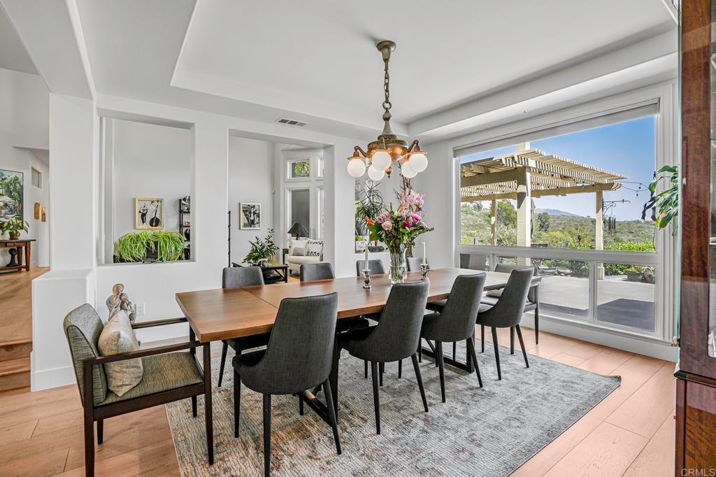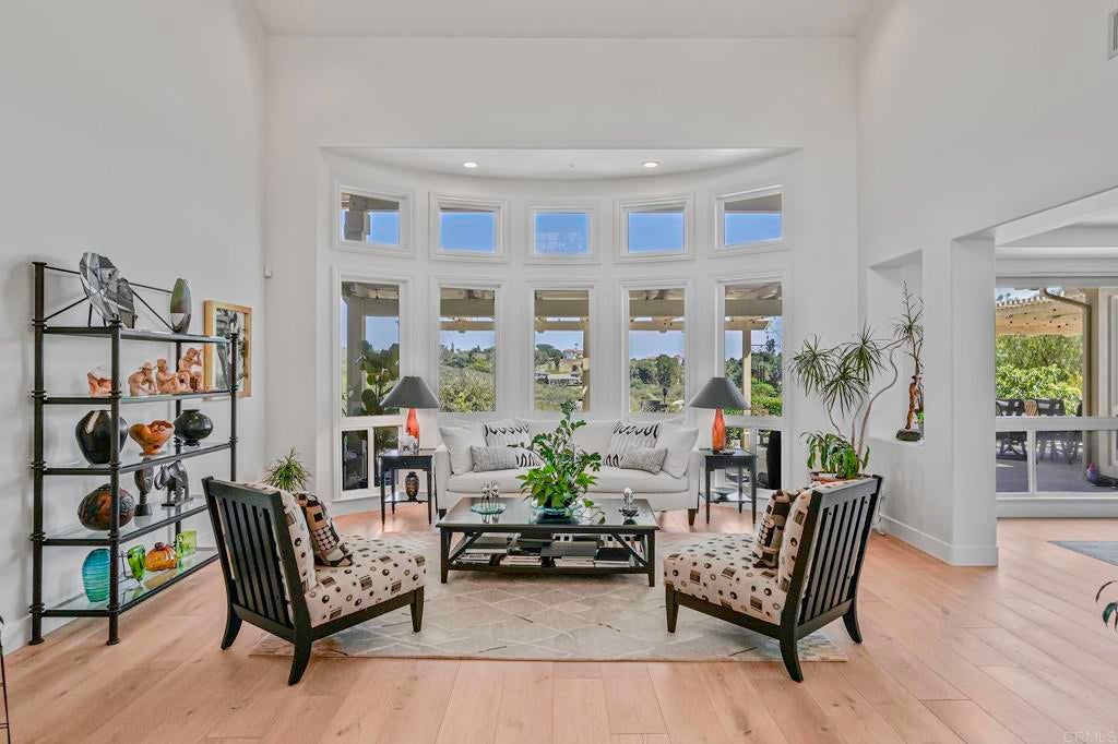 The Basics: 5 Bedrooms | 4 Full Baths | 2 Half Baths | 4,743 Sq Ft Resort-style Pebble Tec Pool & Spa with Waterfall | Pool House | Pickleball Sports Court | Panoramic Views | HOA $146 month. The Vibe: Light, bright, and soaring ceilings welcome you into a home that feels as good as it looks. This home is warm, welcoming, relaxed, and designed for connection — whether you're entertaining or just unwinding. The chef-style kitchen is recently updated and ready for anything, whether you're throwing dinner parties or heating up takeout. Peaceful nature views pour in from almost every room, setting the tone for everyday tranquility. Upstairs, a generous bonus living room makes the perfect teen hangout, media space, or private quarters for guests or a live-in companion. The existing Pool Table can be yours. Three on-suit bedrooms complete the upstairs. The Comforts: Lives like it's a single level — the primary suite and a secondary bedroom are both downstairs. Primary suite is large, comfortable and comes with its own fireplace to enjoy on those cold winter nights. Owned solar keeps your energy bills low, with dual-zone A/C and heating to stay comfy year-round. Waterboy whole-house filtration system, central vacuum system. Additional comfort features include a wine fridge and warming drawer. The Grounds: You’ve got 2 private acres to roam — and it’s all yours. Serve it up on the Pickleball(ish) Sports Court (complete with basketball hoop), then cool off in the vanishing-edge pool or soak in the spa. Rinse off in your very own pool house, then head to the garden house or plan out that future ADU — there’s room for it. Want multiple fruit trees and herbs? Well you’ll have to plant those, but there are roses and a pomegranate tree. Plenty of room to get inspired with your gardening. Horse-friendly and full of possibility. Your Surroundings: Set within a peaceful gated community of manicured homes, you’re surrounded by open space, trails for hiking, biking and/or riding. A strong and welcoming Olivenhain vibe. Award-winning Encinitas school district and just a few miles to a plethora of shops, restaurants and other things to buy.