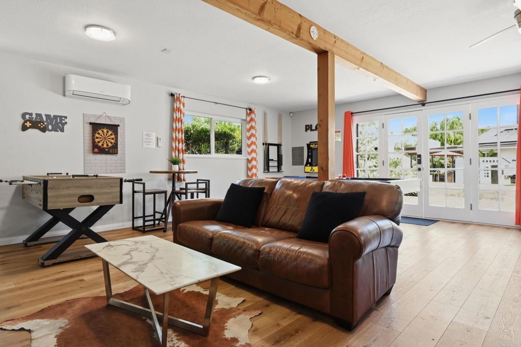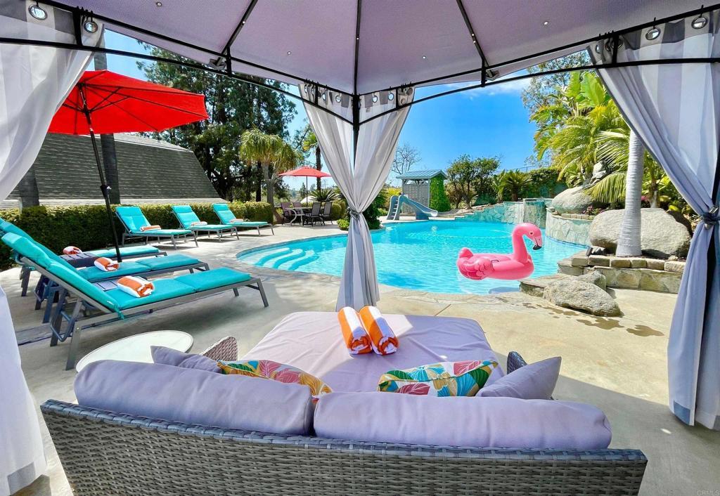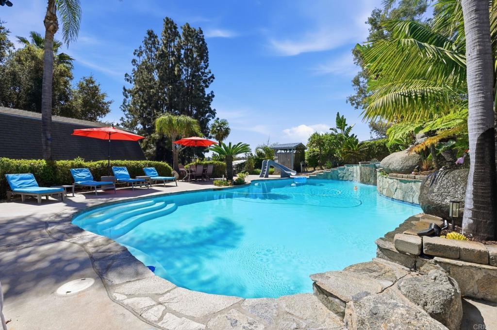 Welcome to your own private resort! Stunning 4 bedroom main house plus a two-story guesthouse on a half acre! Beautifully landscaped property, with multiple areas to lounge, relax and play. The backyard oasis is designed for effortless indoor-outdoor living and entertaining. A sparkling pool with jacuzzi and waterfall is surrounded by a beautiful flower garden and tropical trees. The outdoor BBQ grill island is ideal for hosting memorable meals. The interior is a mix of charming vintage features paired with modern, designer touches. The adorable "barn" guesthouse offers an additional 800 sq ft of living space, equipped with a kitchenette, large bathroom and a large loft bedroom. This property has been completely updated with new solar panels, new ceiling insulation, pool automation, fresh exterior paint, all bathrooms have been recently remodeled, new pool plaster and added jacuzzi. This property has been rented as a highly-rated vacation rental, so it has been set up with smart home features - with app control. It has been meticulously cared for and maintained. The possibilities with this property are endless. Additional storage behind the guesthouse provides room for a boat or RV, with an access road currently used as a basketball court. With no neighbors directly behind the property, the setting feels exceptionally private and serene.