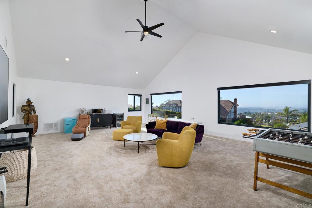 Give yourself a gift and watch your body and mind take a break from the world as you enjoy the sanctity and beauty of your 5-bedroom/4bath private country club. Situated on a hill in the sought after hamlet of La Costa Estates overlooking the city of Carlsbad and a view of the Pacific Ocean. Only a short 15-minute drive to the beach or 24-minute bike ride. Your very private garden patio of fruit trees and wildflowers will start your transition. Take a dip or do your morning laps in our beautiful heated pool or soak those muscles in our outdoor hot tub, day or night. Putt around on your 3-hole putting green and then warm up around your fire pit and listen to the sound of the crackling fire and variety of birds. For your weekend festivities don’t forget lighting up your Chargrill grill smoker for amazing cookouts or your gas fired outdoor pizza oven for homemade pizza’s-we supply the special 00 flour imported from Italy. Inside your newly renovated majestic home you enter through an 8 ft glass pivot door that leads to an elegant curved wrought iron staircase. We start on the first floor your cook’s kitchen fully equipped with a double oven, gas stovetop and professional Vent-a-hood for when you sear a steak. A large natural stone island for prep and seating with more than enough storage underneath and a spacious walk-in pantry. A kitchen slider window that fully opens up to the patio for easy access to your poolside outdoor dining. Adjoining the kitchen is a TV room den so you can keep an eye on your cooking while watching a cooking show, mounted above one of your three fireplaces. Next to the den, a laundry room with a convenient laundry chute from the second floor, and a full bathroom and shower for entry from the pool or beach. Adjacent is entry to your 2-car garage which has a new tankless water heater, an additional standard size refrigerator for food storage and an electric car charger. We provide beach supplies including boogie boards, beach umbrella, beach chairs and a portable grill. Walk to the next room you will be in the dining room with a 12’ picture window that brings in the morning sun and the views of your beautiful garden and pool. Moving along on this floor you step down in to the living room with the 2nd fireplace and a lovely seating area next to picture windows of your putting green and fruit trees. The main floor also has a sun-drenched office or can be used as an extra bedroom. On the 2nd floor, adjacent to the beautifully designed secondary bedrooms with a Hollywood Jack-n-Jill bath and walk-in closets is a fully equipped mirrored fitness room with stationary bike, treadmill, free weights, workout bench and a speed bag. The next room is the “ginormous” 16ft vaulted ceiling Game Room with foosball, card table, closeup 4K projector with built in streaming apps and a 100” viewing screen. A heated massage chair is also provided, a mini fridge, espresso and pod coffee machine, wine cooler and microwave so you don’t have to leave the room during the big game or your favorite series. The “OMG” of this room are the oversize picture windows and wireless controlled shades that close to watch your shows or open up to incredible vistas of the Pacific Ocean and a majestic mountain range. If you are an airport aficionado, you can watch planes take off and land at the distant Palomar airport. Next, you go through the French doors to the primary bedroom suite. This large suite includes privacy power shaded windows, marble tiled floor, standalone large shower, pedestal bathtub with vista windows, a double vanity and wardrobe closet. In the primary bedroom you walk past another fireplace and large walk-in closet to the king size bed and a projector with amazon firestick for streaming all your shows. Open the sliding French door and walk out to a beautiful terrace sitting area overlooking your patio. Enjoy your morning coffee, watch the hummingbirds do their dance among the fruit trees and flowers as the sun rises.